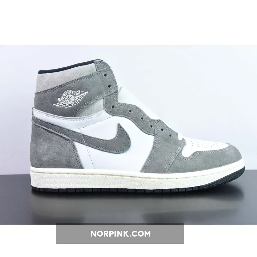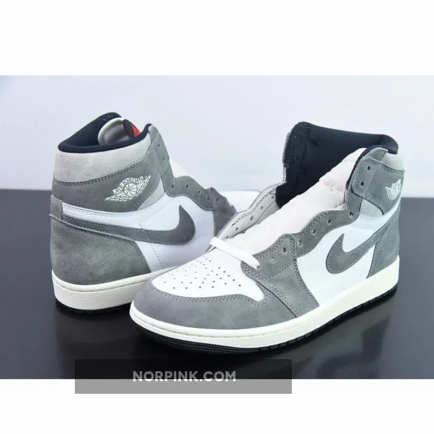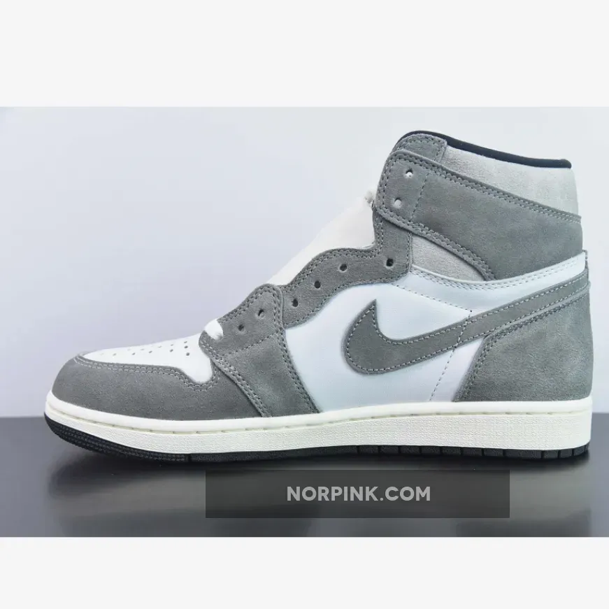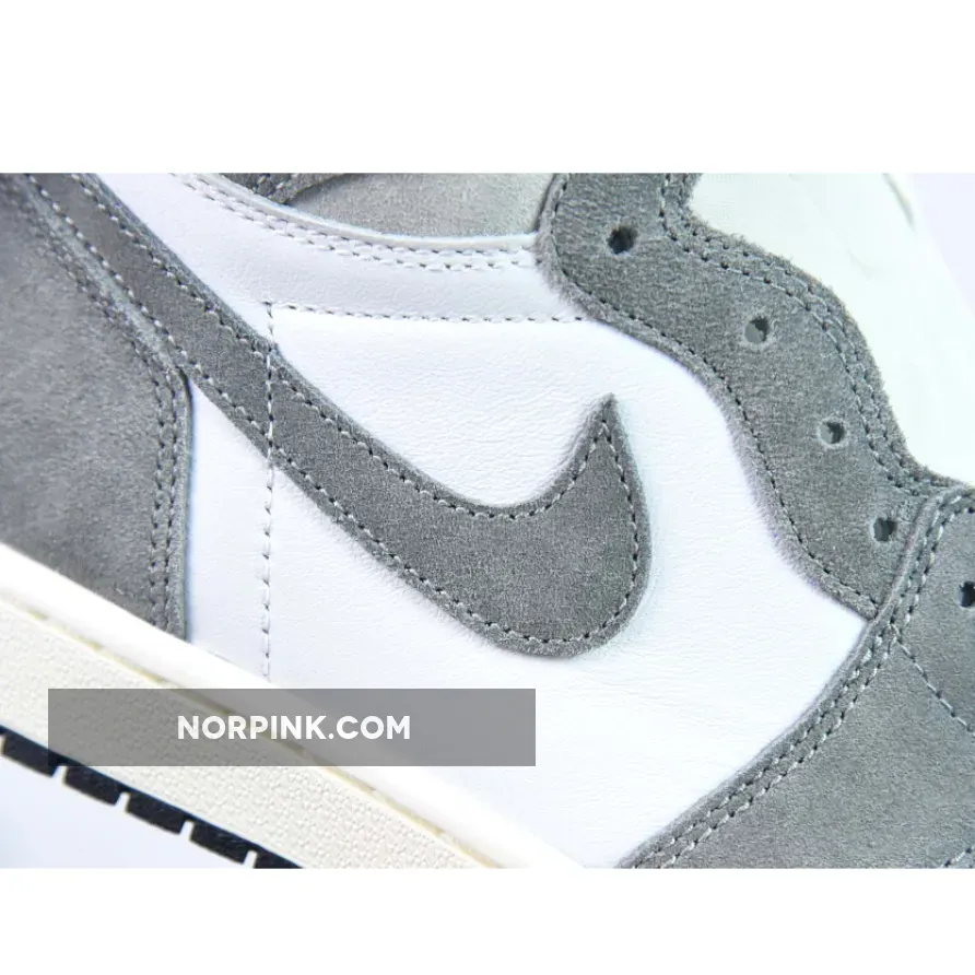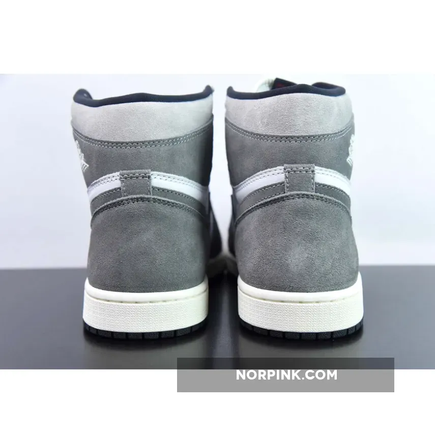 This Air Jordan 1 features a Black, Fire Red, Light Smoke Grey, and Sail color combination. Going over the shoes, they feature White leather on the base while Black washed suede, which looks Grey, adorns the overlays with a classic white Nike Swoosh adding a touch of contrast.