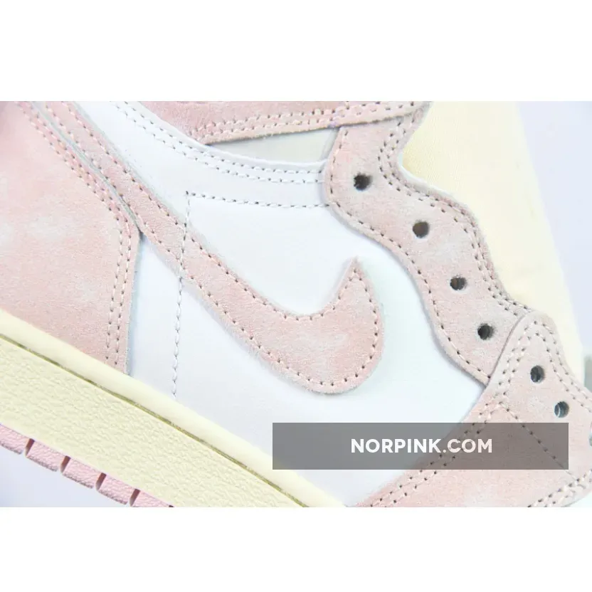 This Air Jordan 1 Atmosphere/White-Muslin-Sail the high-top flaunt a white leather upper with the highlight pink washed overlays across.