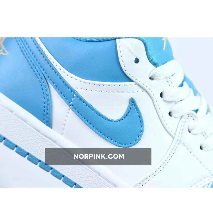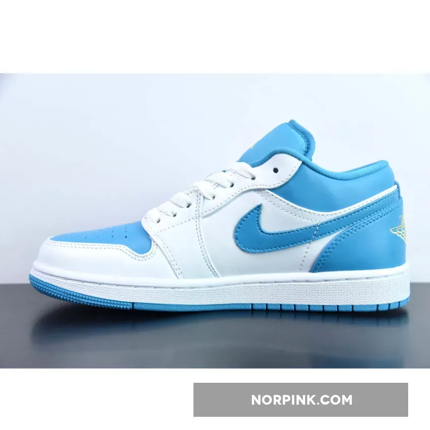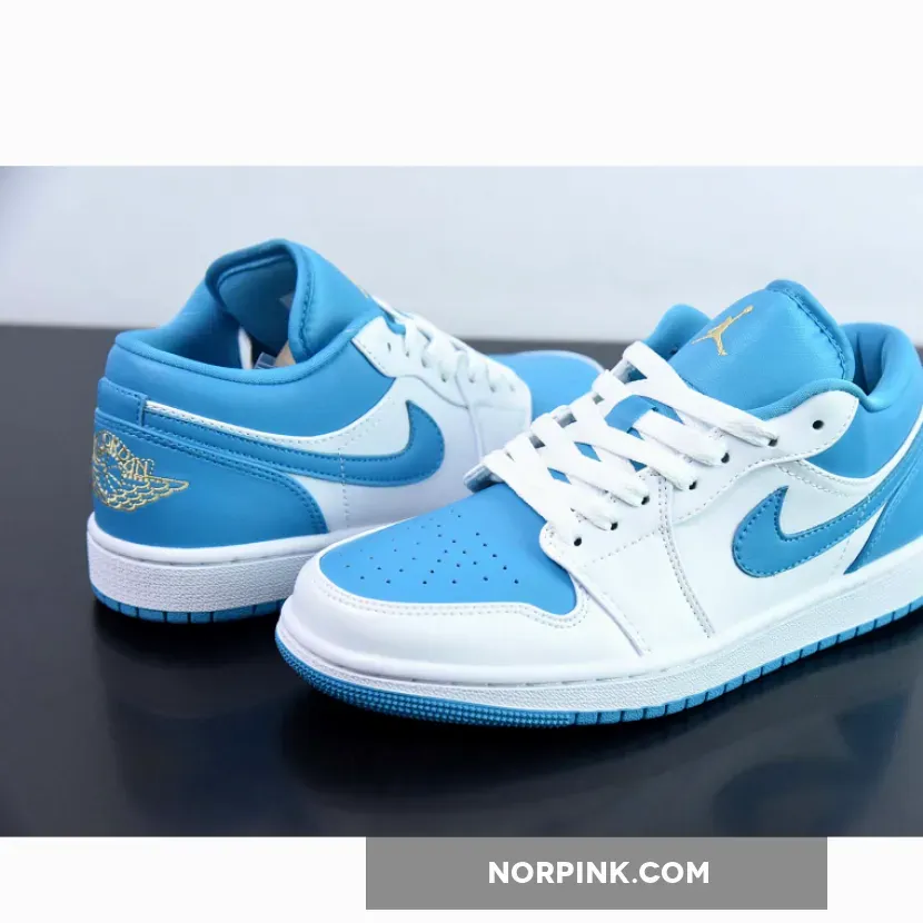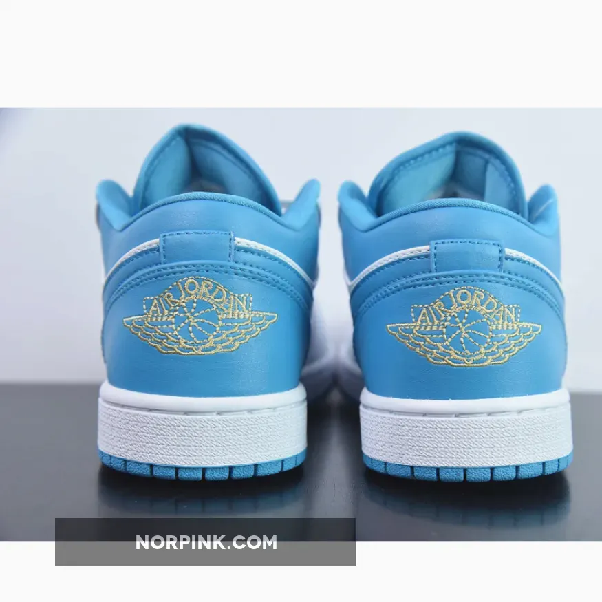 Dressed in a Aquatone, Celestial Gold, and White color scheme. This offering of the Air Jordan 1 Low comes constructed in a full leather build with mesh tongues and lining. It features a White and Aqua base with Gold branding.
