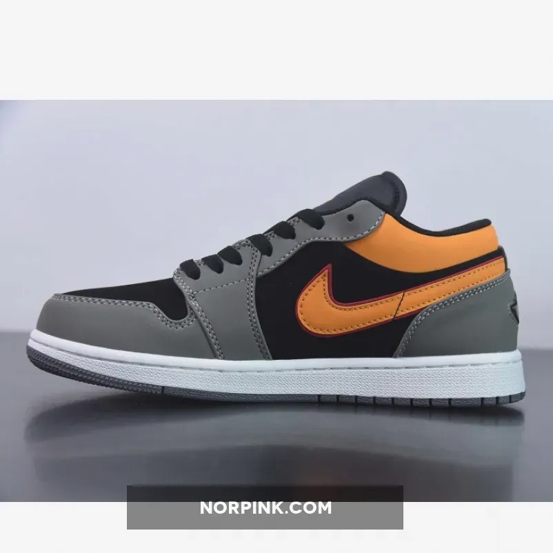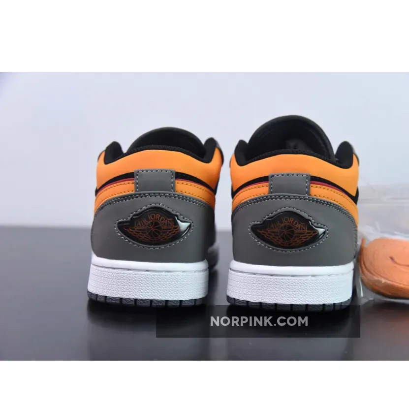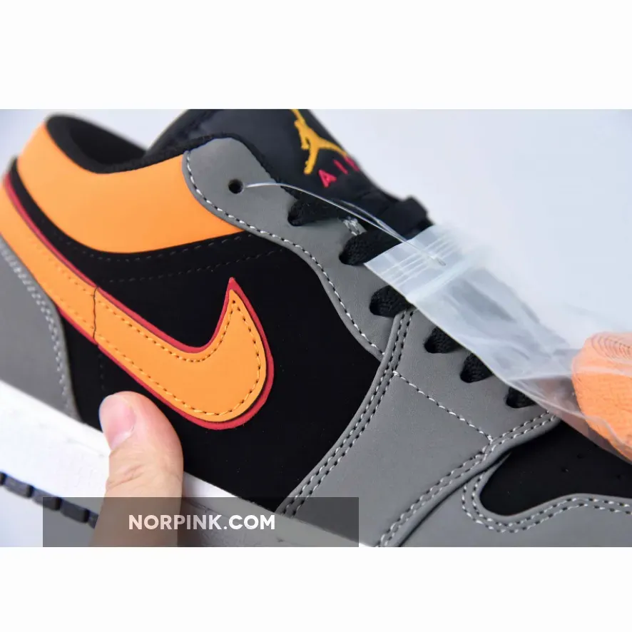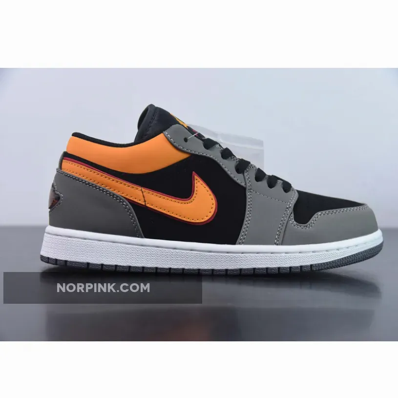 Done in an official color scheme listed as Black, Vivid Orange, Light Granite, Cardinal Red, White, this new iteration of the Air Jordan 1 Low is constructed in a mix of nubuck and leather alongside mesh used on the tongues and inner lining.