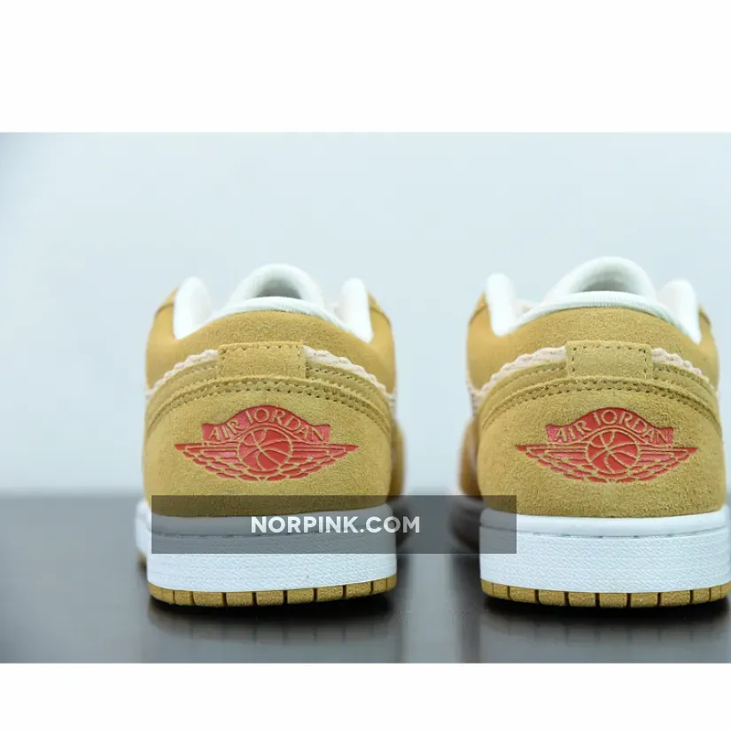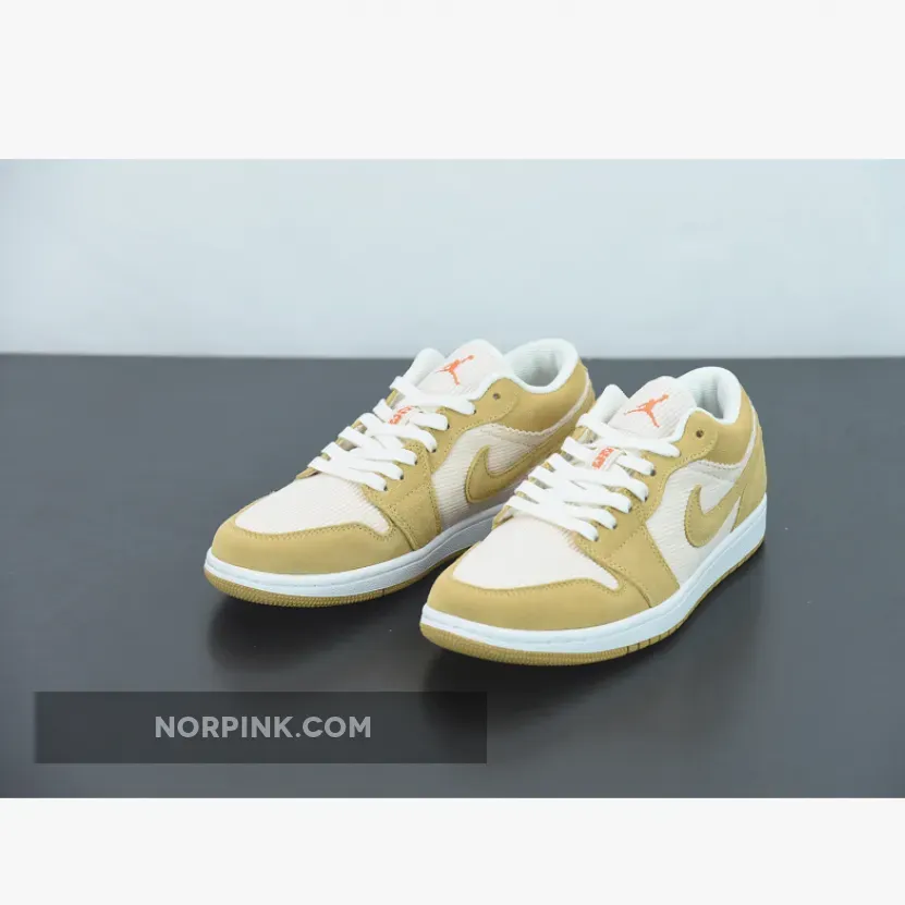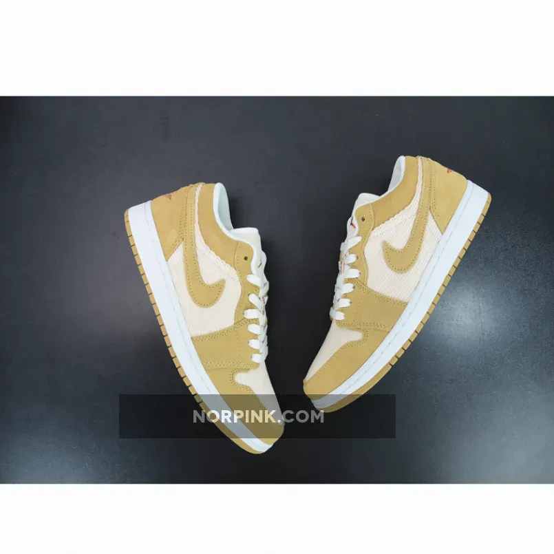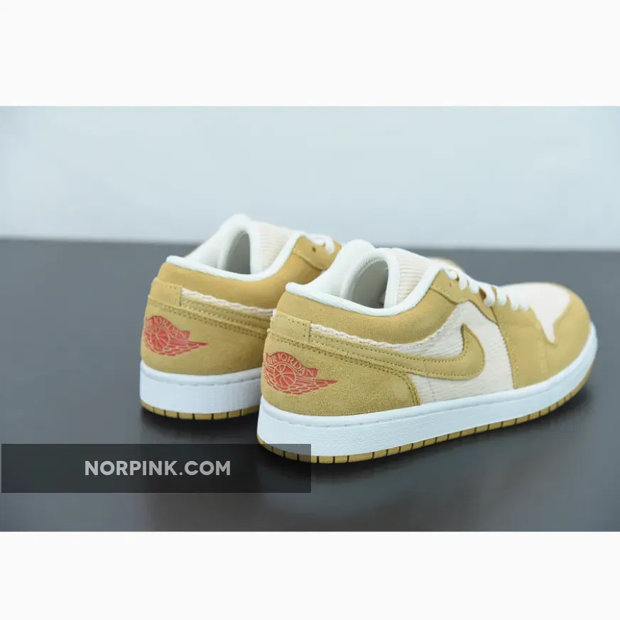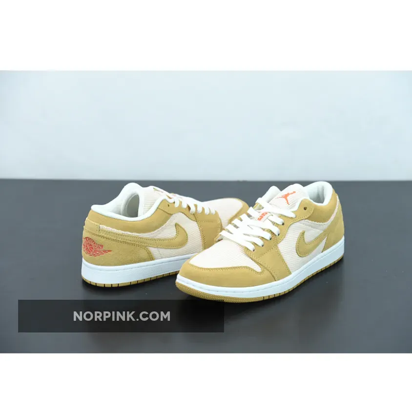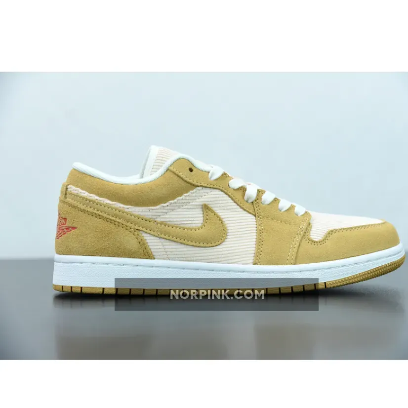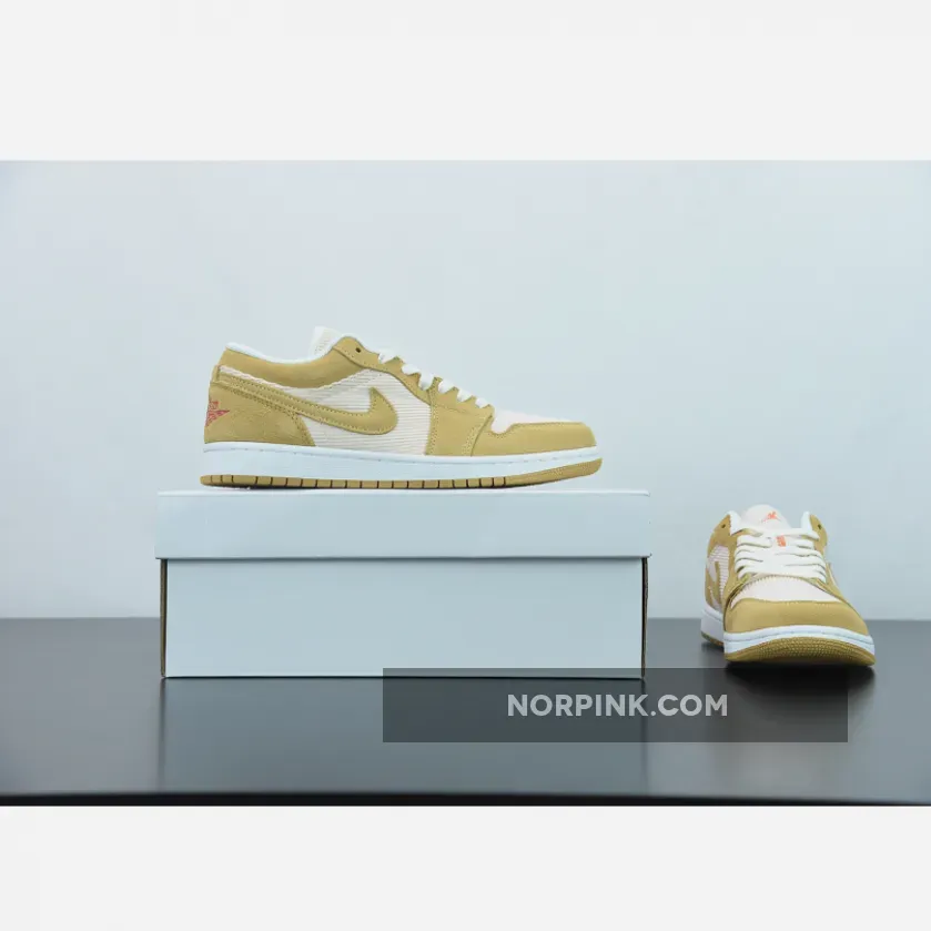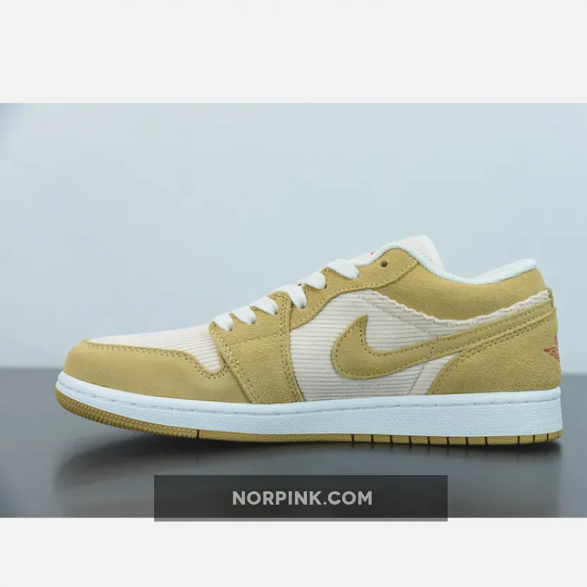 This offering of the low-top Air Jordan 1 features a corduroy material used as the base paired with Tan suede overlays and Swooshes. An Orange hue is used on the branded areas completed with a White midsole and Tan rubber outsole.