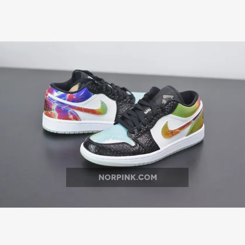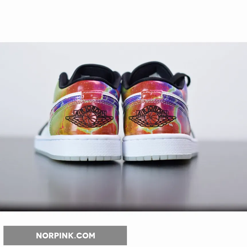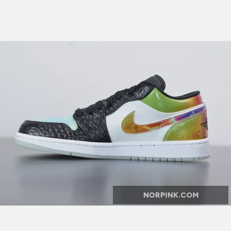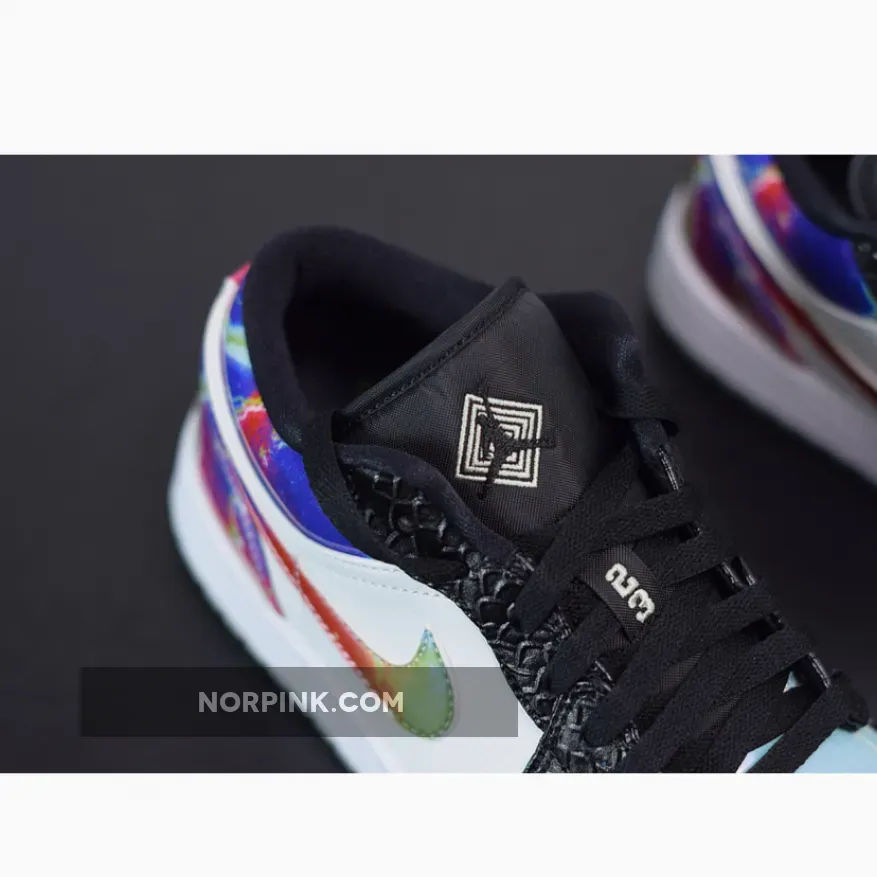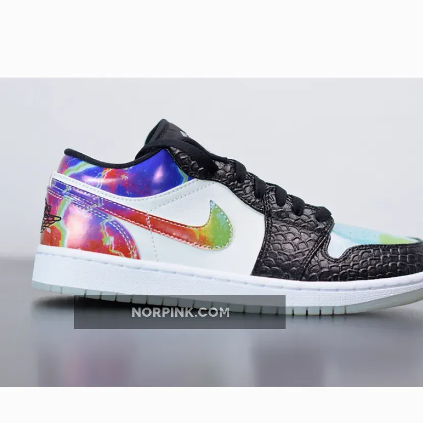 The Air Jordan 1 Low “Galaxy” is constructed from mismatched panels featuring faux black snakeskin leather, hi-gloss galaxy prints, colorful palates, and glow-in-the-dark soles. The black snakeskin dresses the toe and eyelets, while black nylon crafts the tongue and liners. “Galaxy” prints highlight the Swoosh insignia, heel overlay, and collar, while the perforated toe box is dressed in blue watercolor. To finish it all off, special branding marks the tongue tab and insoles, while glow-in-the-dark materials make up the outsole.