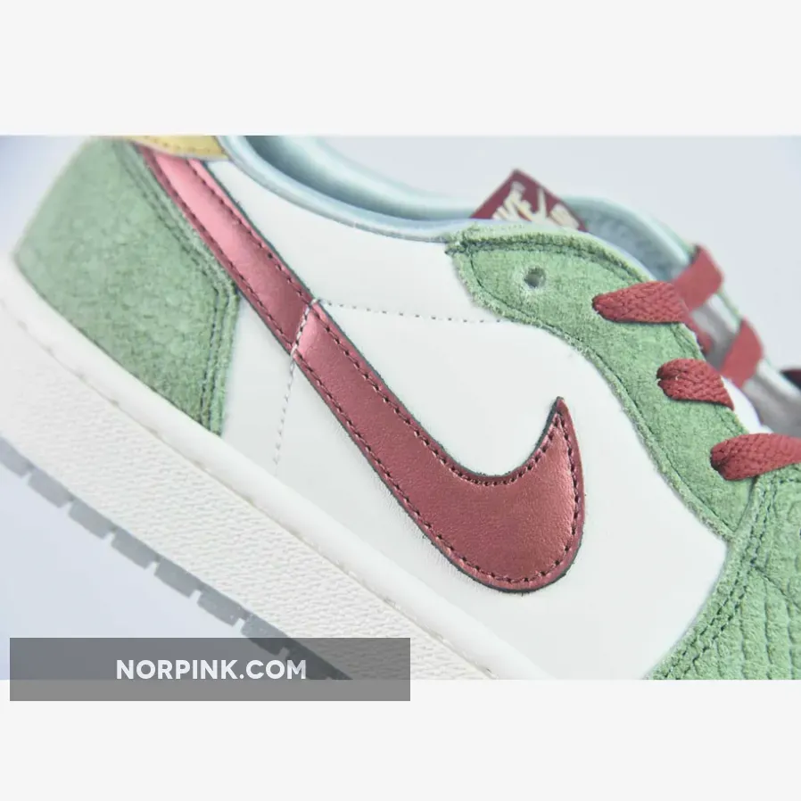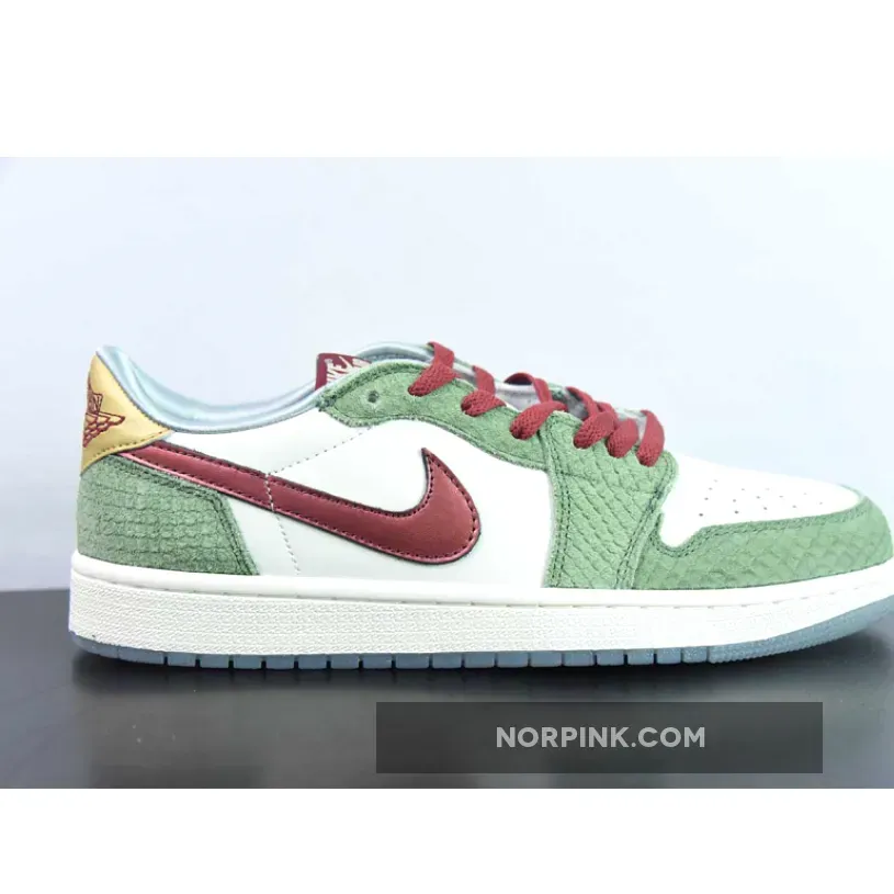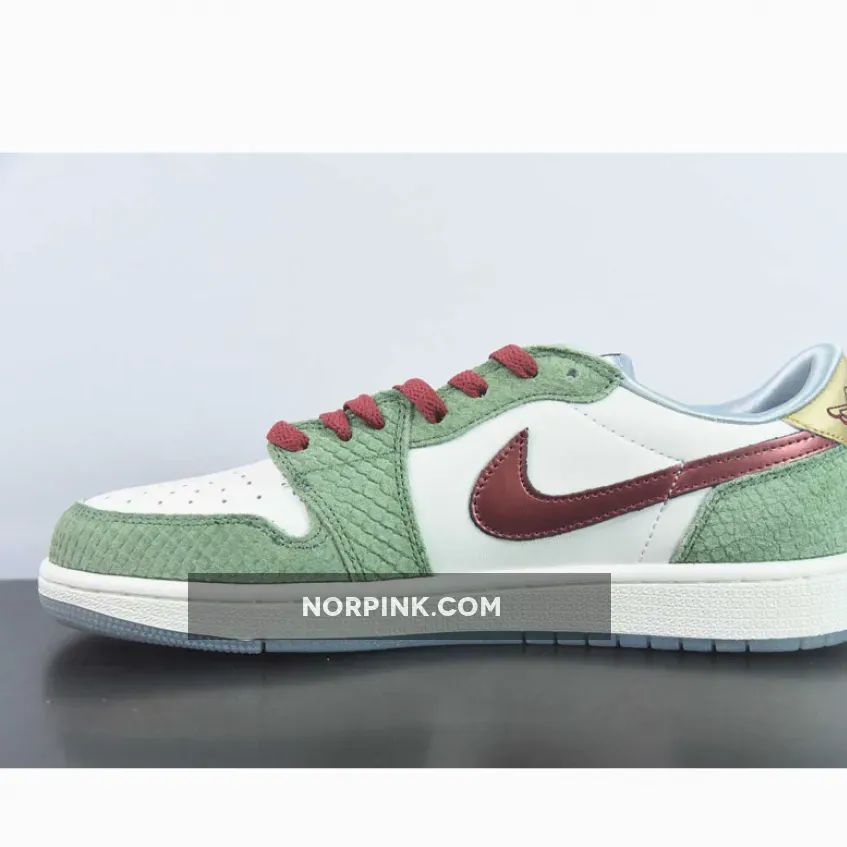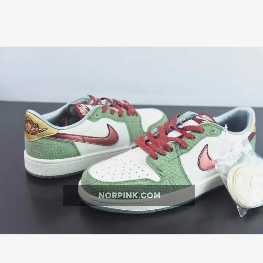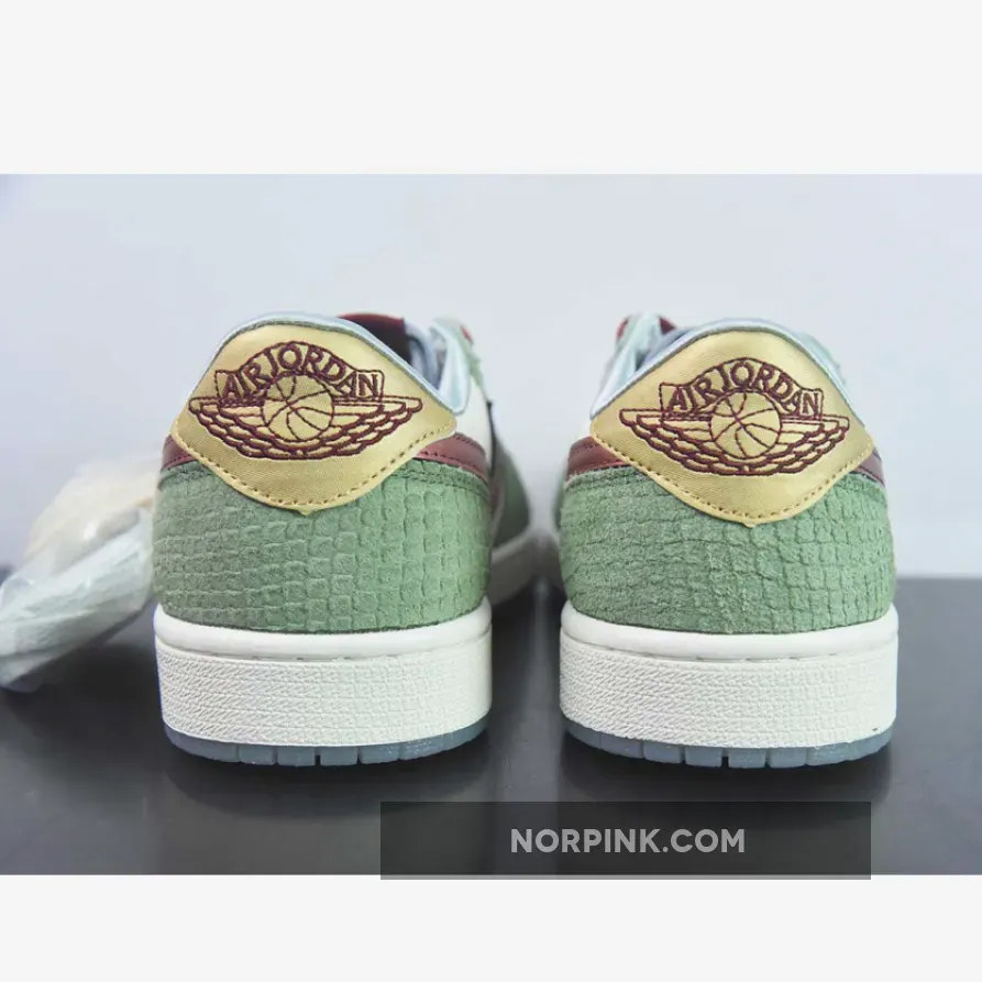 The Air Jordan 1 Low “YOTD” boasts a captivating palette that blends Sail, Cedar, Oil Green, Light Pumice, and Dark Team Red hues. the upper sports a “Sail” leather base that complements the “Oil Green” scale overlays that span from the mudguard to the heel counter. Adding a dash of contrast, Dark Red accents grace the Swooshes, embroidered Wings logo found on the Golden heel tabs, “Nike Air” tongue labels, and a set of laces. Inside, a refined Light Grey satin lining exudes elegance, all set atop a pristine White midsole, which meets the ground with a Green rubber outsole. Key thematic details round out the look courtesy of the sockliner, inside of the tongue and a celebratory red envelope. As a final touch, this extraordinary pair comes packaged in a special Year of the Dragon-themed box.