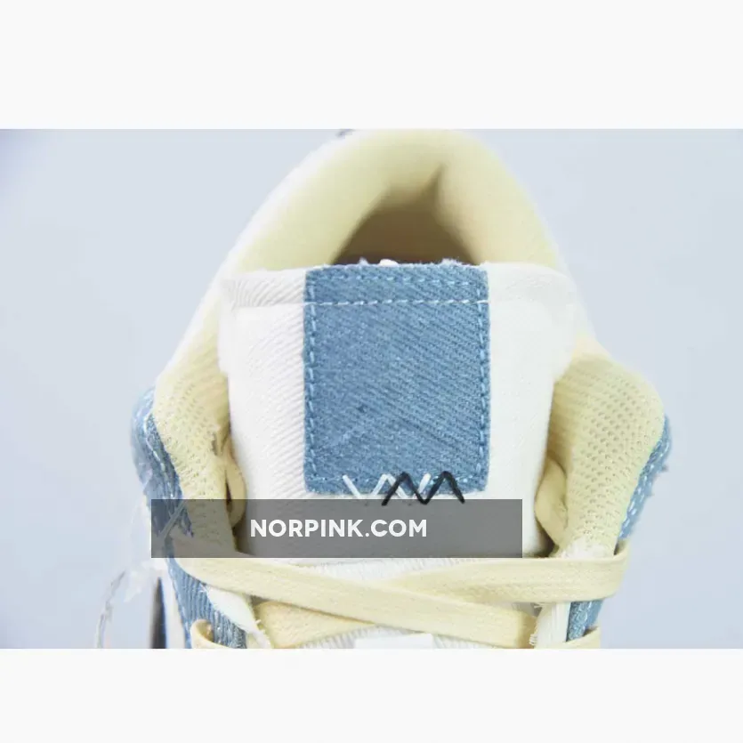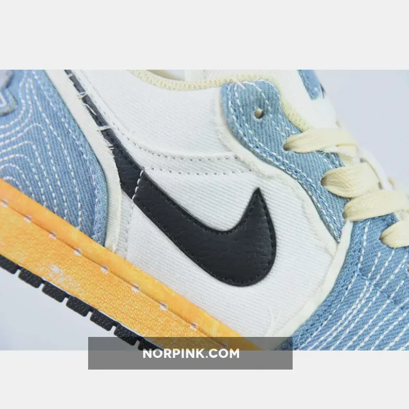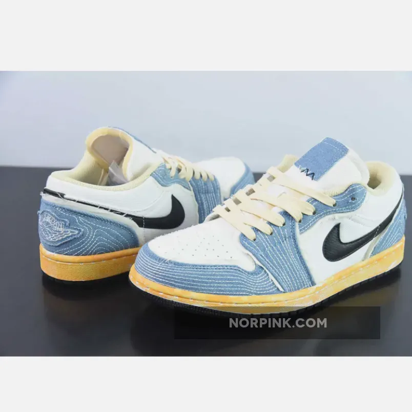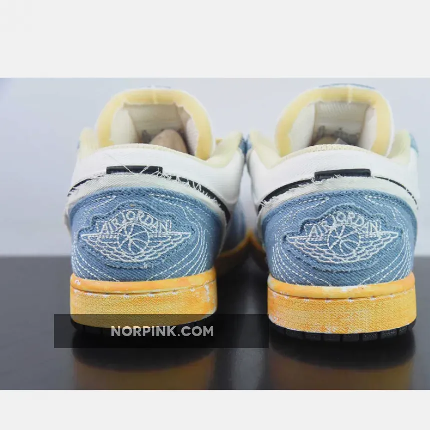 Once more paying homage to the traditional Japanese craftsmanship, the Air Jordan 1 Low Sashiko is given an aged aesthetic made up of a White canvas base with distressing and wear denim fabric overlays taking care of the the toe box, forefoot, eyestay, and heels with frayed edges.
