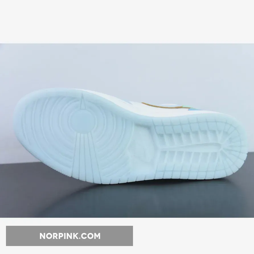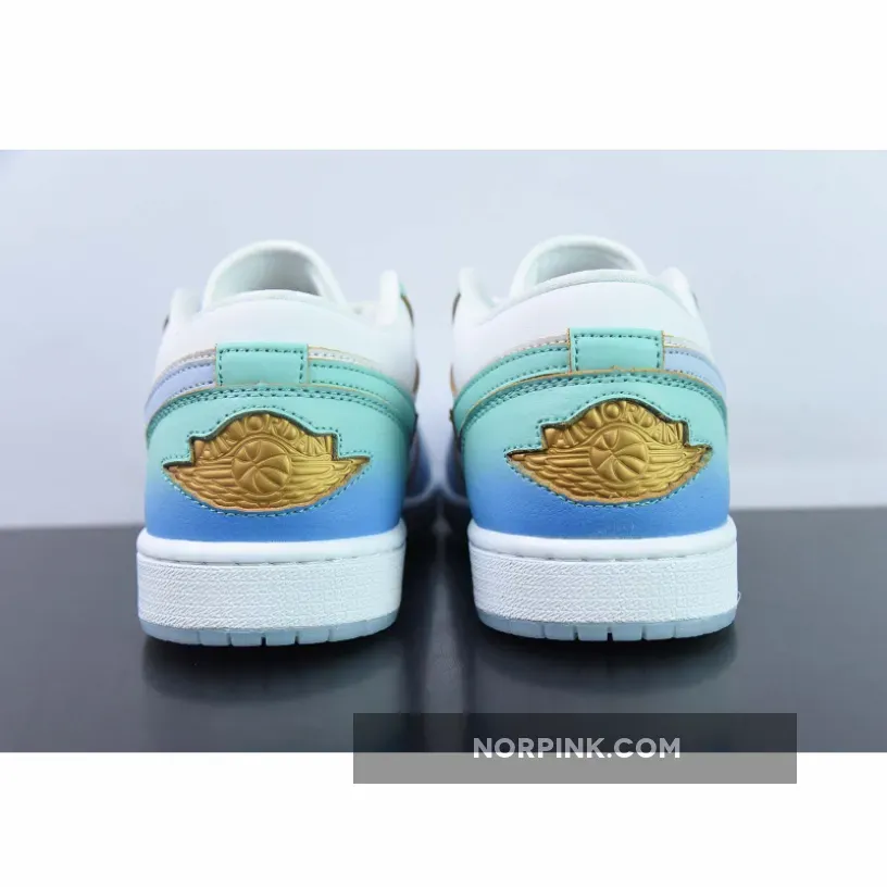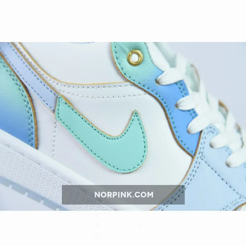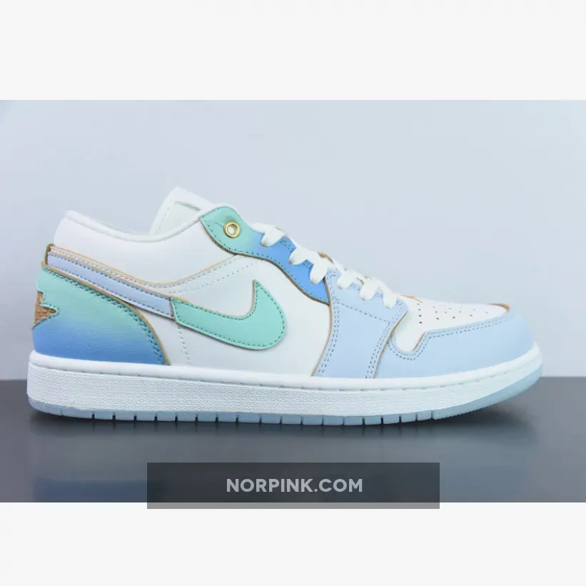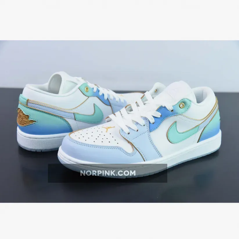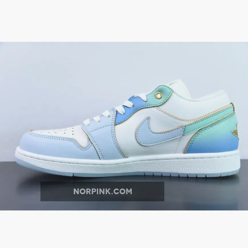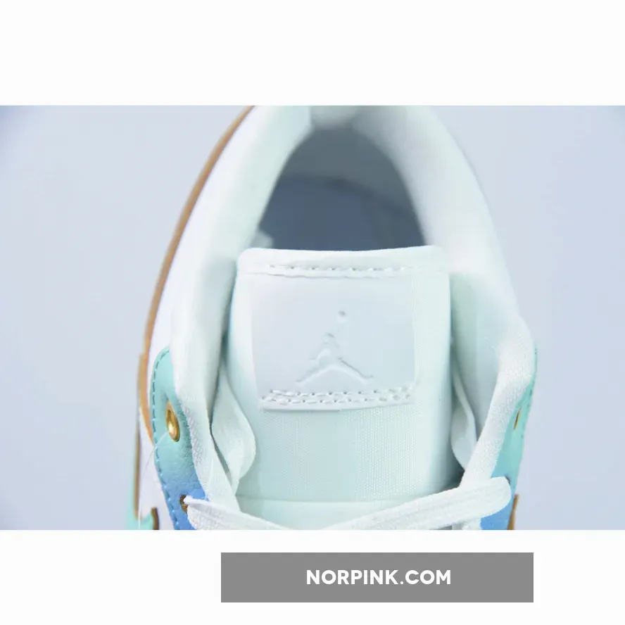 the Air Jordan 1 Low comes dressed in a White, Emerald Rise, Football Grey, Ice Blue, and University Blue color scheme. The sneaker blends smooth and tumbled leather materials, along with mesh tongues and a soft sockliner. The base has a “White” leather exterior paired with tumbled leather overlays. The eyestay and heel counter are painted with a gradient finish that fade from turquoise to mint. Finishing details include a Gold Jumpman logo on the vamp, a Wings logo on the heel, a White midsole and icy translucent outsole.