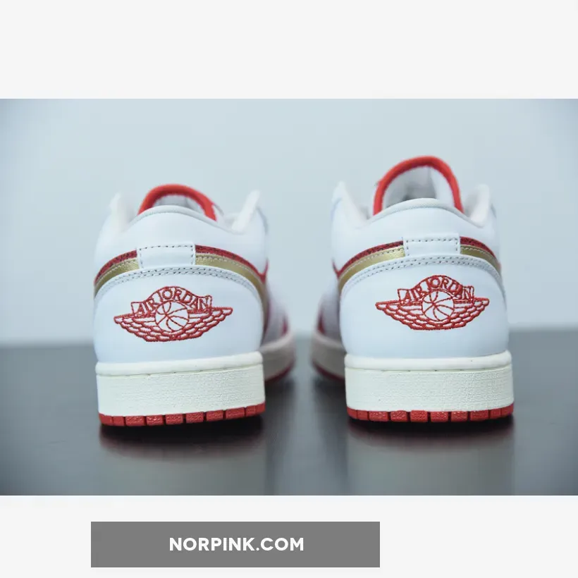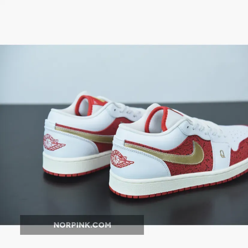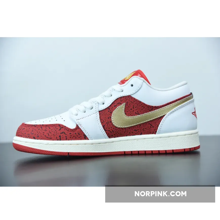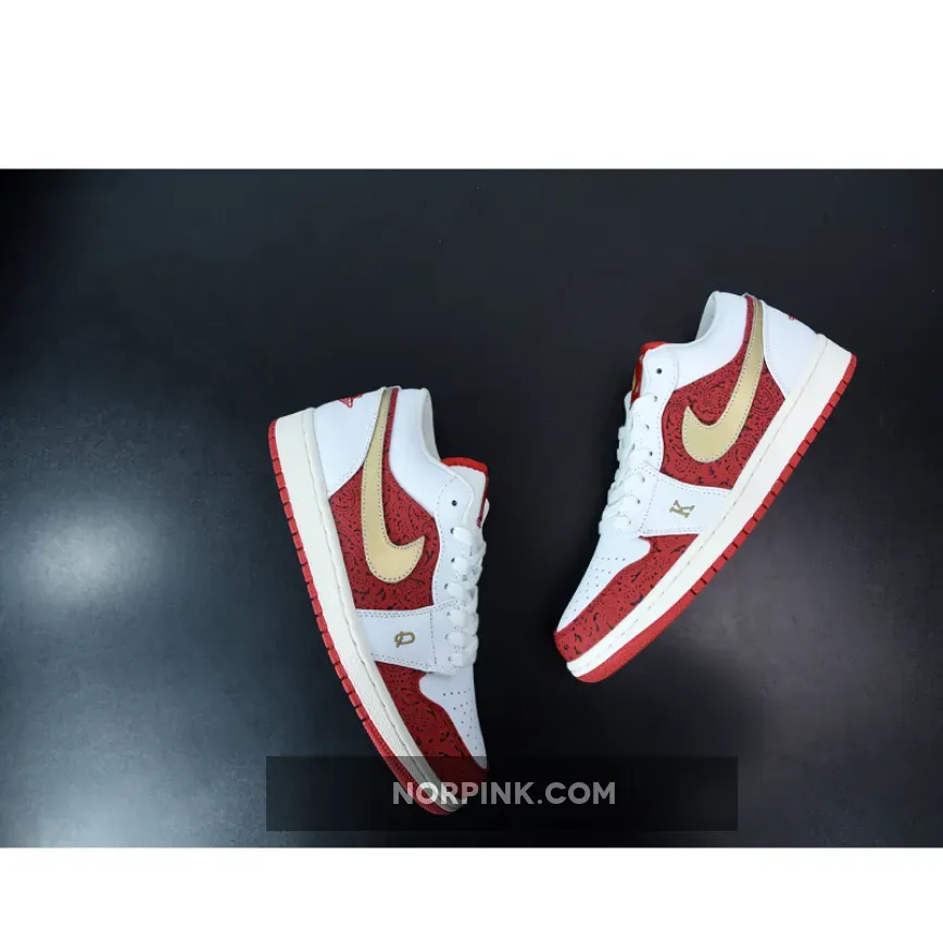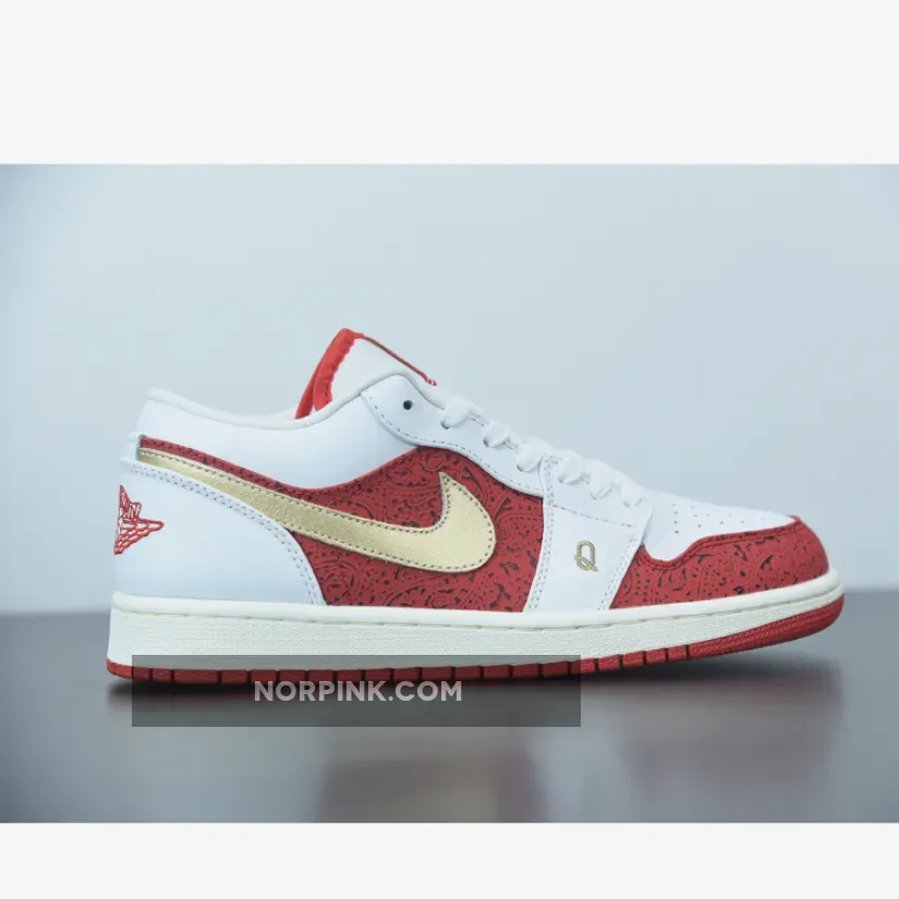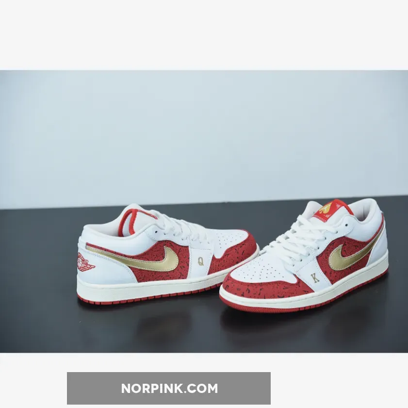 This offering of the low-top Air Jordan 1 features a White leather base with paisley prints debossed into the toe overlays and mid panels. Metallic Gold covers the spade-branded tongues, Swooshes, and the letters “K” and “Q” embroidered onto the lateral heels nodding to the King and Queen face cards. A White midsole atop a Red rubber outsole completes the design.