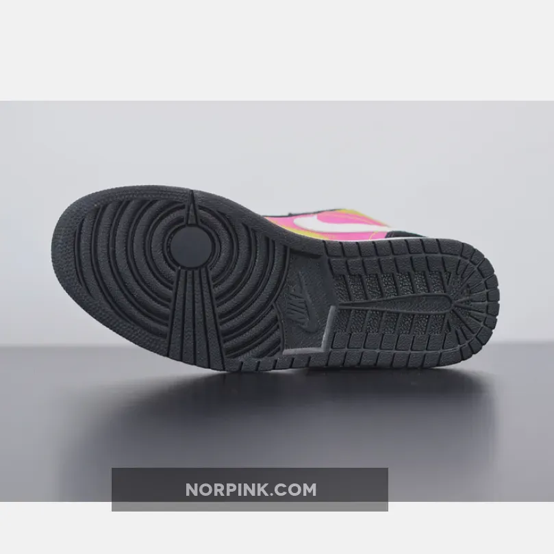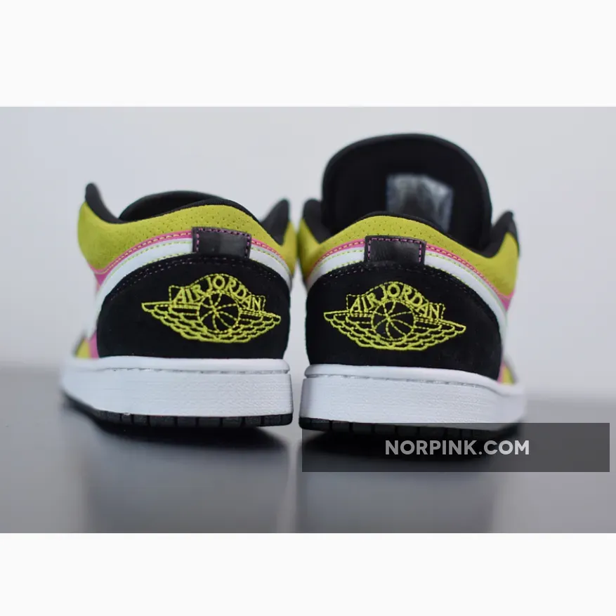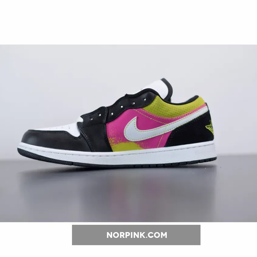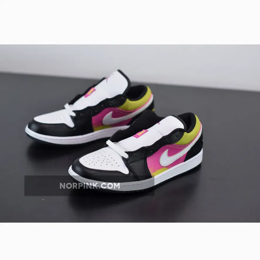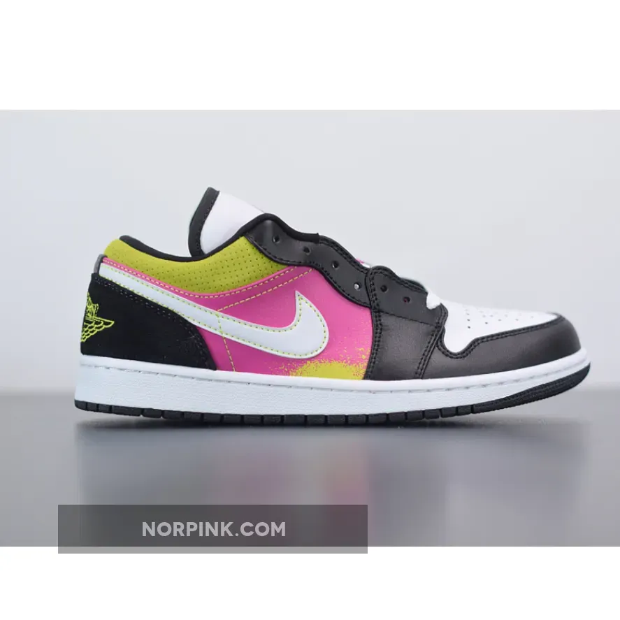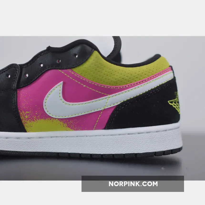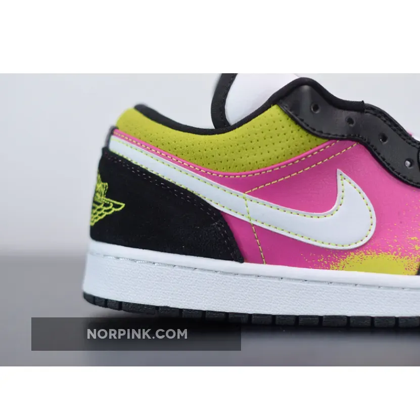 the latest pair of Air Jordan 1 Lows constructs of a relatively ordinary base and accents extremely quietly with spray paint splatter. Seen only across the lowermost side profile, the pair blocks much of the neon yellow treatment with glossy black overlays, details that extend frontwards across the toe cap and back along both the eye stay and heel wrap. Pink hits then switch up the white base coat seen at the vamp and tongue, wrapping around with bright swooshes atop and perforated yellow suedes just adjacent.