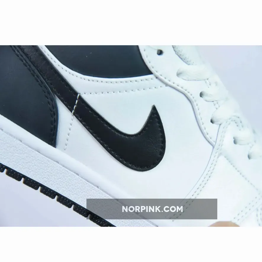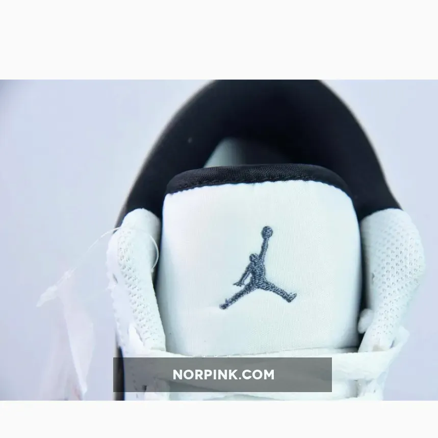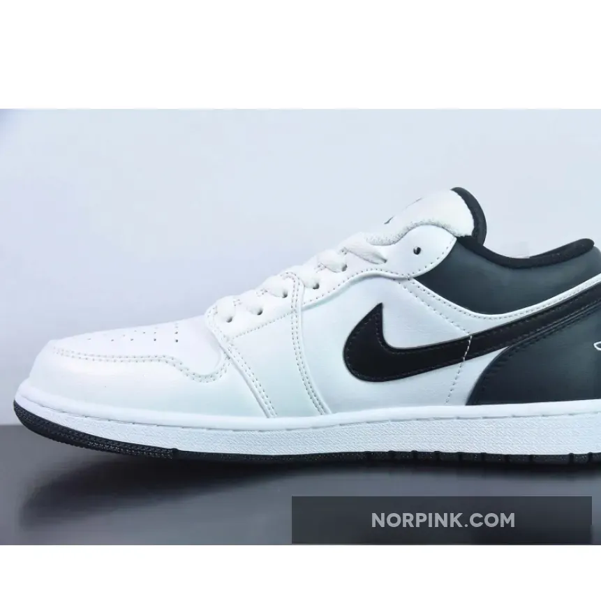 this Air Jordan 1 Low is primarily covered in white leather with contrasting black accents on the back half.Smooth white leather gracefully wraps around the toe box, mudguard, eyestays, and quarter panel.