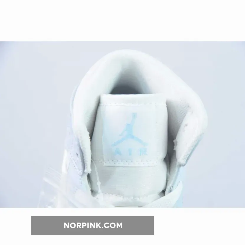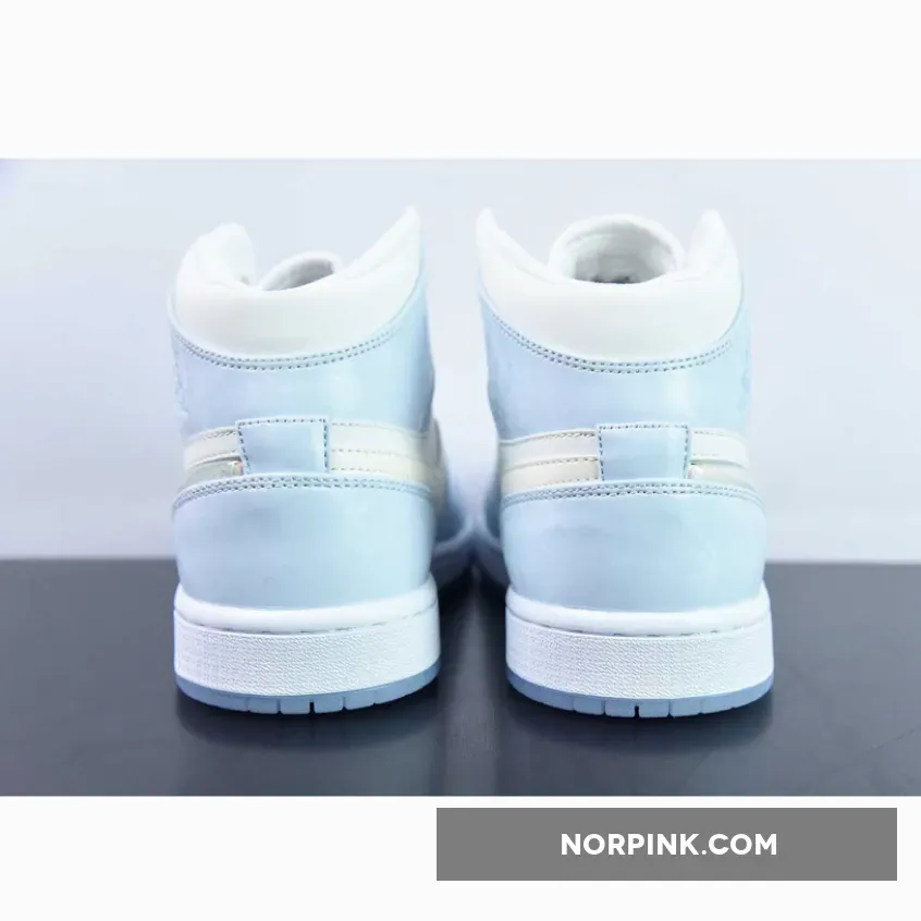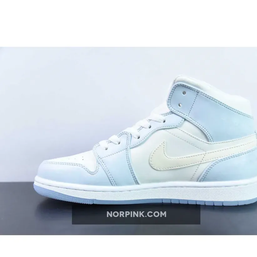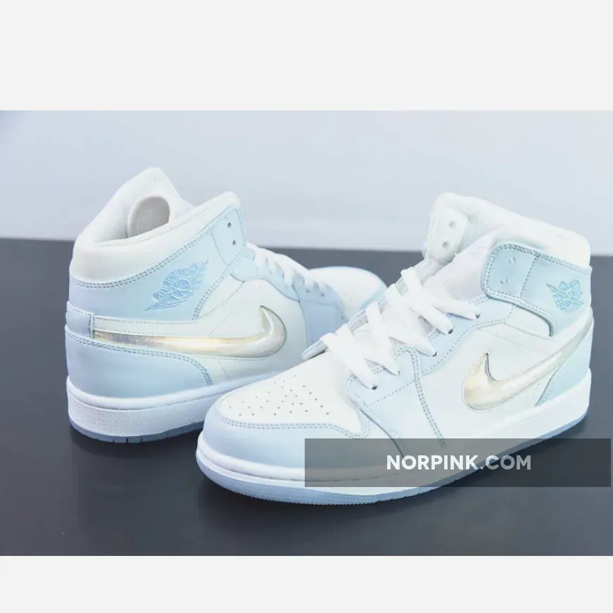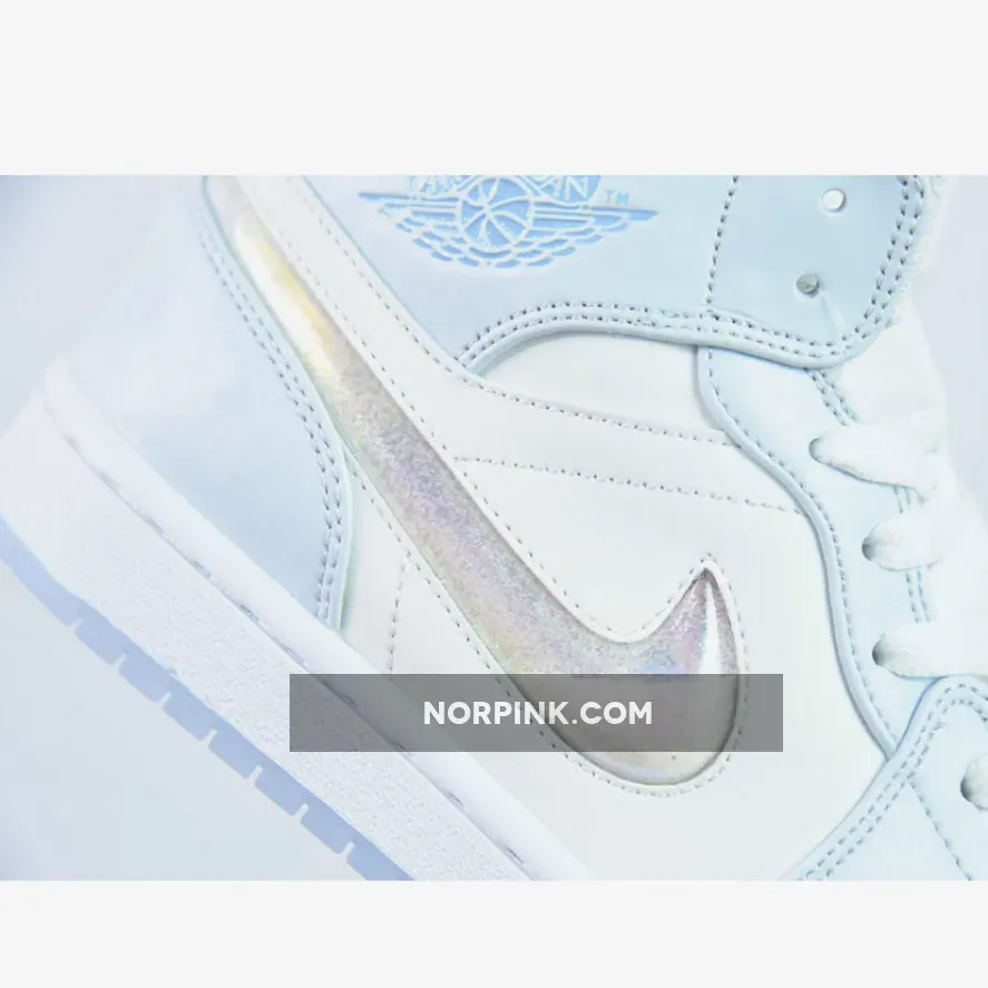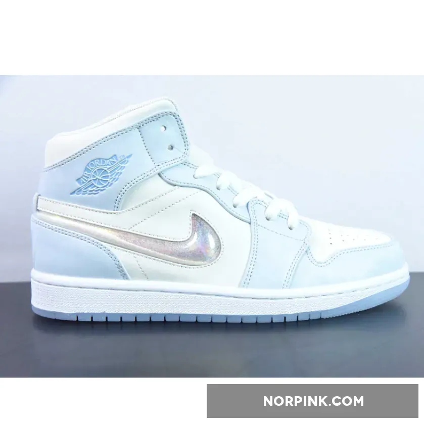 The Air Jordan 1 Mid sports a full leather construction that enhances comfort and durability. It incorporates toe box perforations for increased ventilation, mesh tongues, and a soft inner lining. Its foundation is a crisp White hue, while Light Blue accents adorn the overlays and branding on the ankle flaps and tongues. The recognizable Swoosh logo is prominently displayed once more, and this time it has been reimagined with a glitter-covered jelly sheen. This dazzling insignia on the Mid mirrors a beguiling palette of hues, making certain that every stride draws the eye as well as inspiring a sensation of amazement and ecstasy in the wearer.