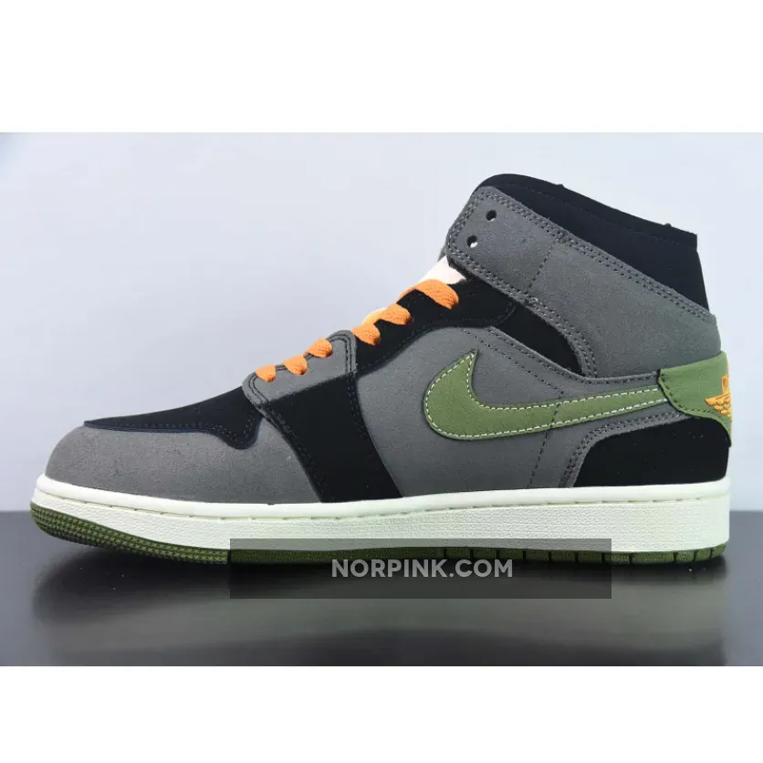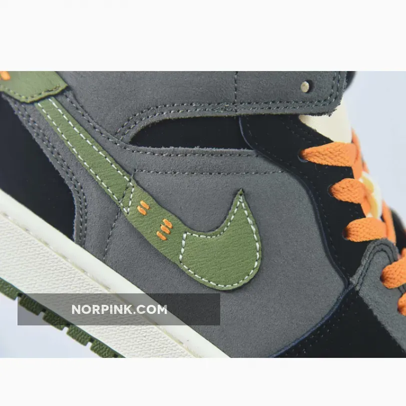 Exploring a pitch-dark composition illuminated by jack-o-lantern hues, the suede and nubuck dominant upper extends jet-black and dark grey panels throughout. Light Olive takes center stage on the leather Swooshes, heels, and rubber outsole, providing a striking contrast. Bright Orange laces and a Wings logo in the rear add an extra pop of color.