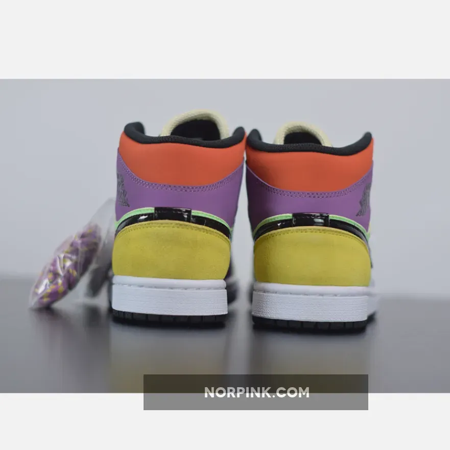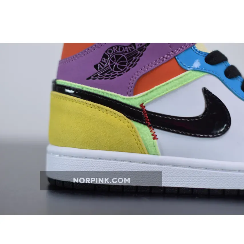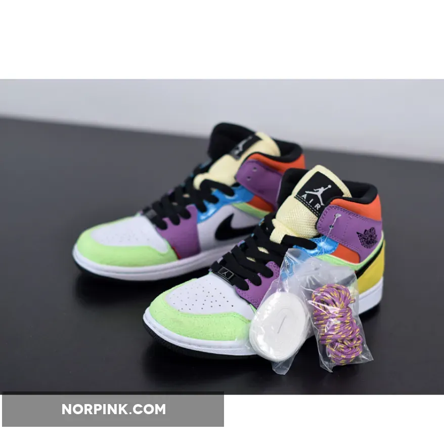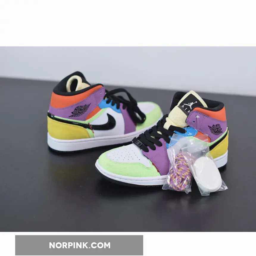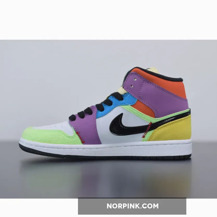 The Jordan 1 Mid SE Multicolor is a brand-new iteration of the classic Nike Air silhouette that has been a huge success since its introduction in 1985 alongside the high and low top versions. The Air Jordan 1 was Michael Jordan’s first ever signature shoe with Nike, and is often regarded as the best shoe of all time. This brand new rendition dresses the AJ1 Mid in a multi-coloured and vibrant look that’s sure to turn a few heads on the street. A combination of construction materials make up the uppers including leather, synthetics and hairy suede. Green, purple, orange, yellow and blue all feature here, with a white base layer housing features such as the black Swoosh that’s stitched onto either side. Classic AJ1 features such as the perforated toe box and wings logo are present as ever, while Jumpman branding is embroidered onto the tongue.