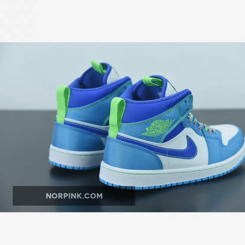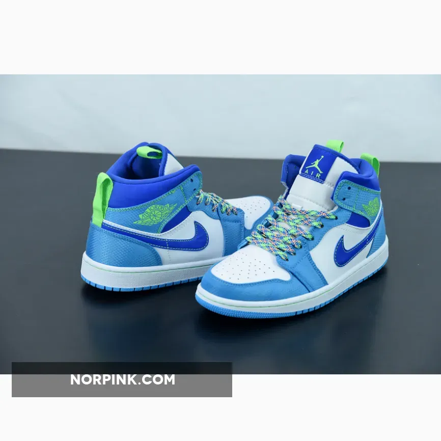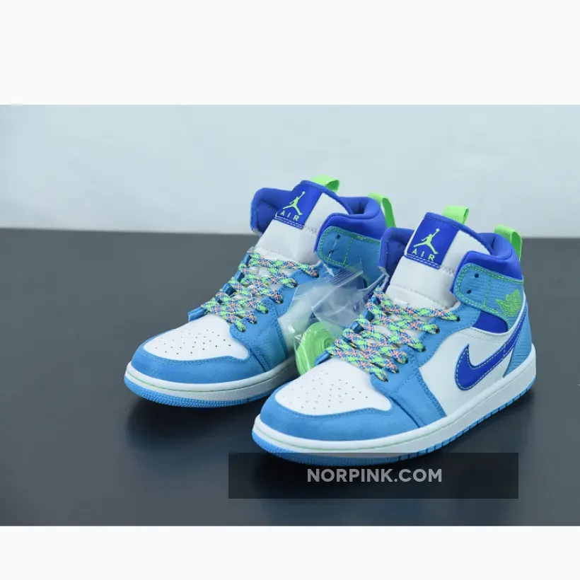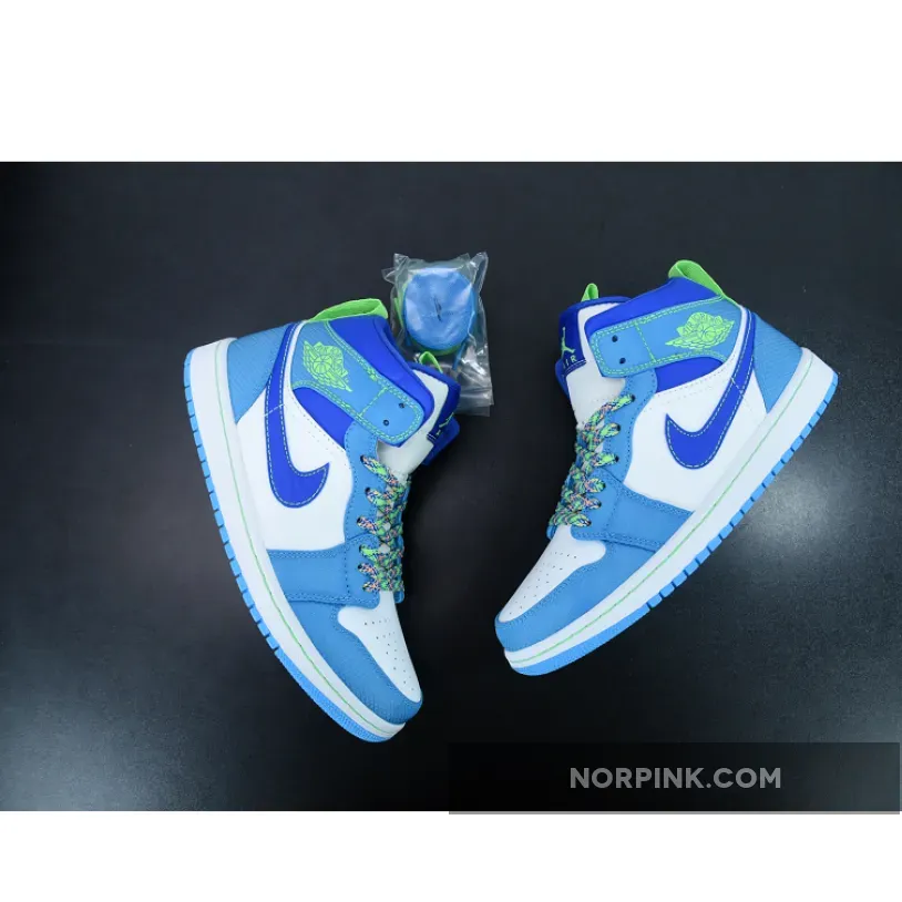 Offered exclusively in kids sizing, the Air Jordan 1 Mid SE GS ‘Sprite’ enlivens the classic silhouette with eye-catching hues. Multicolor laces secure an upper that combines a white leather base with a Racer Blue Swoosh and woven textile overlays in Dark Powder Blue. Neon green accents land on a Jumpman logo atop the tongue tag, Wings branding on the lateral collar flap, and a pair of webbing pull tabs that assist with easy on and off.