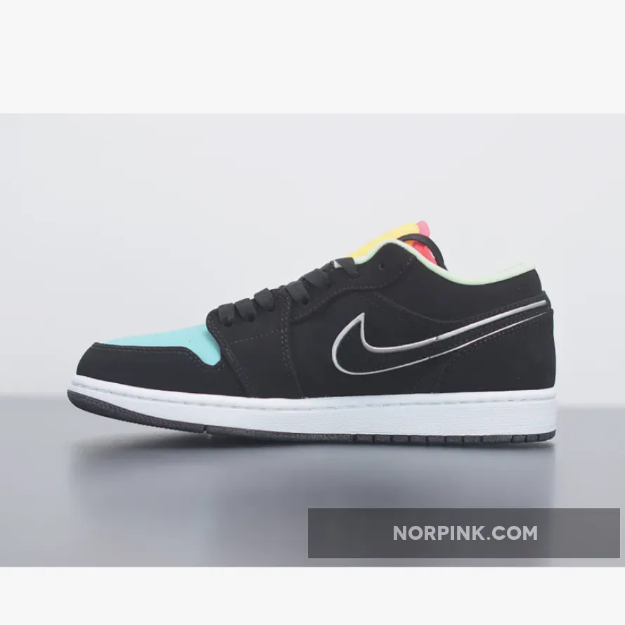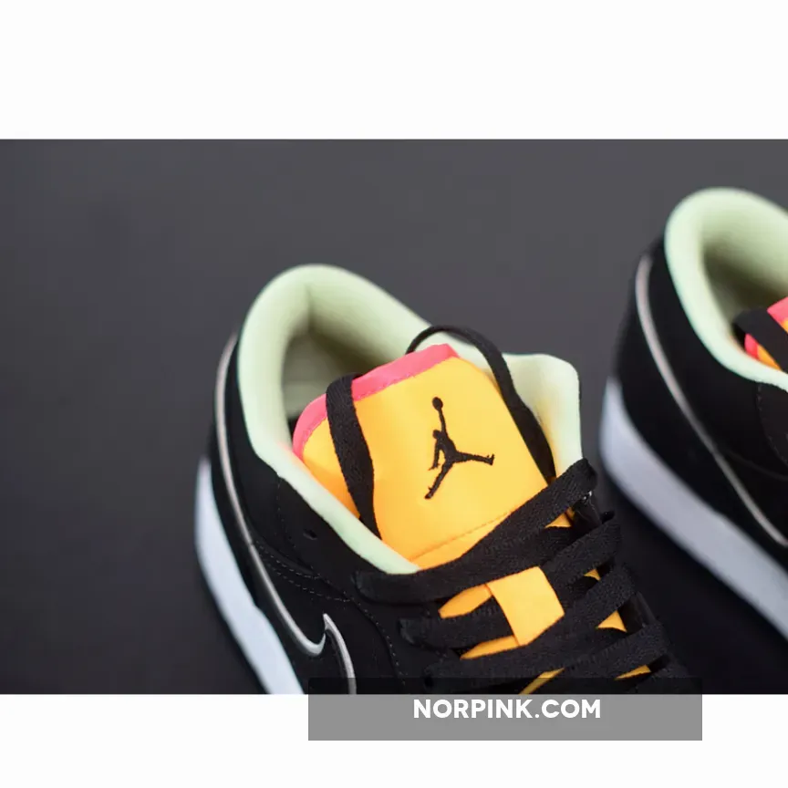 The uppers are crafted from a blend of suede, canvas and mesh, with the colorway combining a black base layer with pops of green, orange and red for a vibrant look. Nike’s signature Swoosh logo runs neatly across both the lateral and medial sides, while a Jumpman logo is embroidered into the tongue and a wings logo onto the heel.