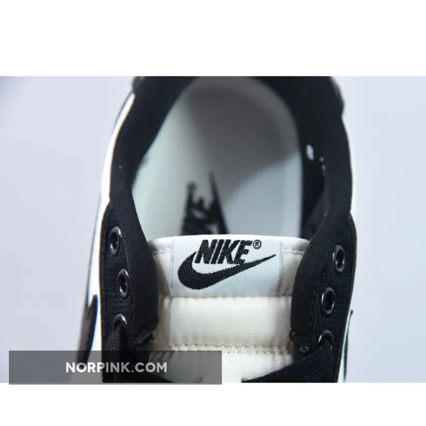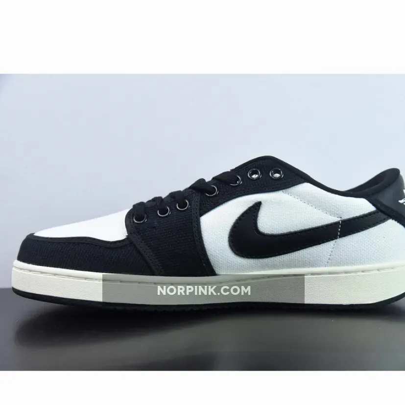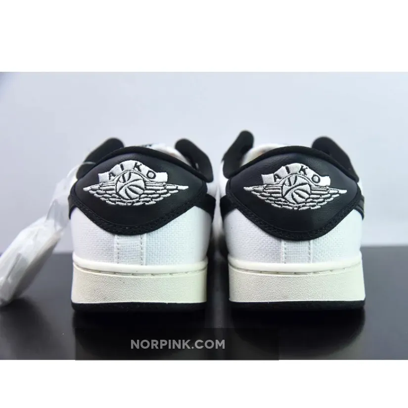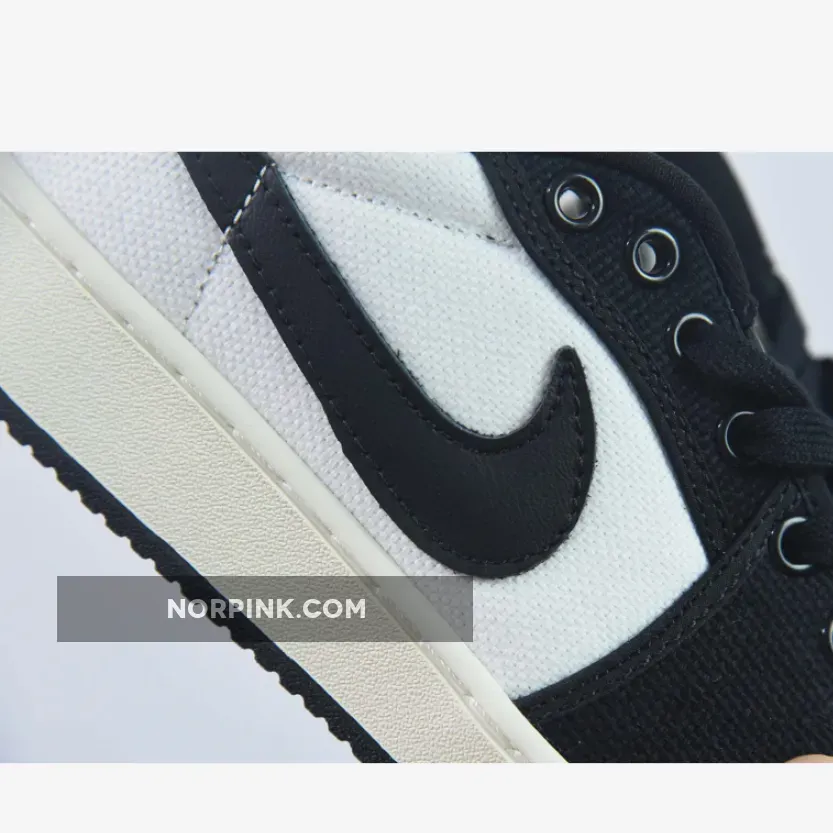 In terms of construction details, this AJ1 KO does not deviate significantly from its previous iterations. This offering of the Air Jordan 1 KO Low comes constricted in a full White and Black canvas base with Black leather Swooshes and heel overlay. The canvas overlays on the toe cap, the mudguard and the eye stay panels are also in black, just like the laces and mesh sock liner. and “Nike” logos on the tongue tags and insole with White Wings embroidery on the heels. Meanwhile, white claims its rightful place on the AJ KO emblems. A sail-coloured midsole and a black rubber outsole cap off the look of this shoe.