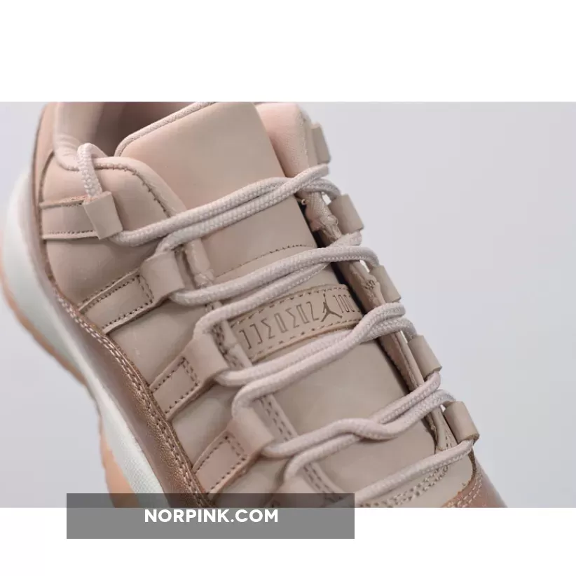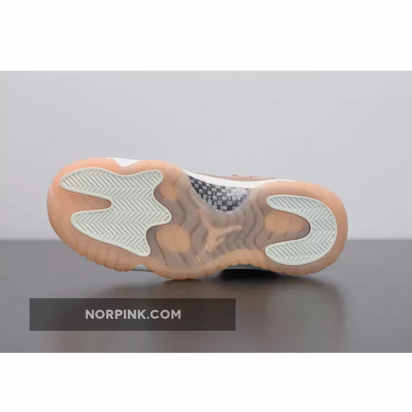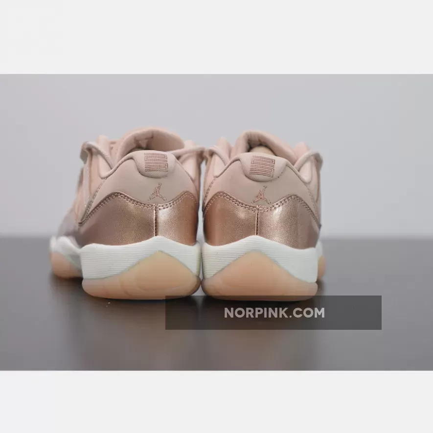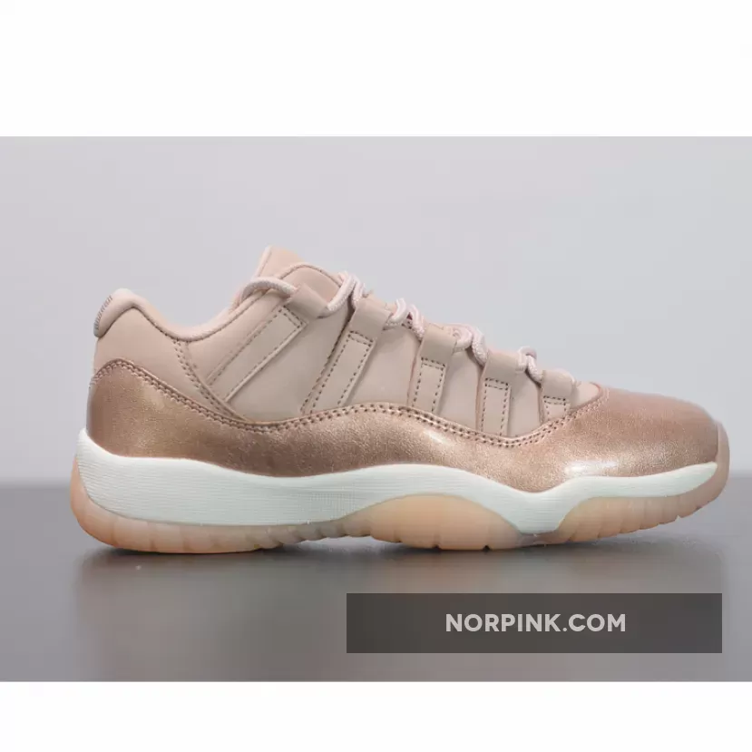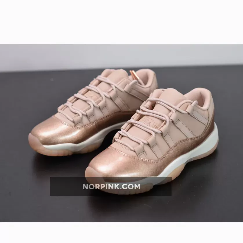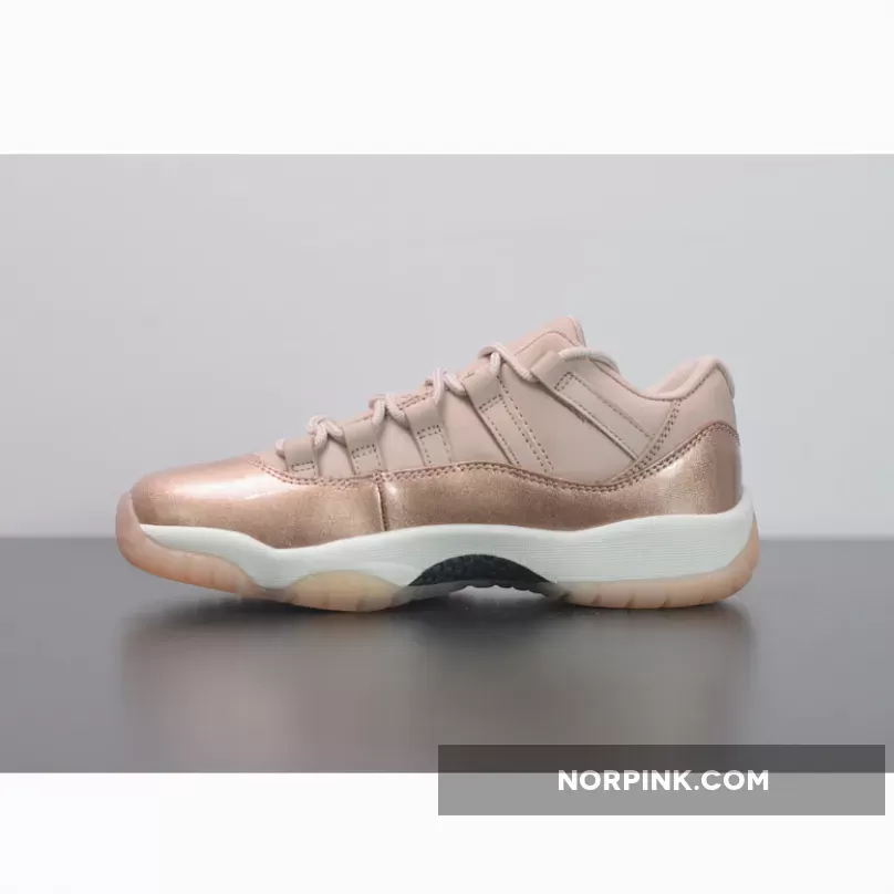 Dressed in Rose Gold-like color scheme. This low-top Air Jordan 11 ditches the usual mesh upper with a new constructed build. Highlighted with its Metallic Red Bronze patent overlay, atop a White midsole and Pink-tinted translucent