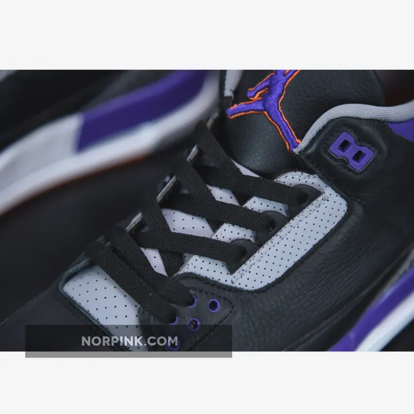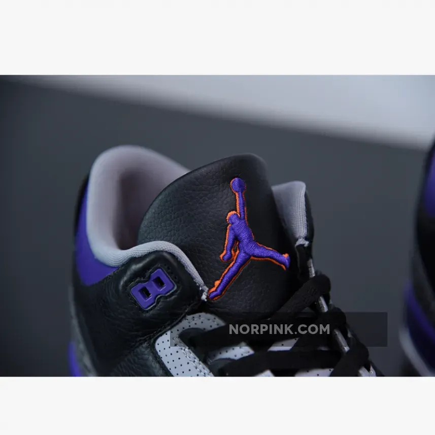 Underfoot, a white midsole is complemented with a purple color segment, while the shoe boasts a visible Nike Air unit under the heel, one of the Air Jordan 3s most popular features.