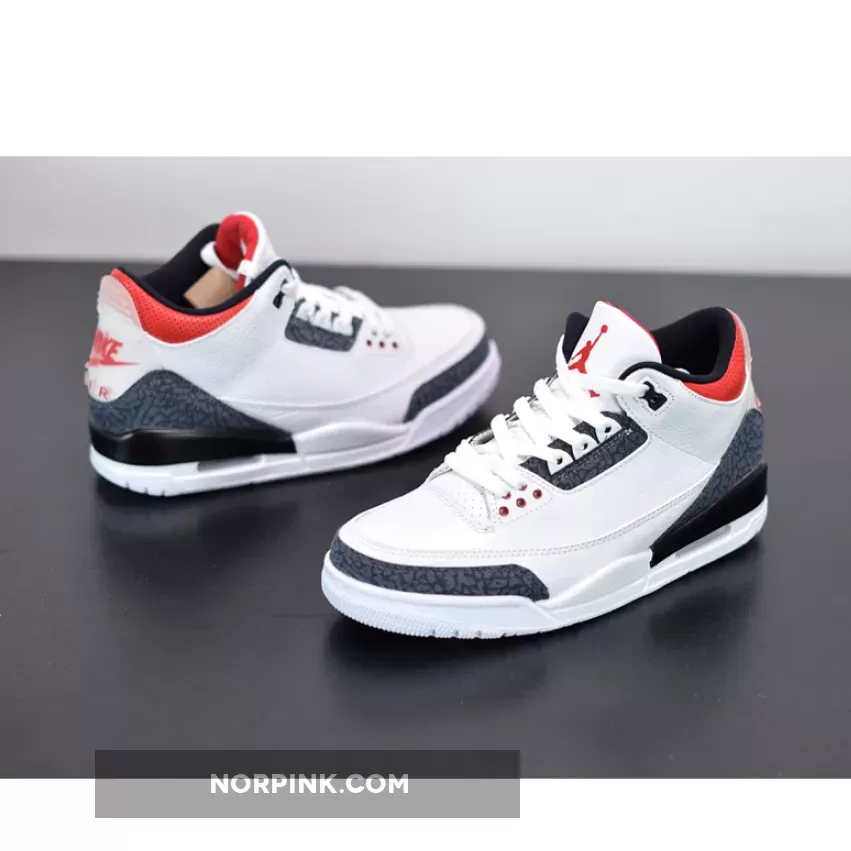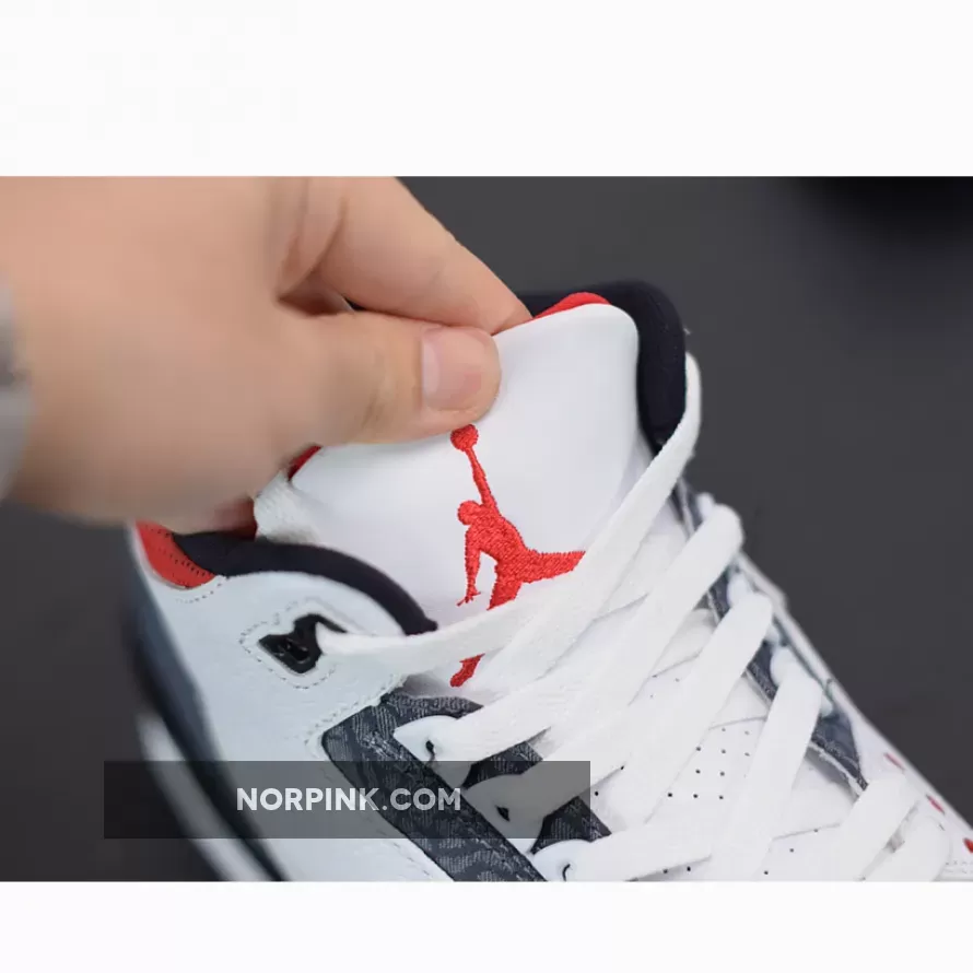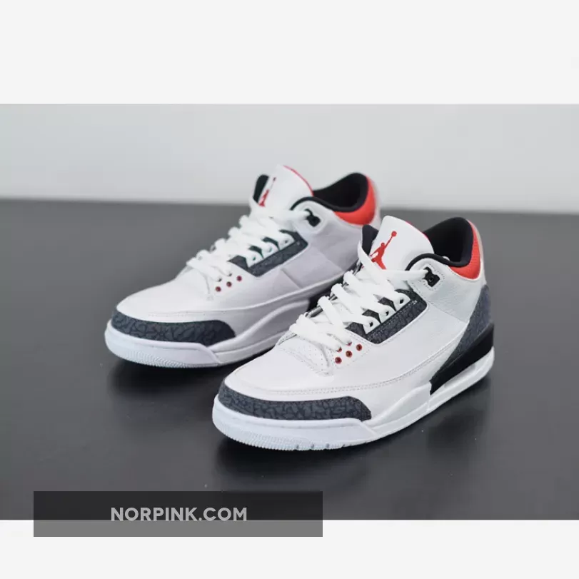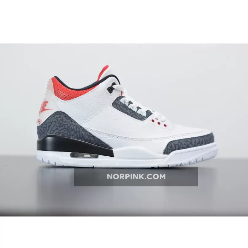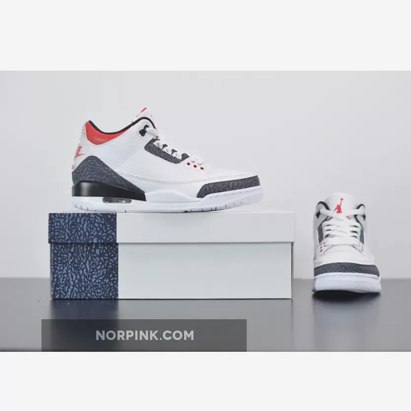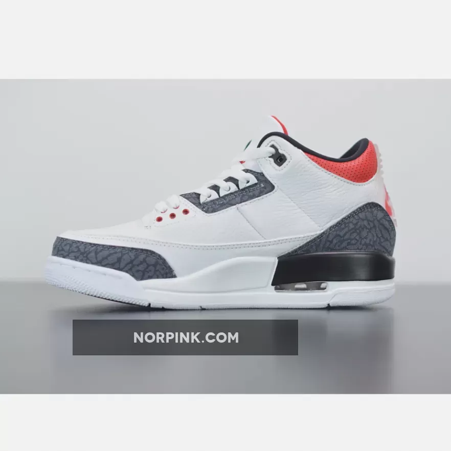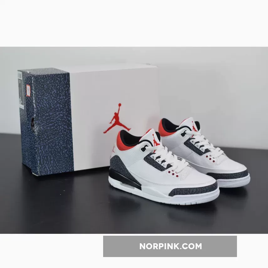 Dressed in a White, Fire Red, and Black color scheme. This Air Jordan 3 features a White leather upper with raw denim-finished elephant print inspired by Japan on the heel, toe and eyestay. The model features a translucent Nike Air and Jumpman heel tabs and comes in special denim elephant-print packaging.