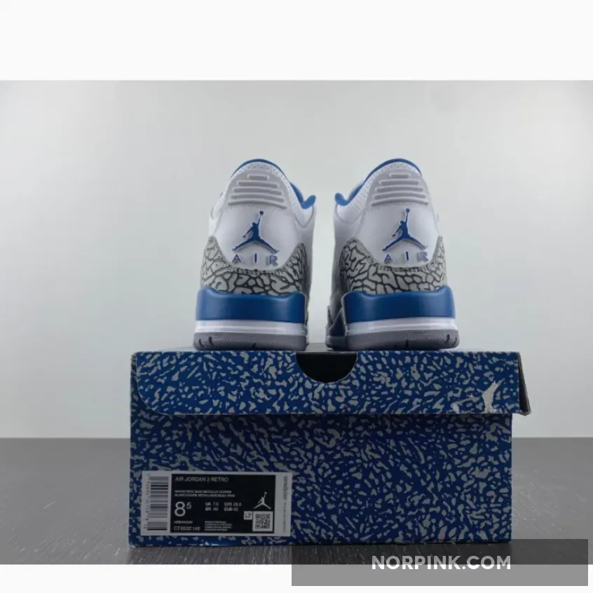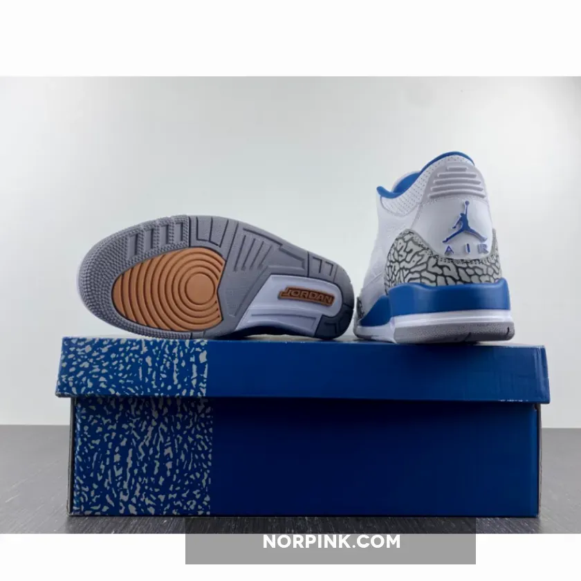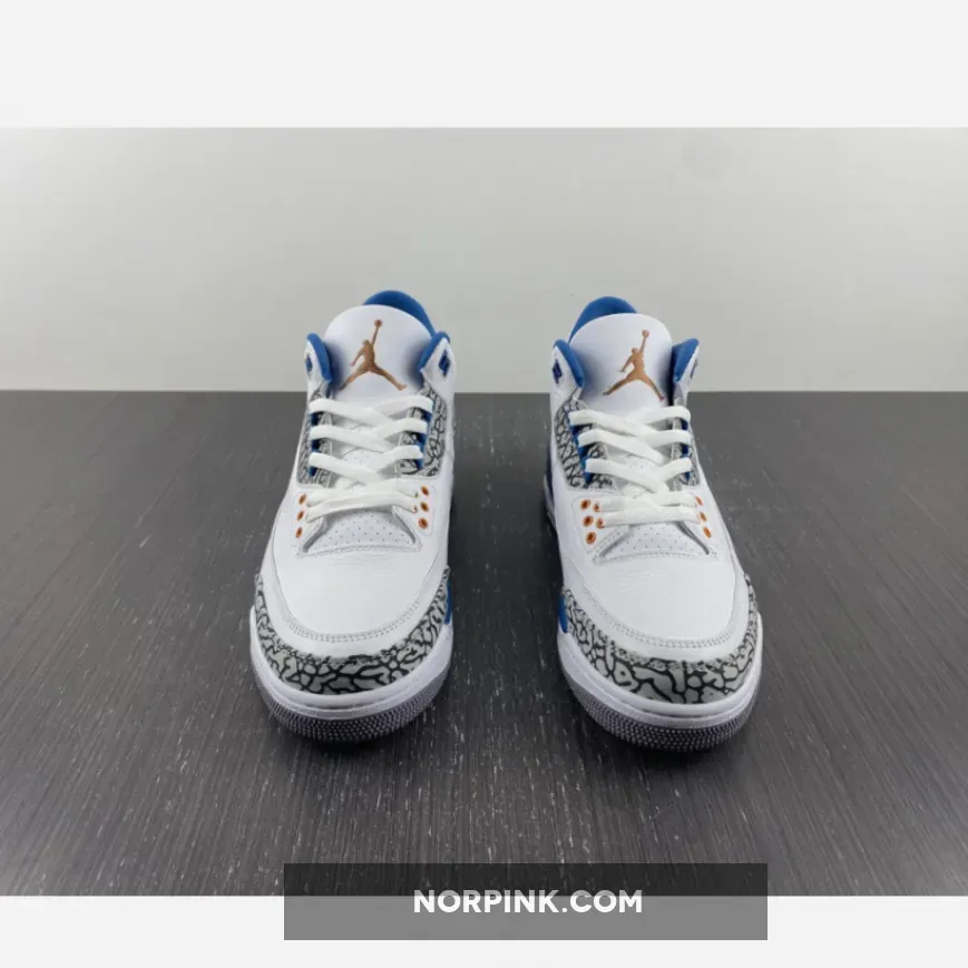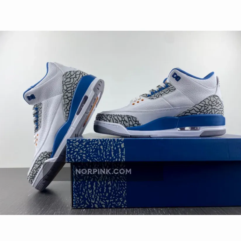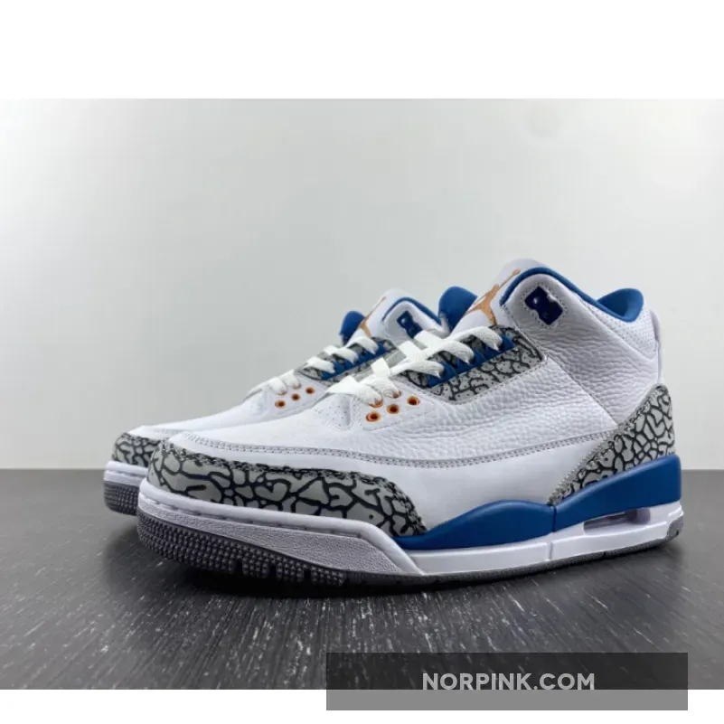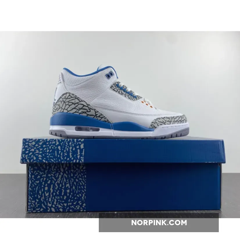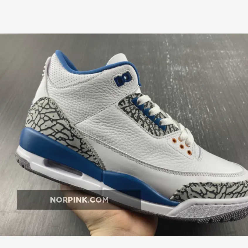 The Air Jordan 3 Retro ‘Washington Wizards’ showcases a familiar design based on a PE colorway that Michael Jordan wore during his time in D.C. Featuring color blocking reminiscent of the OG ‘True Blue’ edition from 1988, the classic silhouette makes use of a white tumbled leather upper with grey elephant-print overlays at the toe and heel. Contrasting blue accents appear on the interior lining, molded eyelets, and the raised Jumpman logo that decorates the heel tab. A second Jumpman graces the tongue in copper-colored embroidery, matching the circular eyelets that dot the forefoot. The mid-top is mounted on a two-tone polyurethane midsole, equipped with a visible Air-sole heel unit and supported by a durable grey rubber outsole.