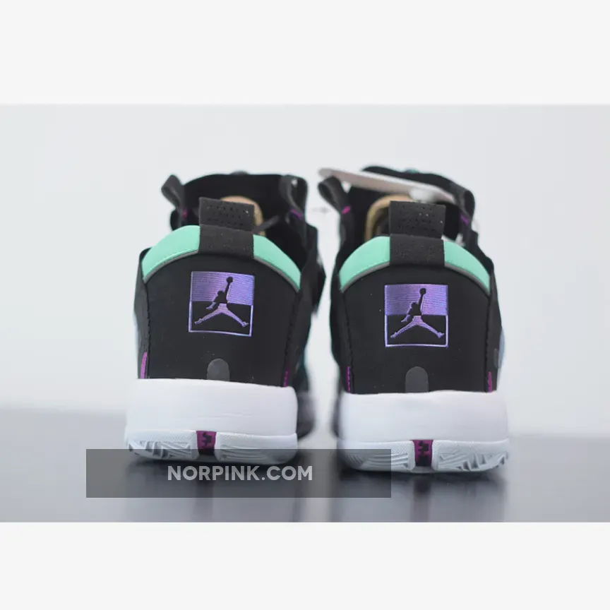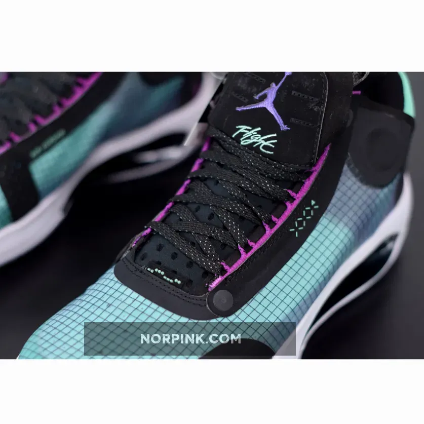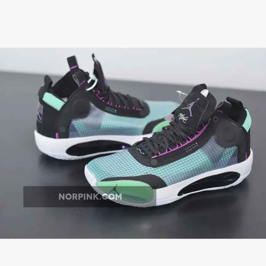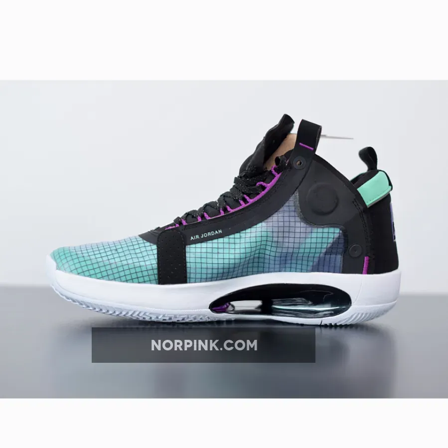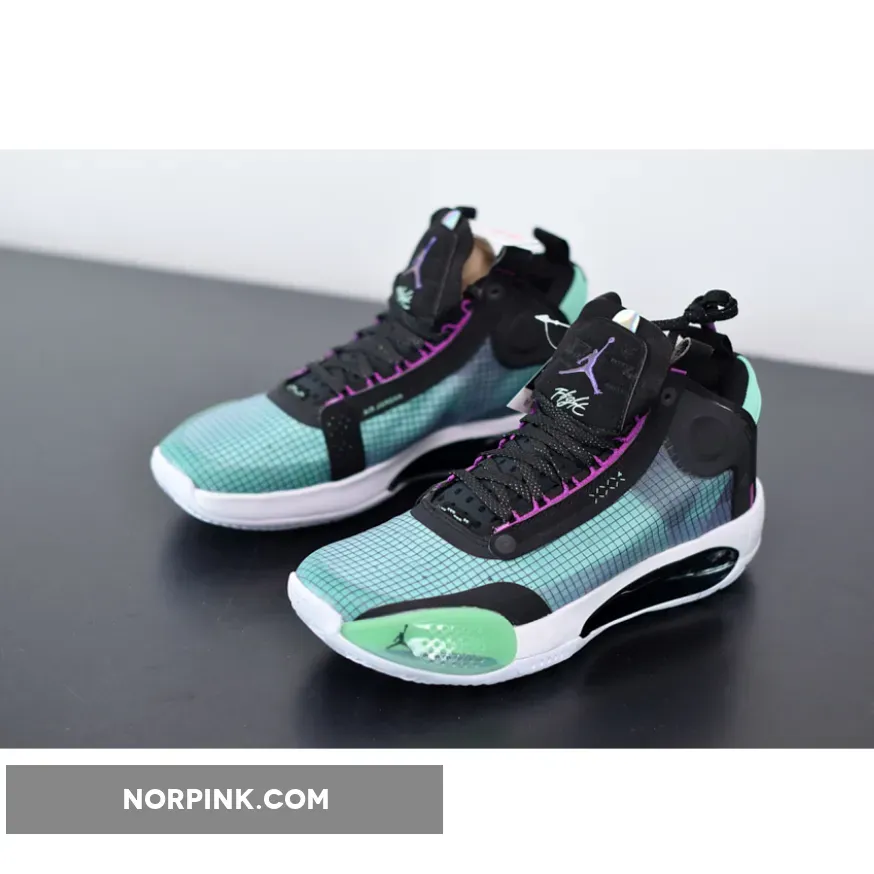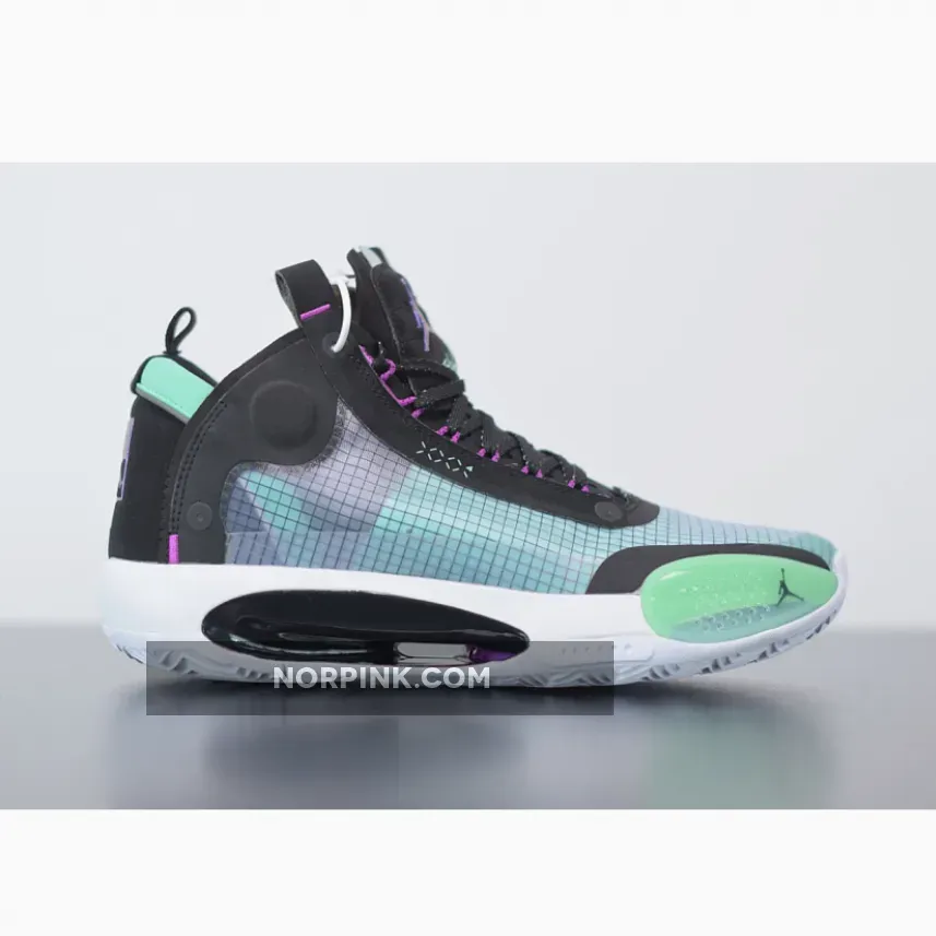 Dressed in a Blue Void, Green Glow, Black, and Metallic Silver color scheme. The Air Jordan 34 is one of the lightest Air Jordans to date.
