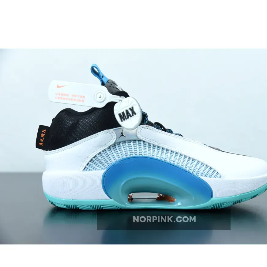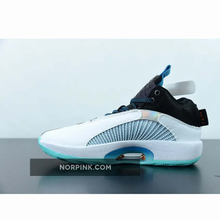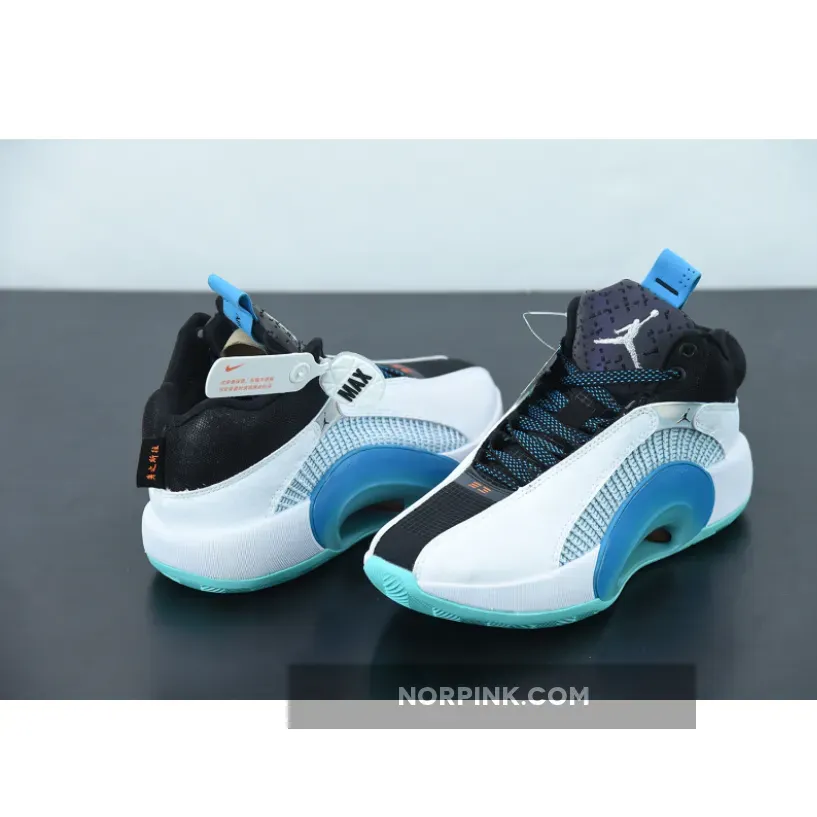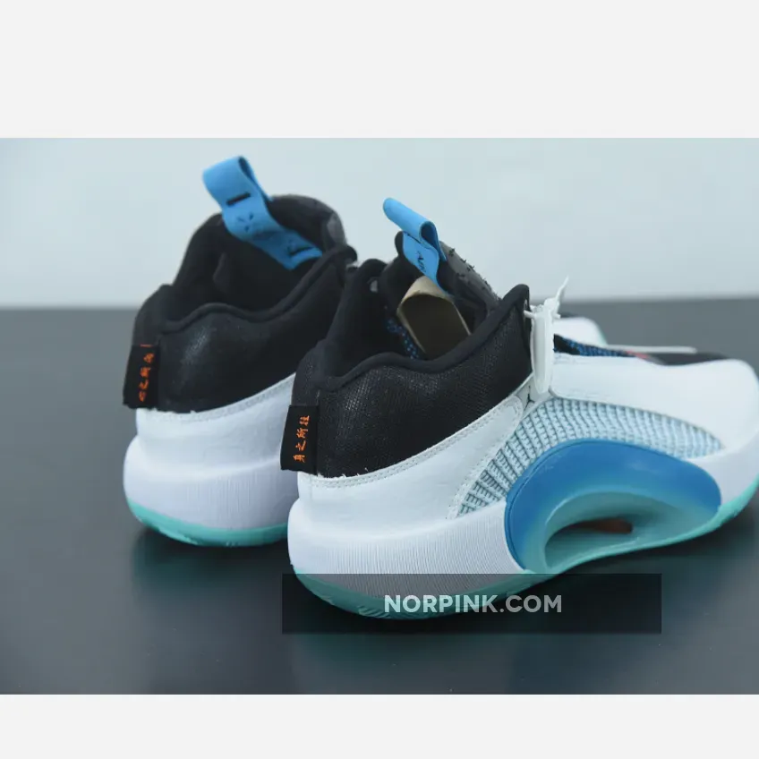 Going over this Air Jordan 35, it features both White and Black throughout the base. Next, we have Teal and Blue on the Eclipse plate, side panels, laces, tongue pull tab, and the rubber outsole. Guo Ailun’s logo adorns the right tongue while a Jumpman logo lands on the left. Following, the heel tag features Chinese characters in Red while more Red lands on some of the branding. Lastly, a unique graphic covers the insoles.