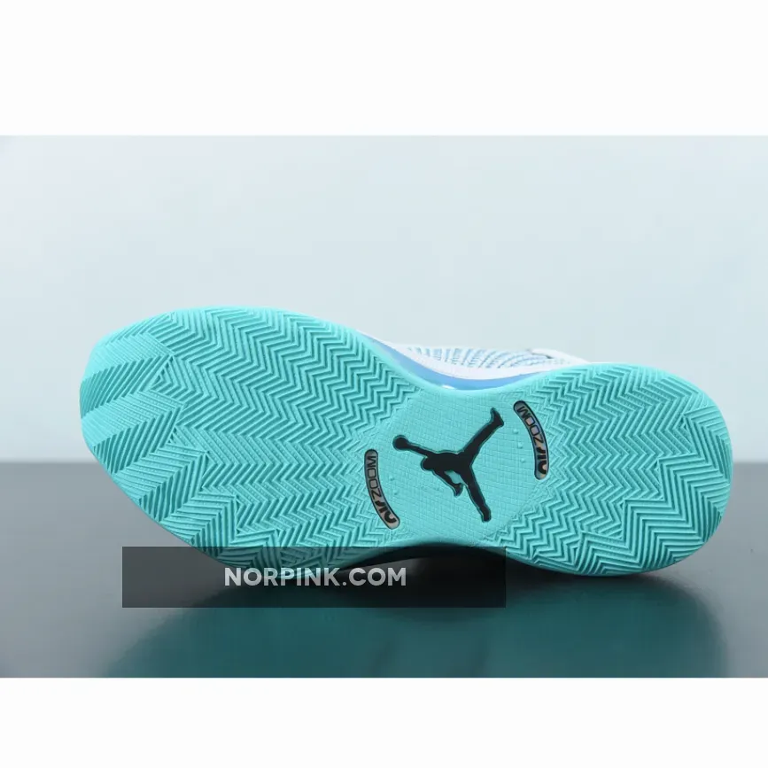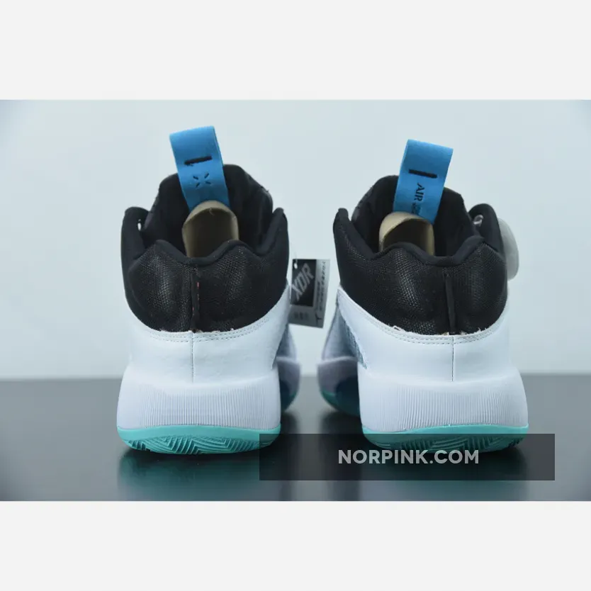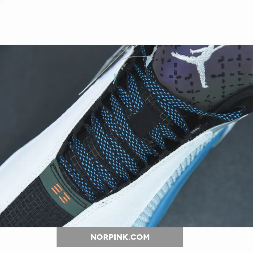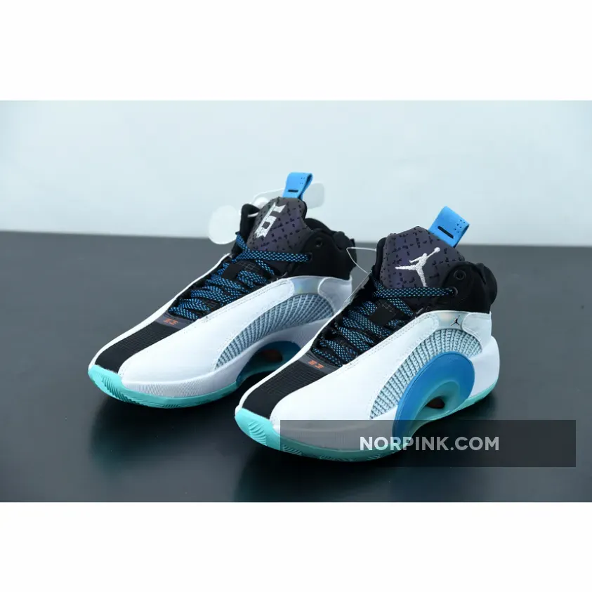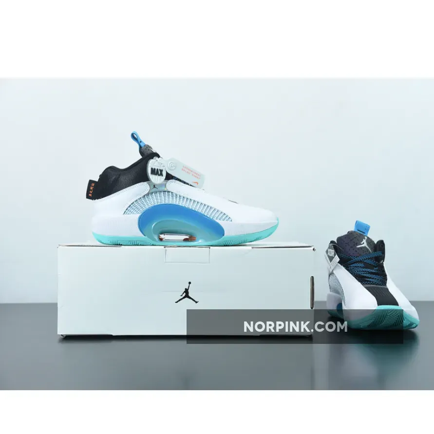 Going over this Air Jordan 35, it features both White and Black throughout the base. Next, we have Teal and Blue on the Eclipse plate, side panels, laces, tongue pull tab, and the rubber outsole. Guo Ailun’s logo adorns the right tongue while a Jumpman logo lands on the left. Following, the heel tag features Chinese characters in Red while more Red lands on some of the branding. Lastly, a unique graphic covers the insoles.