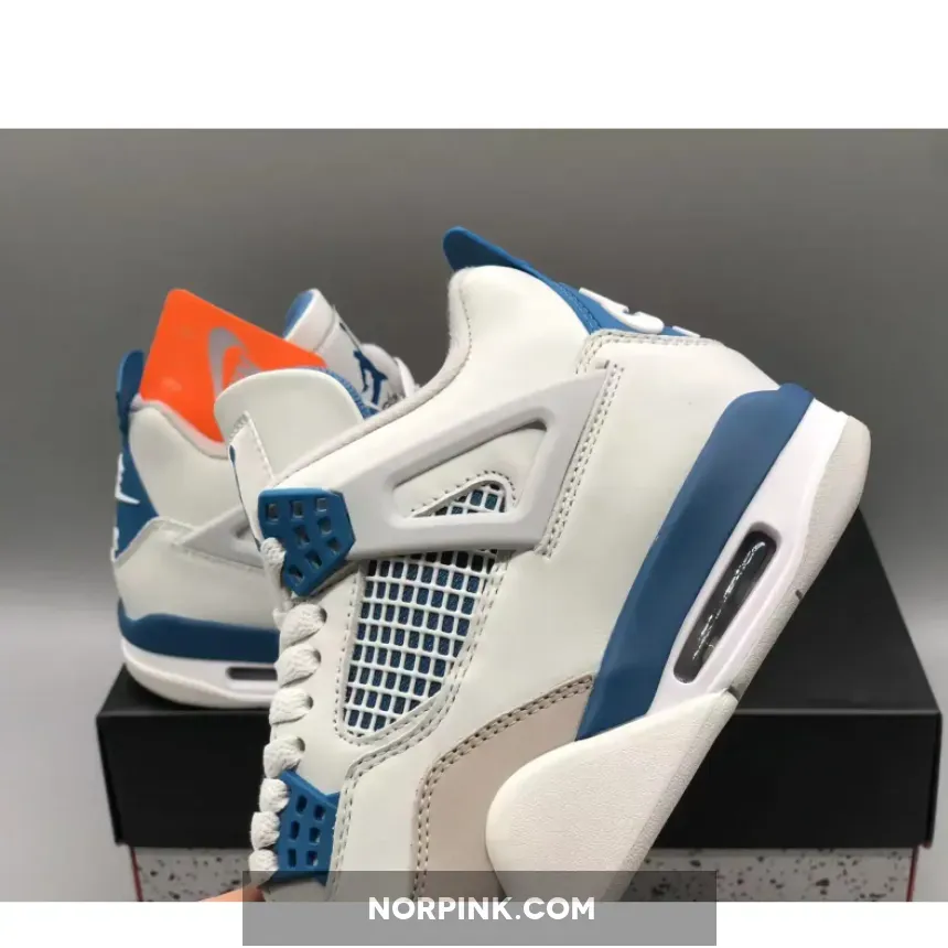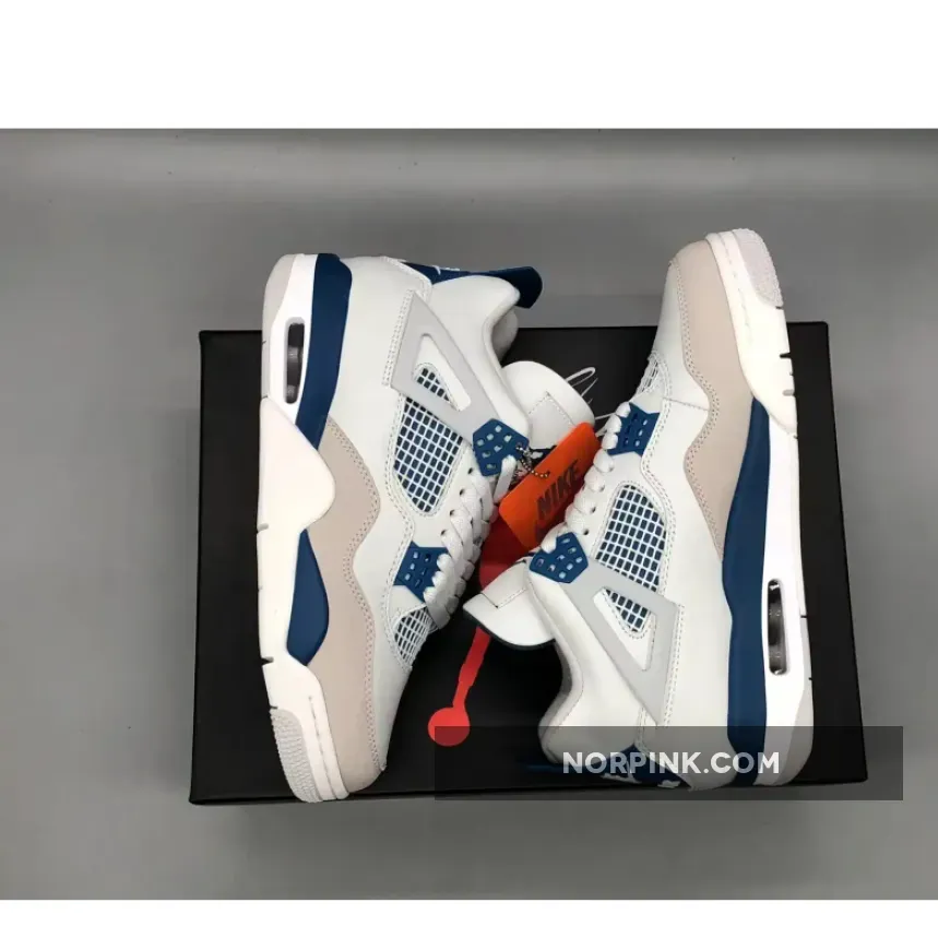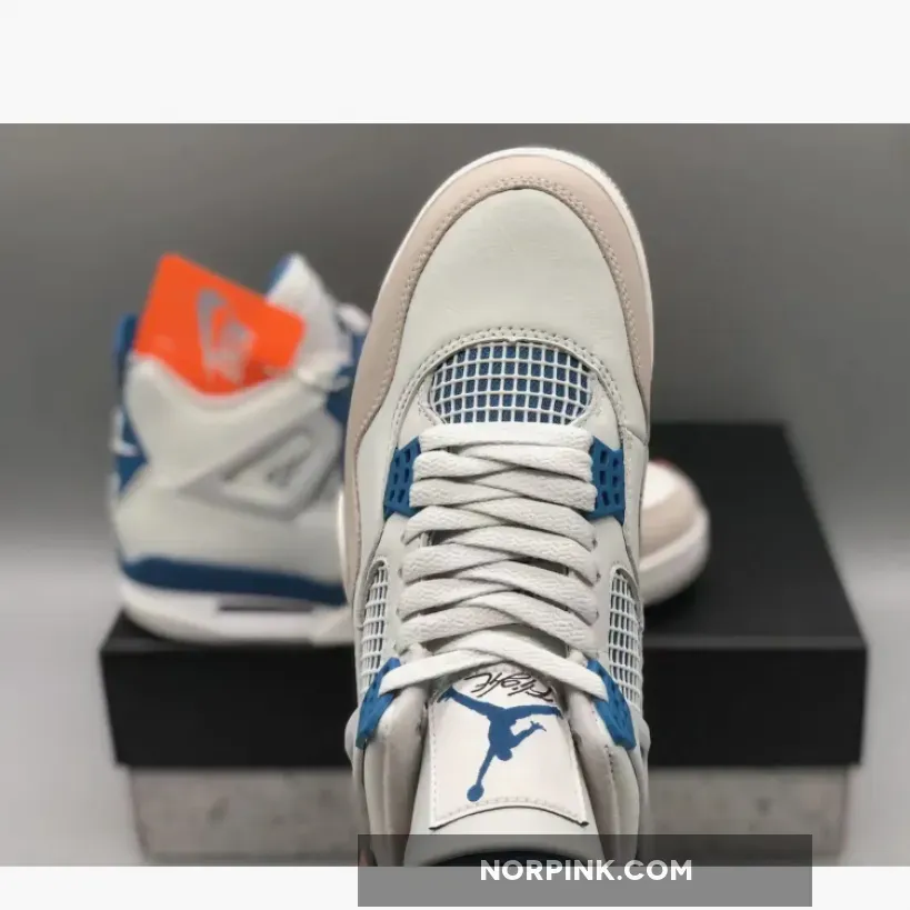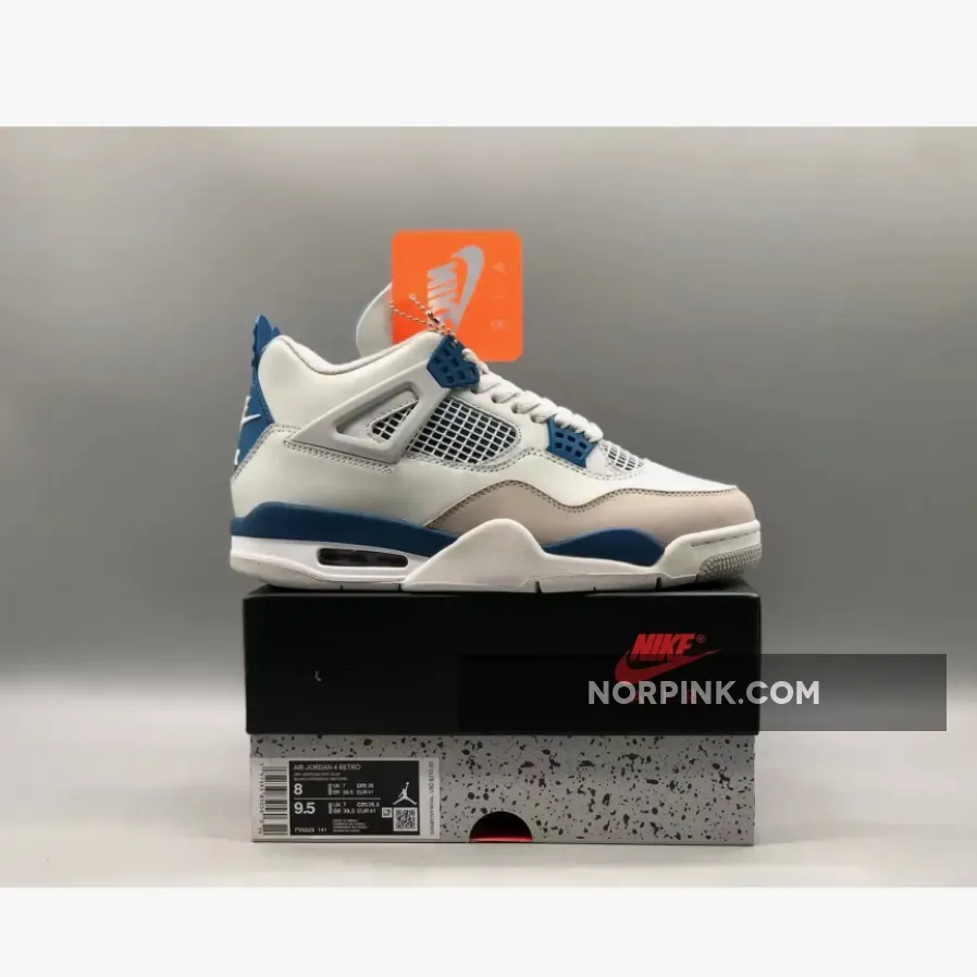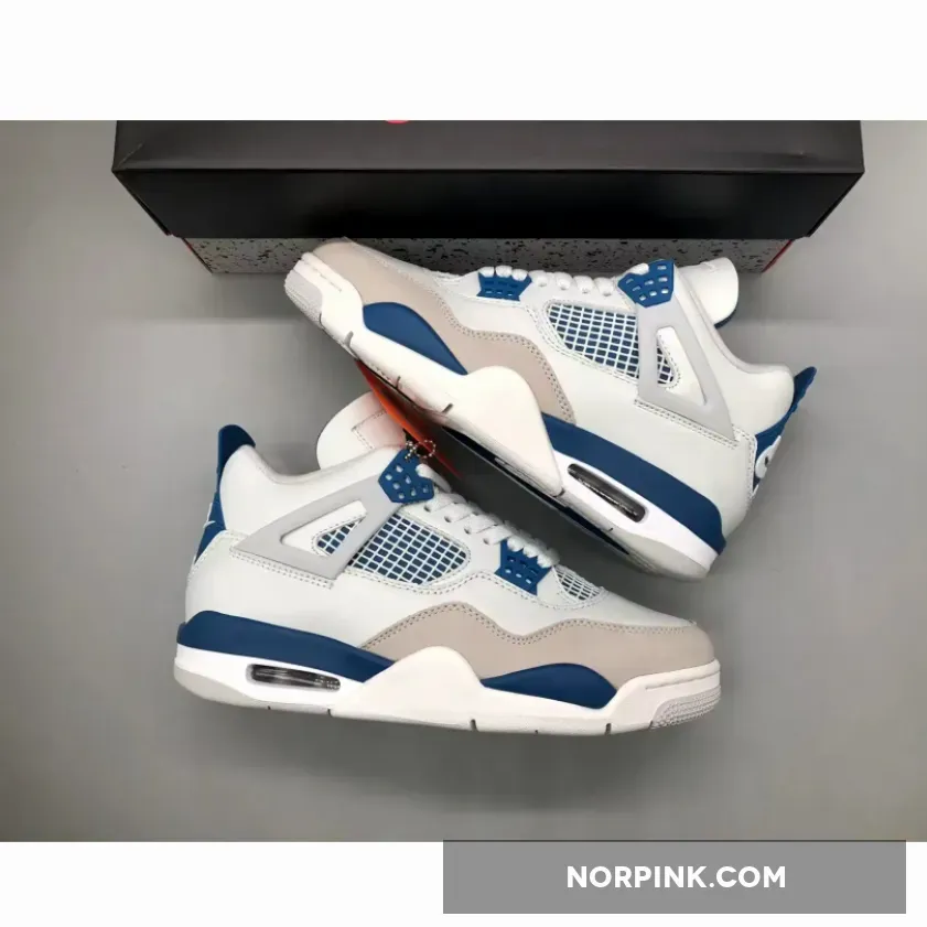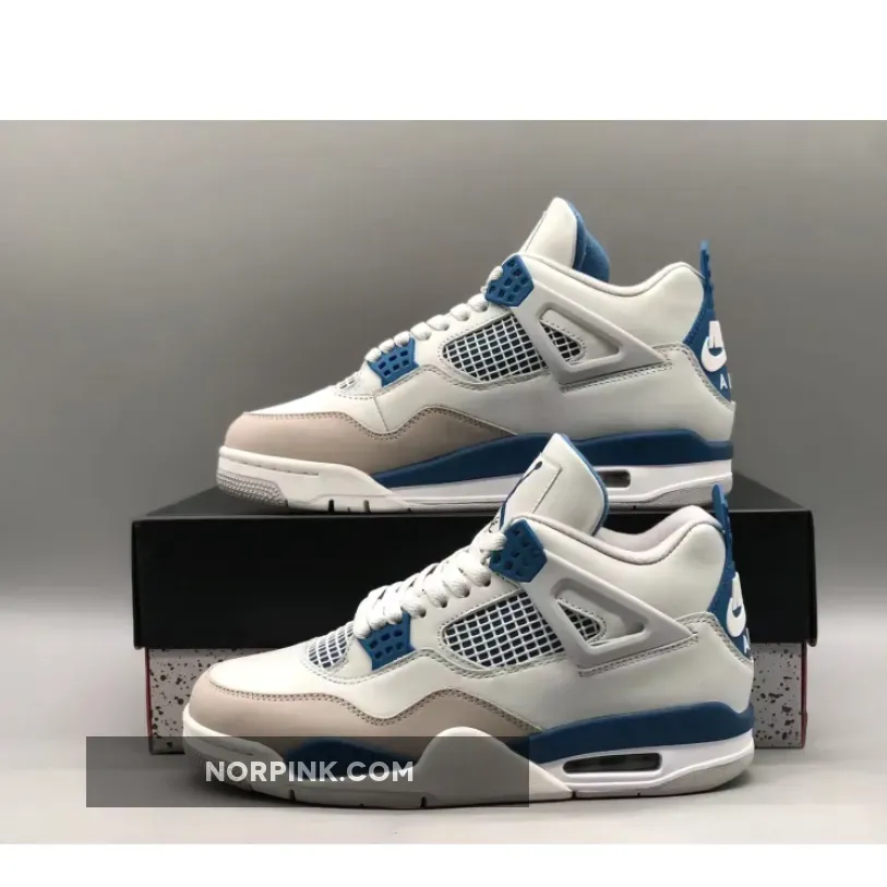 The Air Jordan 4 showcases a timeless color scheme consisting of Off-White, Military Blue, and Neutral Grey. Its upper is crafted from Off-White leather with overlays in Neutral Grey adorning the toe area. The quarter panel is equipped with a “Military Blue” underlay and topped off with the AJ4’s signature net. The design is elevated by Military Blue accents on the eyelets, midsole, heel tabs, and Jumpman logos on the tongues. Adding to the authenticity, the heels bear “Nike Air” branding in White, while a White, Blue, and Grey rubber outsole completes the overall aesthetic.