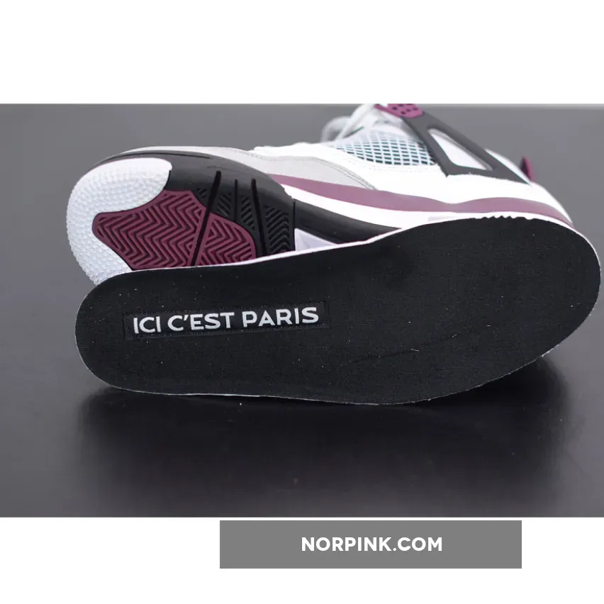 “Bordeaux” takes center-stage as it animates hardware, tongue and heel accents, and midsole tooling, while nodding to a beloved Jordan 7 arrangement. Nods to the storied Ligue 1 arrive in the form of “PARIS SAINT-GERMAIN” text on the rear, as well as “ICI C’EST PARIS,” the chant the club’s fans shout, on the sockliner. A tag on the forefoot rand also references Paris and its suburbs’ colloquial name (paname). (The light grey overlay also suggests more retros (“Military Blue”) using it are in the works.)