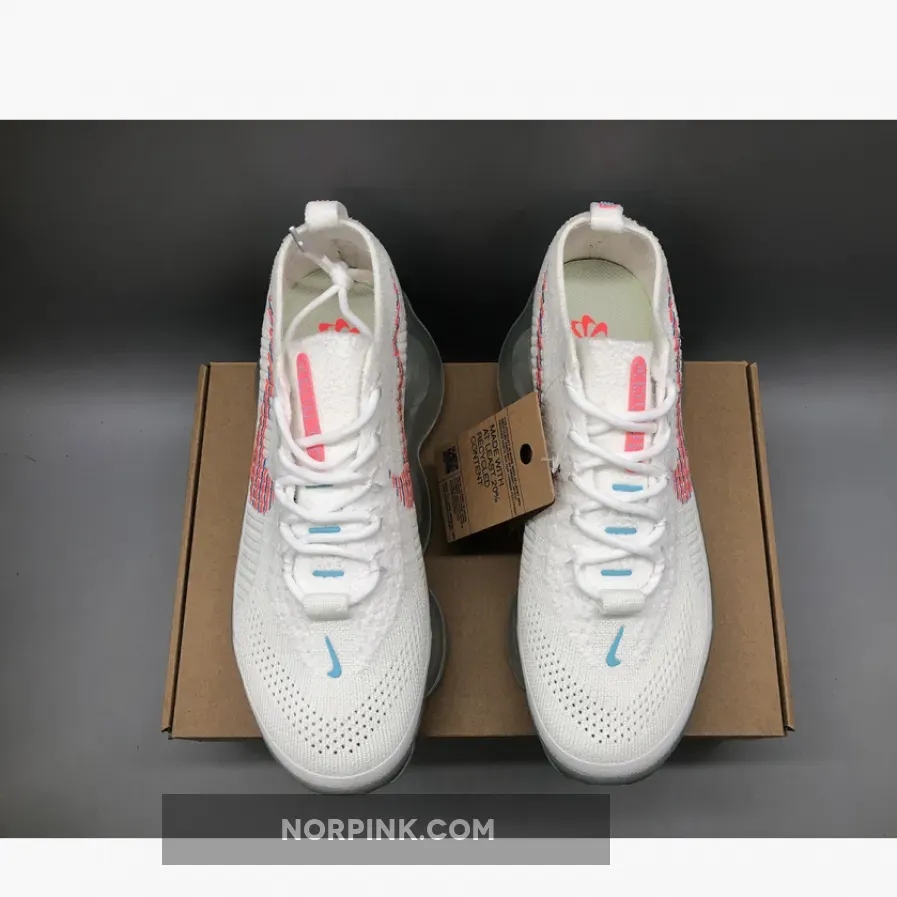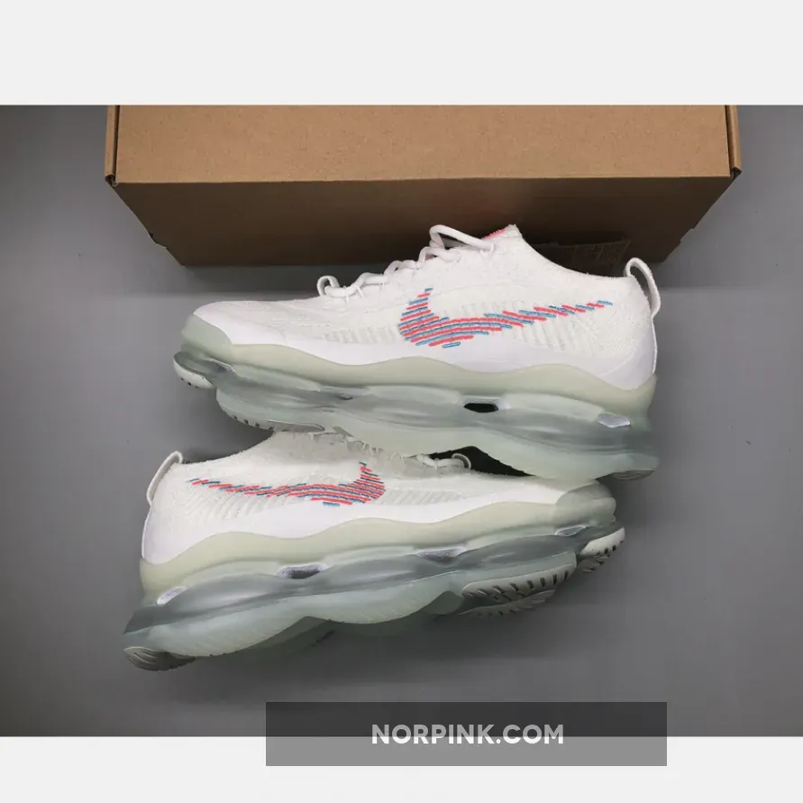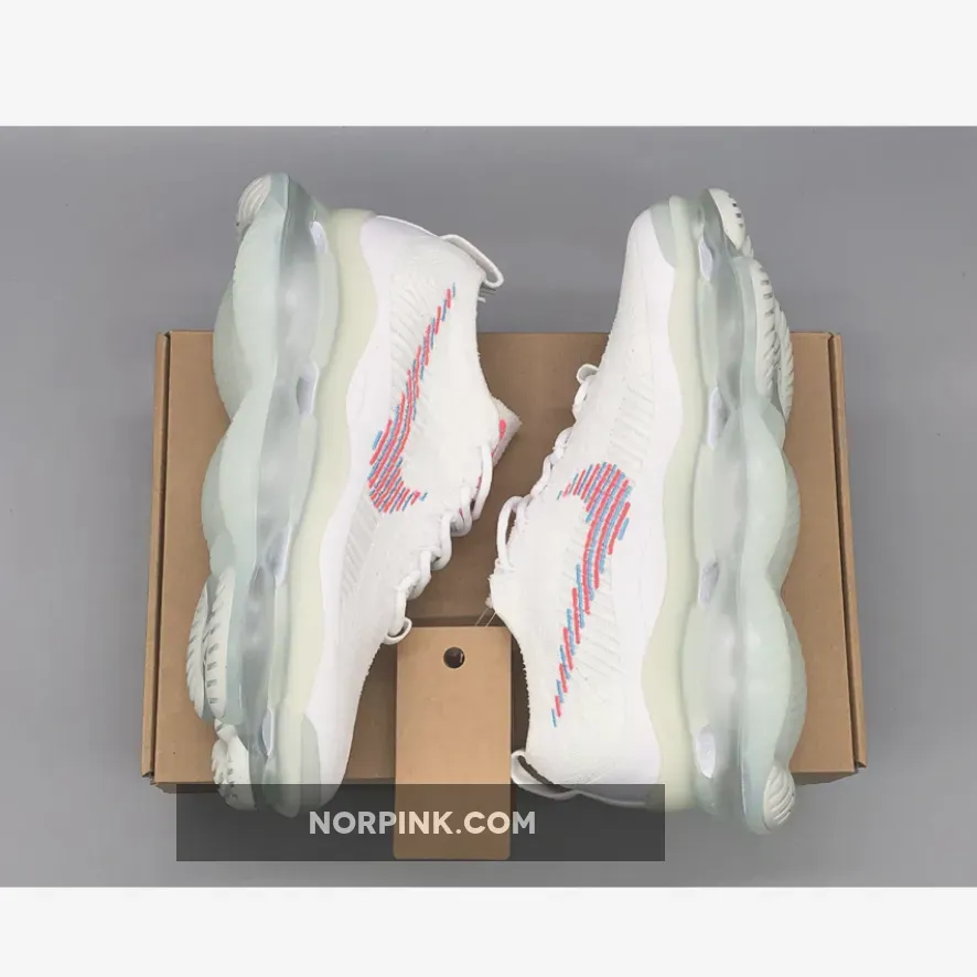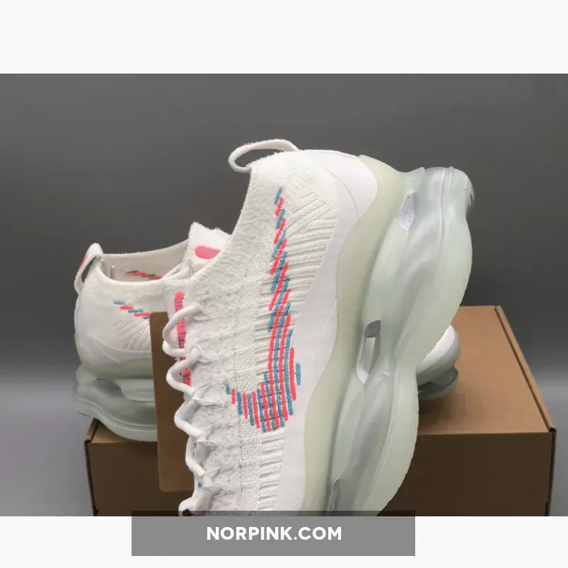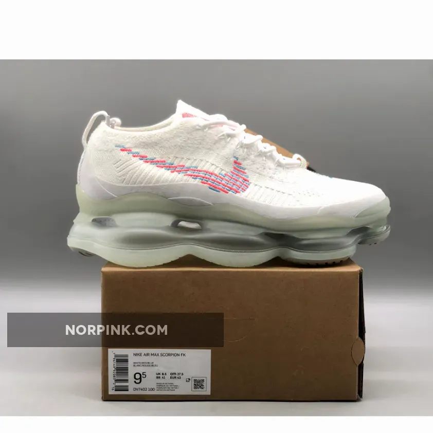 This Nike Air Max Scorpion comes dressed in a White, Lagoon Pulse, and Hot Punch color combination. A singular tone stretches atop the Flyknit and chenille construction of the upper with crisp white hues further enveloping the laces, pull tabs and color-matched full-length TPU mudguard.