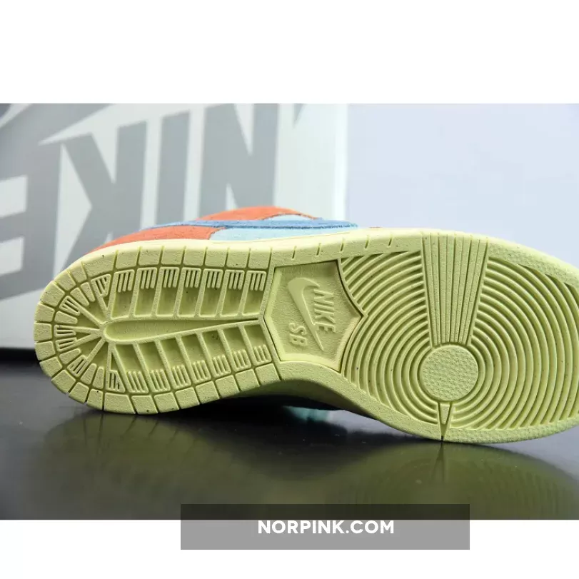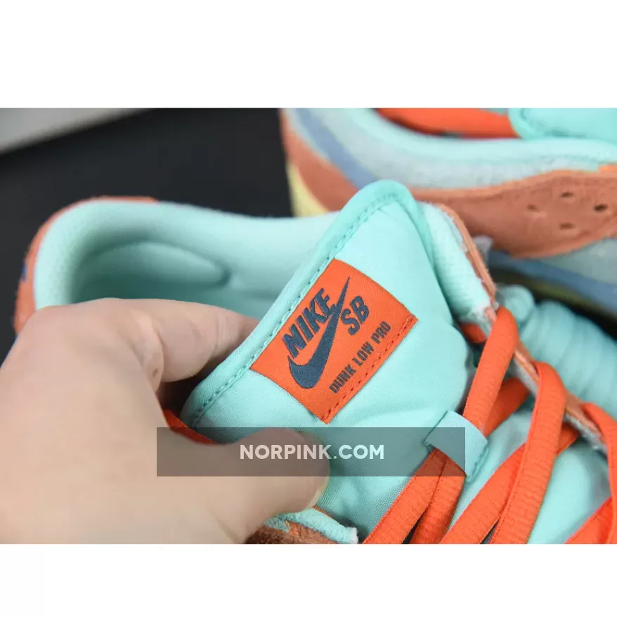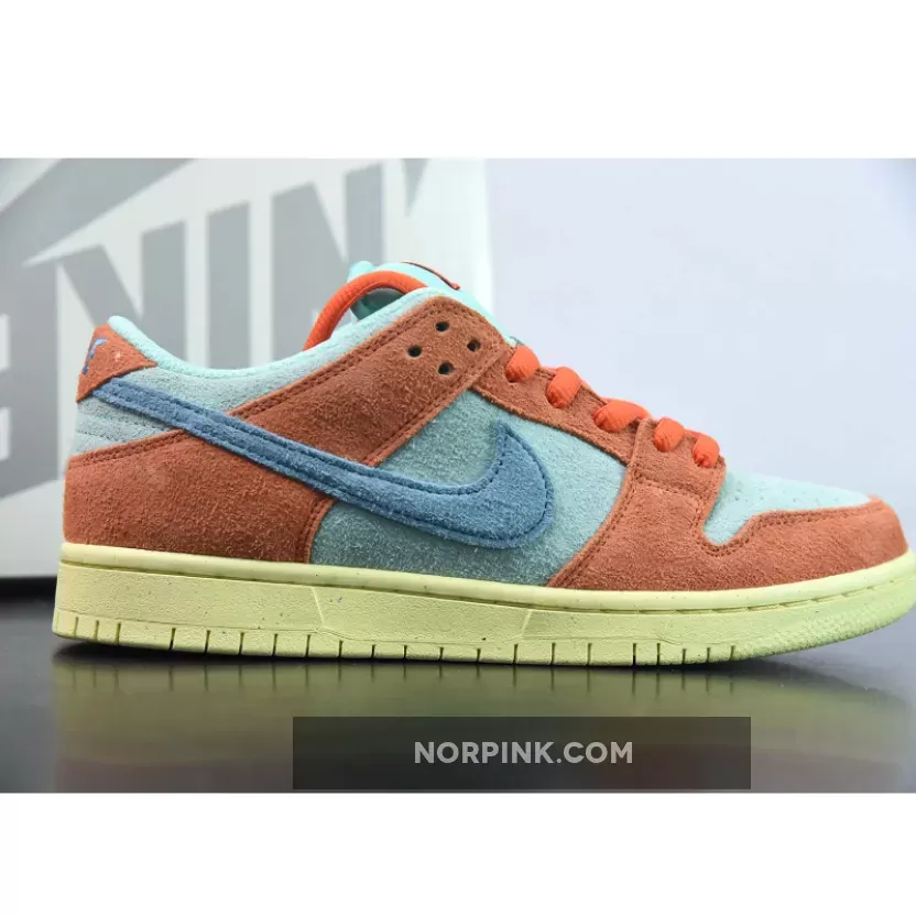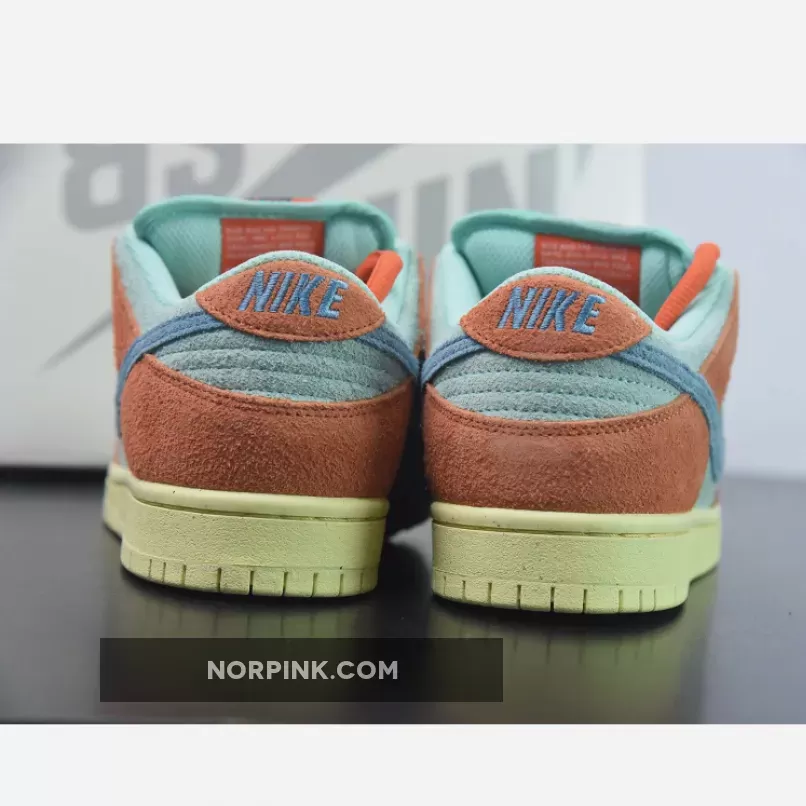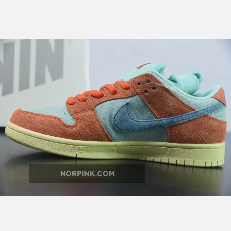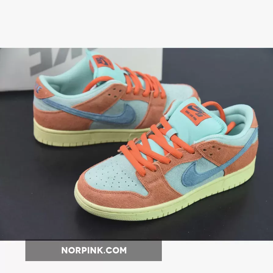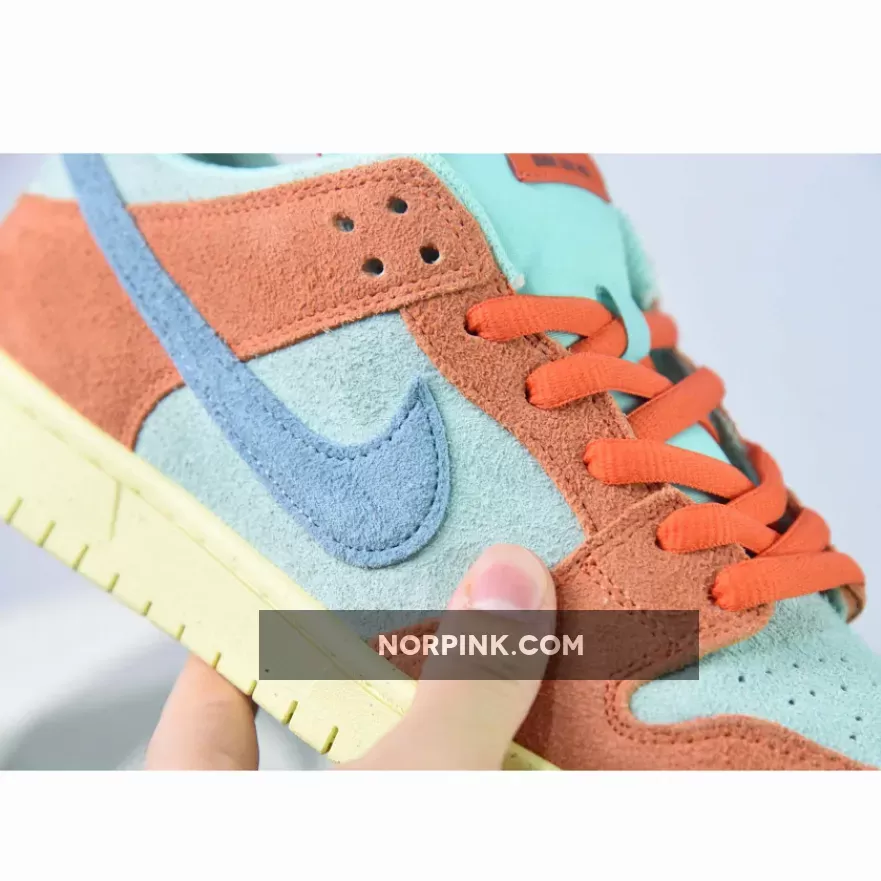 Dressed in an Orange, Noise Aqua, Emerald Rise, and Lemon Chiffon color scheme. This offering of the Nike SB Dunk Low comes constructed in a full suede build with mesh tongues and lining. Signature “Nike SB” branding atop a Lemon speckled rubber sole completes the design.