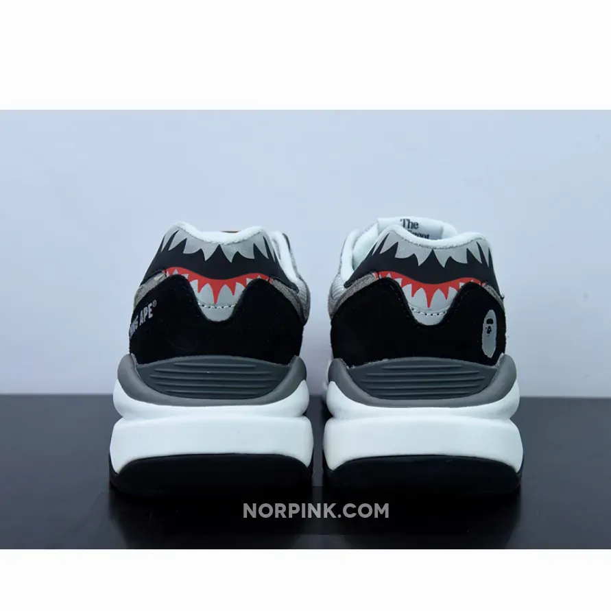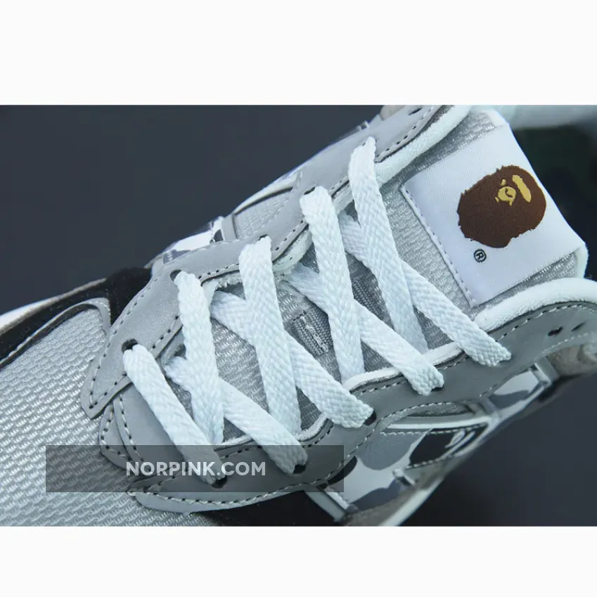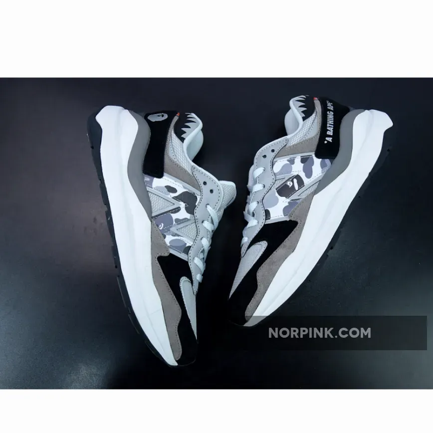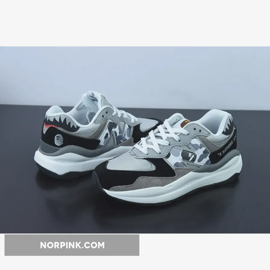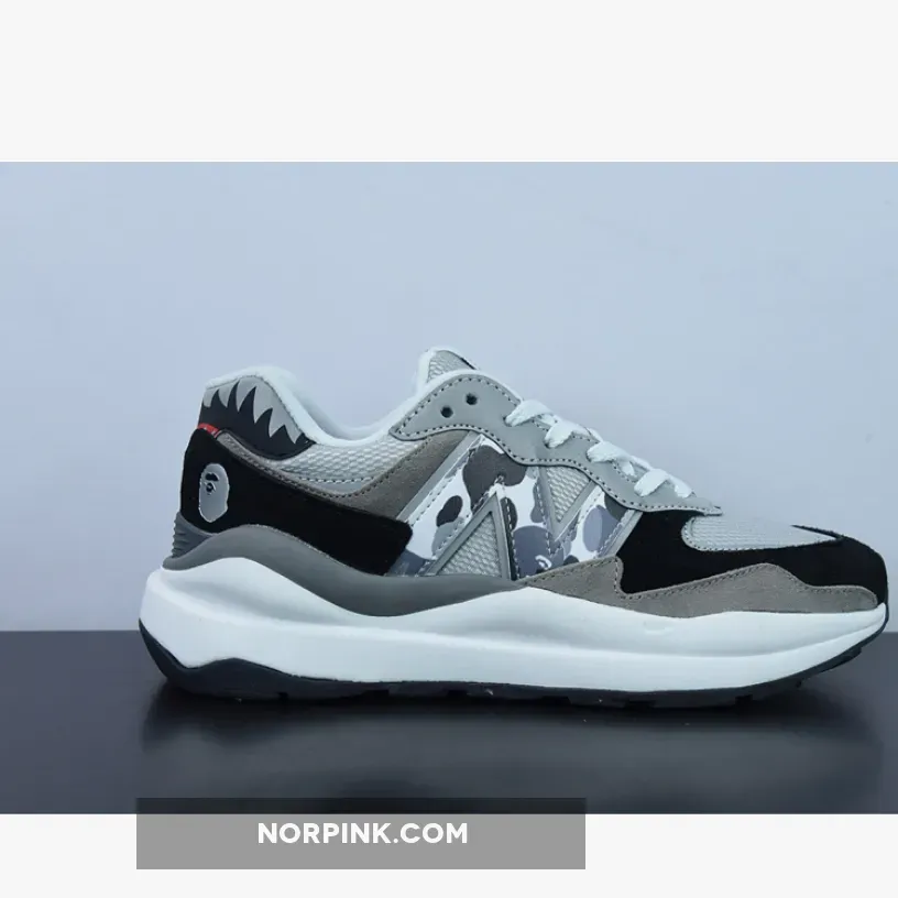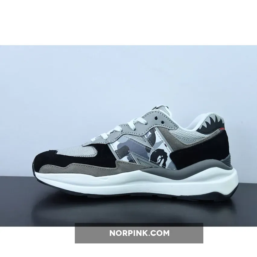 Phenomenal design on the BAPE x New Balance 57/40 Black Grey! ? The combination of mesh, suede, and leather is sleek, and the vibrant colors/calm finish options are ?. The Bape camo on the ‘N’ logos and shark teeth on the heels give it that extra edge. Highly recommend! ? #SneakerGoals #NBFan #BAPE