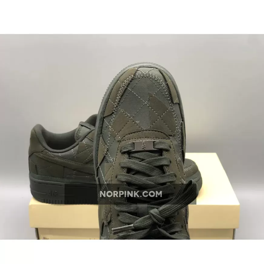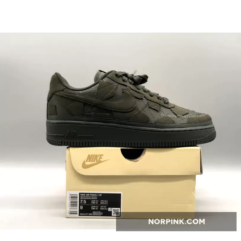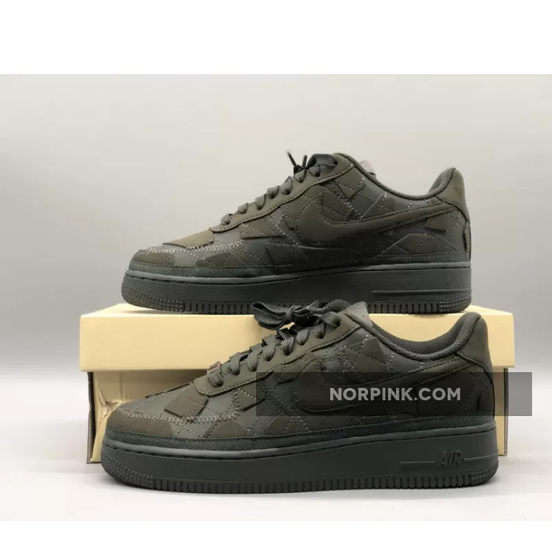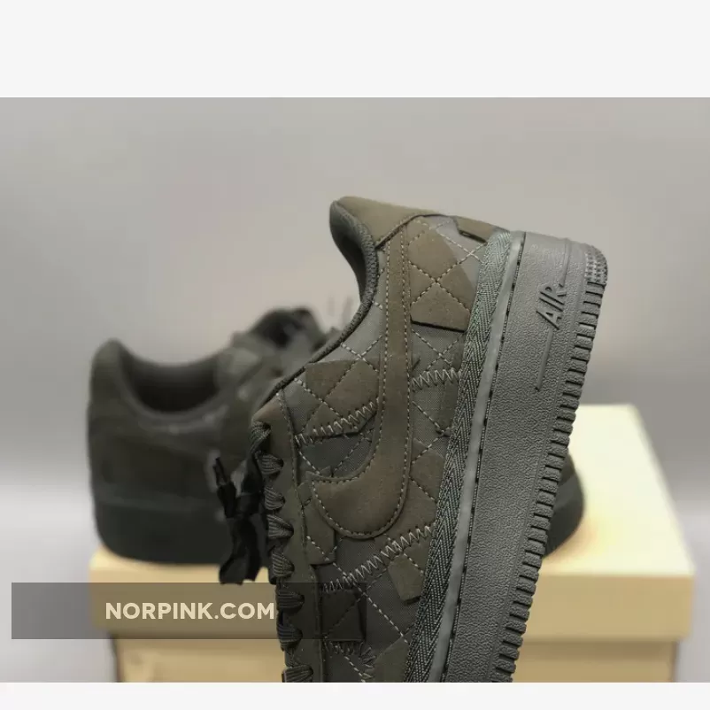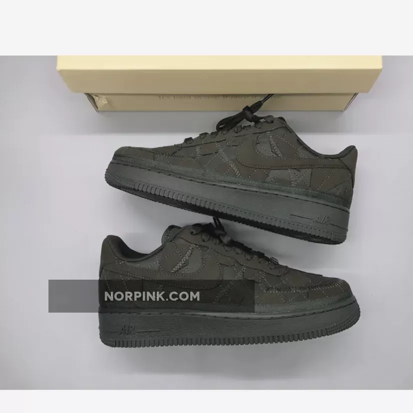 This Nike Air Force 1 Low has a quilted upper made with “Sequoia” suede, a dark fabric with a tinted green hue. The sneaker has a patchwork exterior complete with canvas and statement stitching. The shoe also features sustainable details as its made from recycled and vegan textiles.
