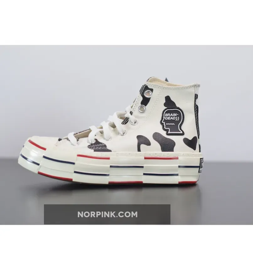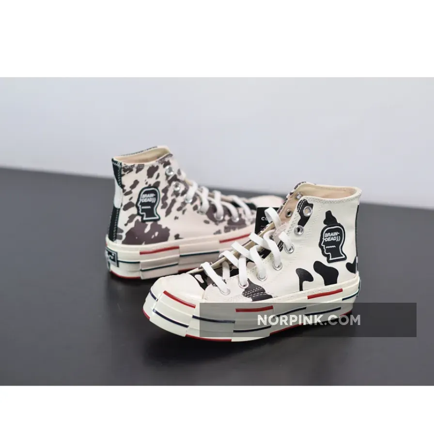 The Brain Dead x Converse Chuck 70 High Egret brown is Converse’s latest addition to their collaboration list with Kyle Ng’s Brain Dead.The LA-based brand returns in time for the festive season to reveal a very contemporary twist to the Chuck Taylor 70s silhouette. The model features 3 primary sections of the shoes each covered with different cow prints on premium canvas material, the lateral side flaunts a classic black and white print while the tongue tab shows a reversed version of that. The medials then unveil contrasting brown and white stripes similar to Holstein cows often seen in Switzerland and Germany.The oversized glossy rubber soles on this model have been deconstructed and reworked with a dash of red and navy blue alternating lines all around, while at the same time, capitalized text that reads “Brain Dead” outlines the midsoles repeatedly. The comfortable OrthoLite insoles that fill this Converse shoes ensures maximum comfort for the wearer while supporting the heightened midsoles to provide more stability is what makes this sneaker completely different to the classic Chuck Taylor All Star.Finalising the duo’s collaborative design is Brain Dead’s signature head logo stamped on a black rubber material on its medial side while Converse’s classic “All Star” logo is patched on the opposite side.Getting your hands on a pair of the Brain Dead x Converse Chuck 70 Bosey Ox on 19 November will be easy if you keep it locked in right here at Our Store Supplier where all the latest releases are happening.