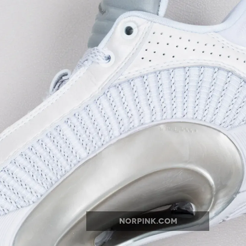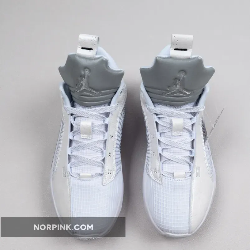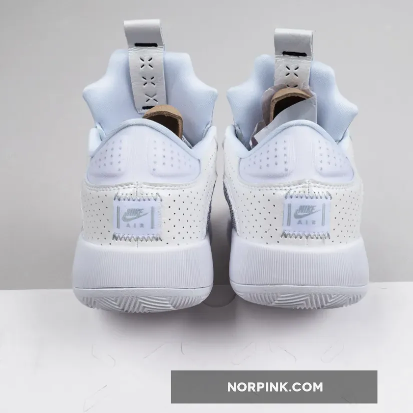 Dressed in a White and Metallic Silver color scheme. This low-top Air Jordan 35 features a White tumbled leather upper with mesh around the collar and 3M reflective tongues. Eclipse plates at the midfoot, “Nike Air” heel tags atop an all-White rubber sole completes the design.