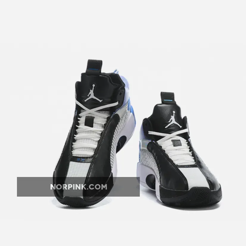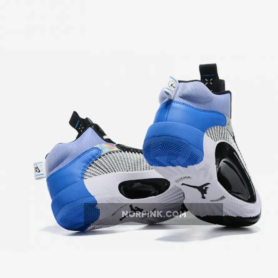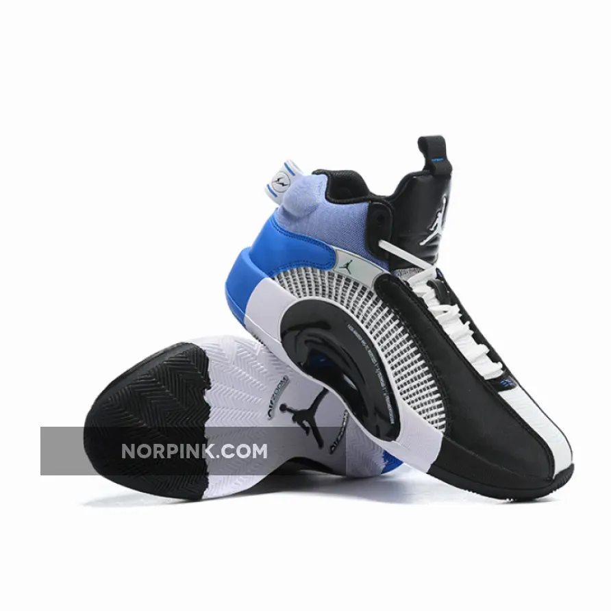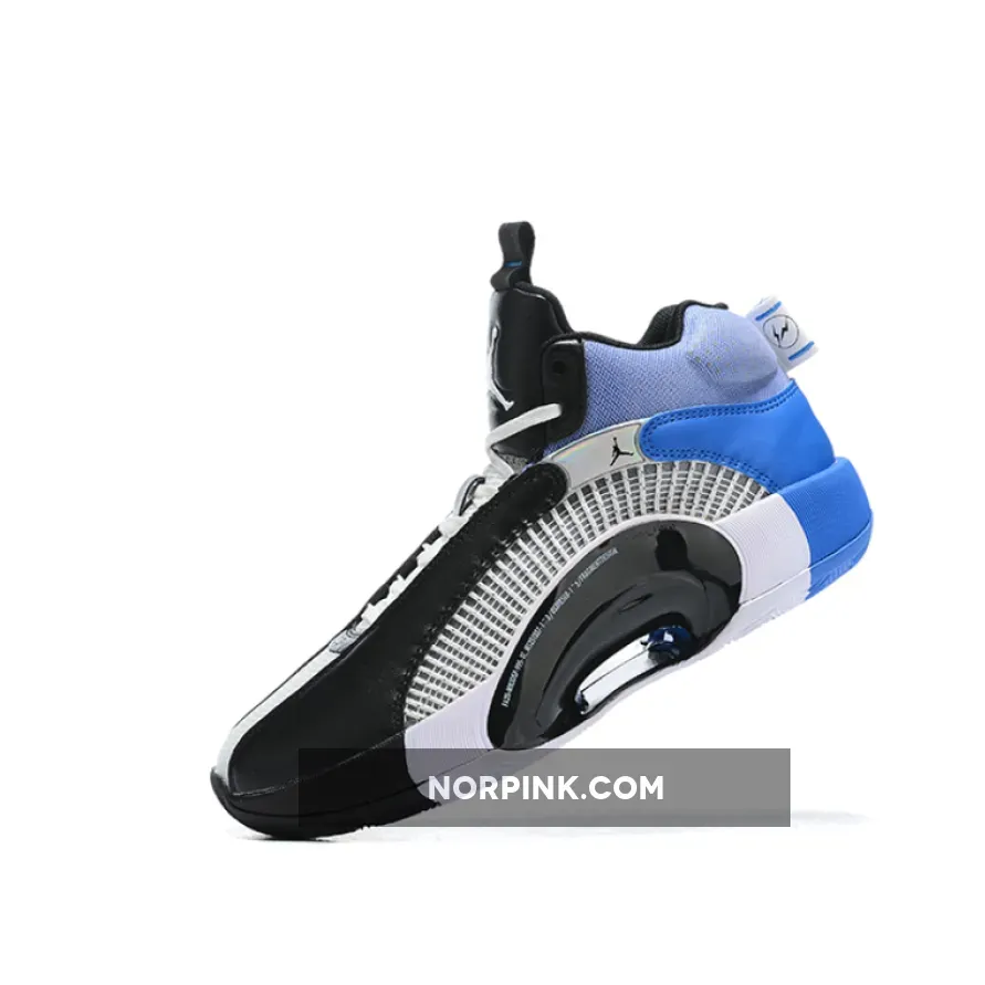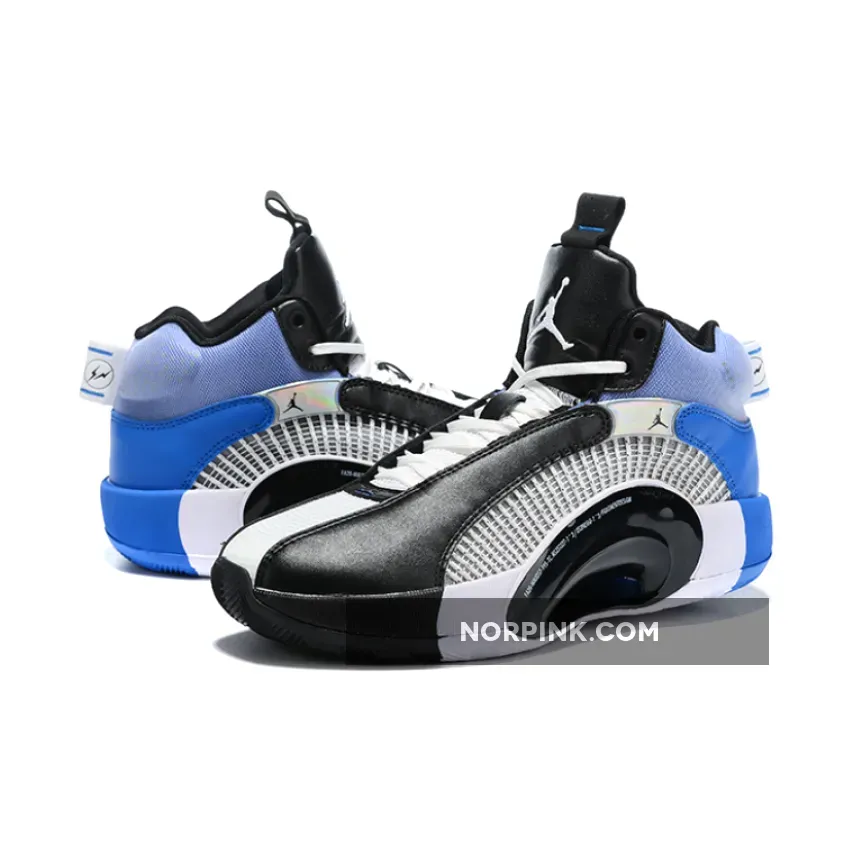 this Air Jordan XXXV by Fragment comes dressed in the brand’s traditional color blocking while utilizing White, Black and Blue throughout. In addition we have Fragment’s signature lightning bolt logos on the heel while XXXV is seen on the inside of the tongue.