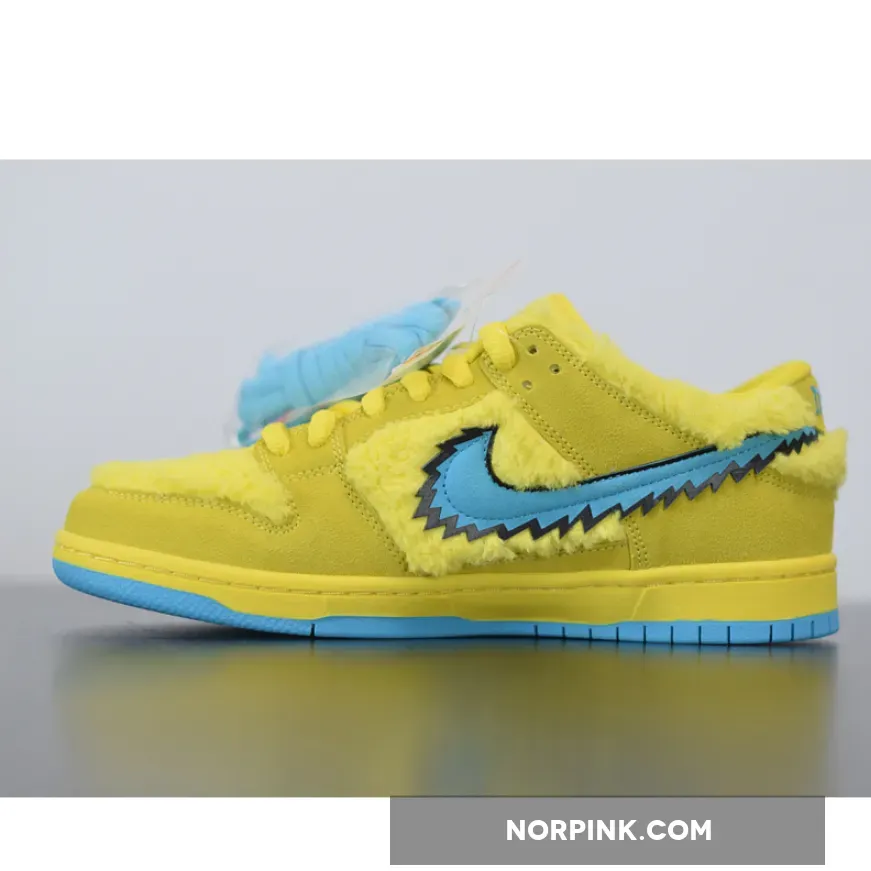 Developed in collaboration with the iconic San Francisco jam band, the Grateful Dead x Nike Dunk Low SB ‘Yellow Bear’ features a unique design inspired by the back cover of ‘History of the Grateful Dead, Volume One (Bear’s Choice),’ a live album originally released in 1973. A vibrant yellow finish is applied to the furry upper, fortified with tonal suede overlays and mounted atop a matching yellow foam midsole. Contrasting blue hits appear on the jagged Swoosh, rubber outsole and tongue, the latter furnished with a hidden stash pocket.