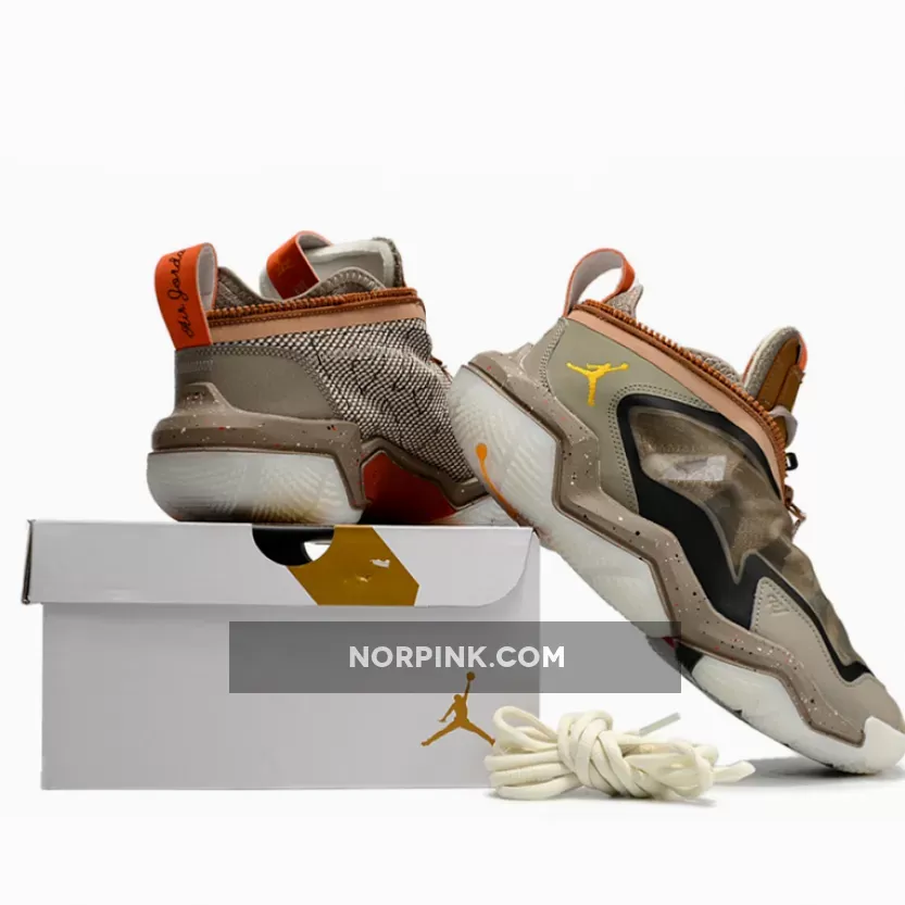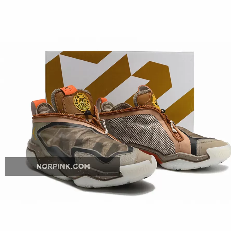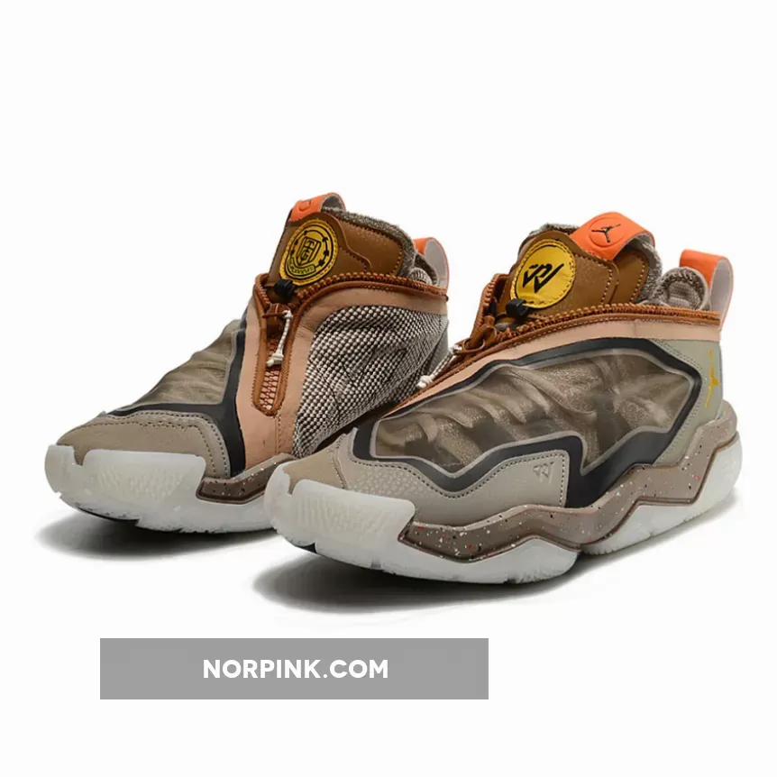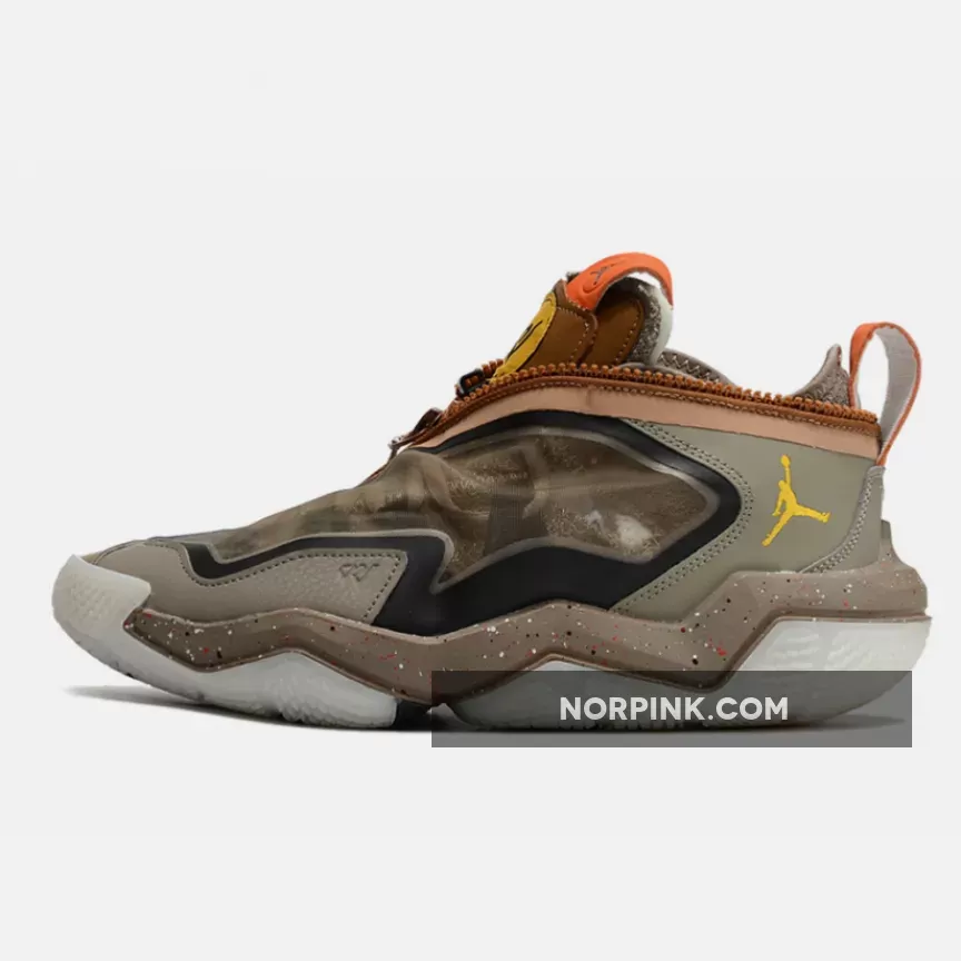 This Jordan Why Not .6 comes dressed in a Pecan, Yellow Ochre, Phantom, Campfire Orange, Moon Fossil, and Black color combination. throughout its mesh, leather, and suede construction. Further elevating this low-top offering is a signature semi-translucent zipper shroud, varsity-inspired branding on the tongues, and a patchwork design emblazoned on the insoles.