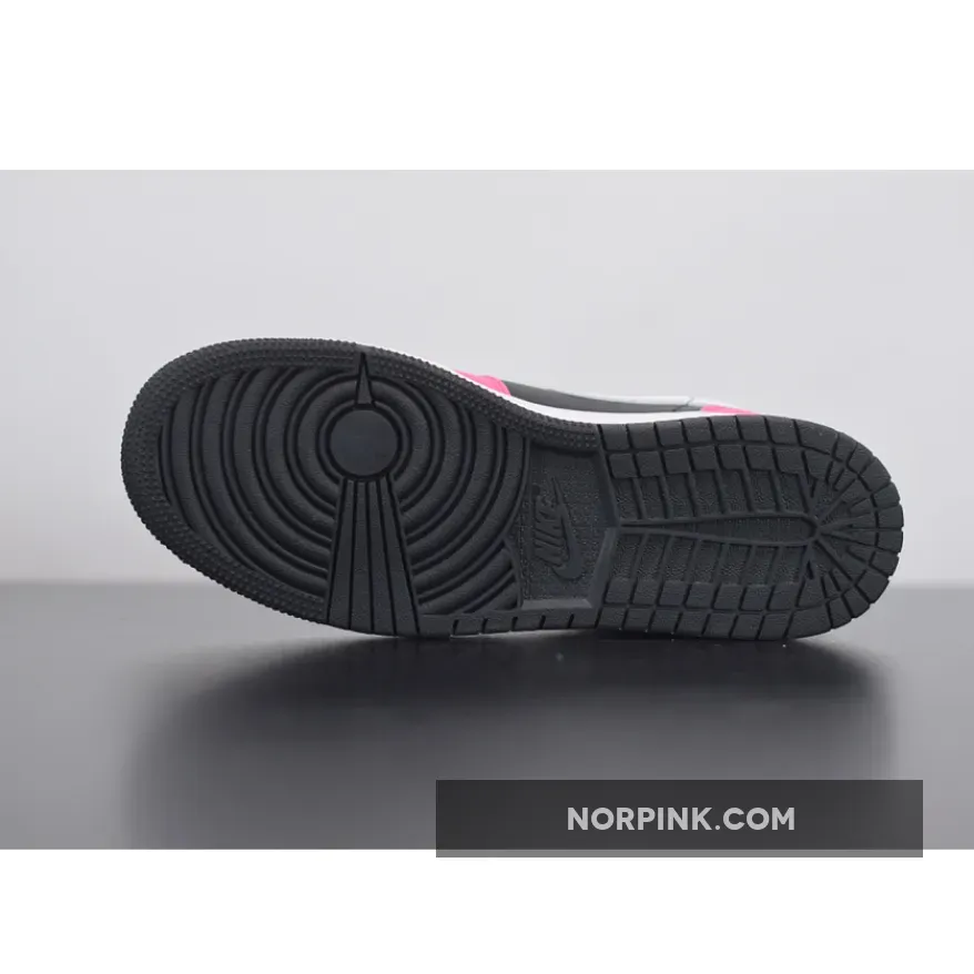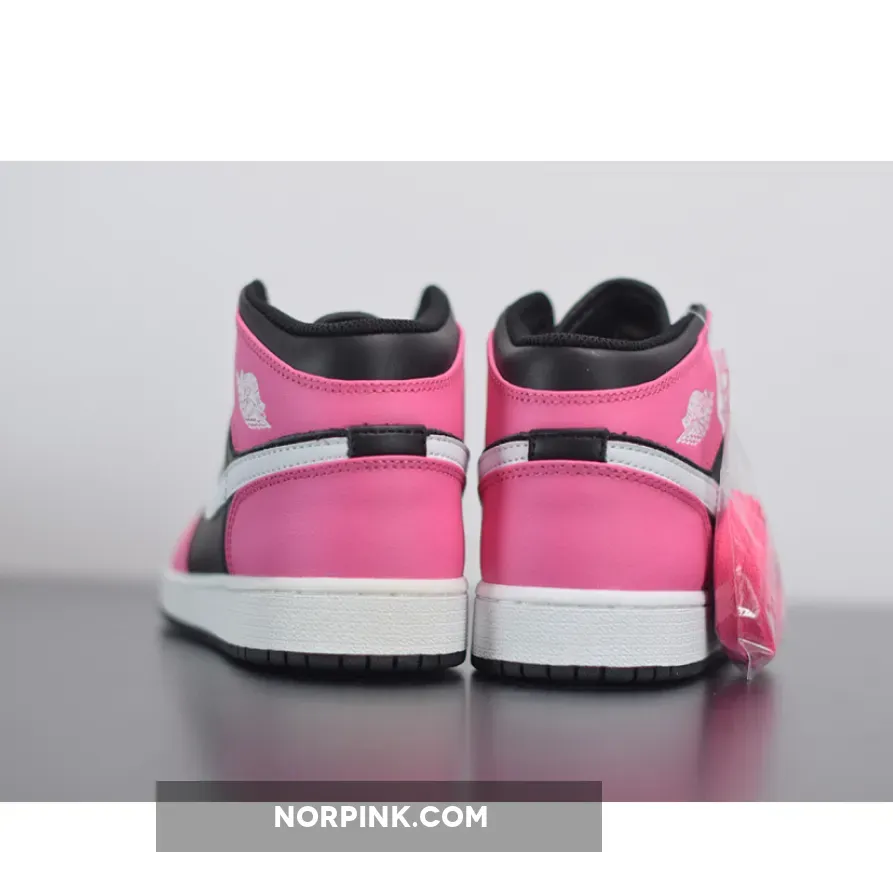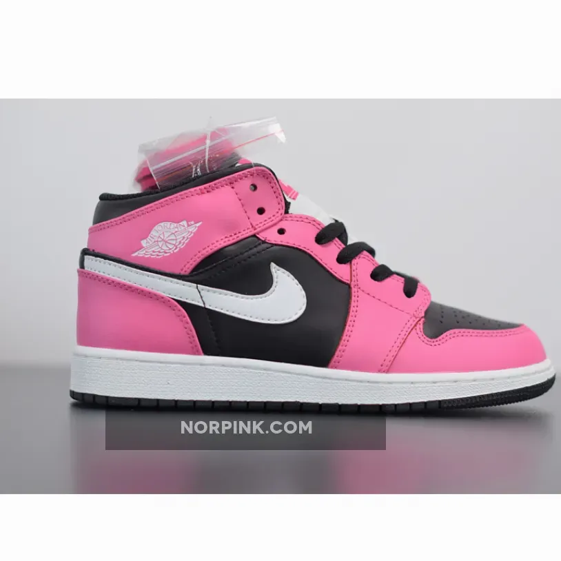 Dressed in a Black, White, and Pinksicle color scheme. This mid-top Air Jordan 1 features a Black leather base with Pink overlays paired with White Swooshes on the sides. A White midsole atop a Black rubber outsole completes the design.