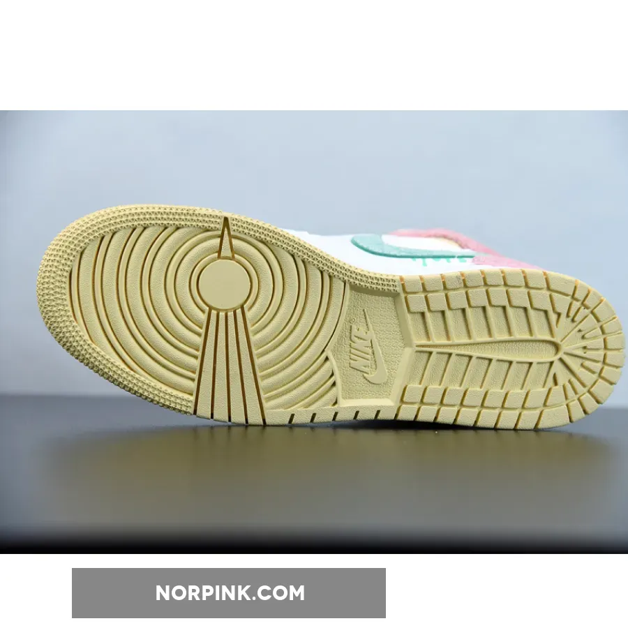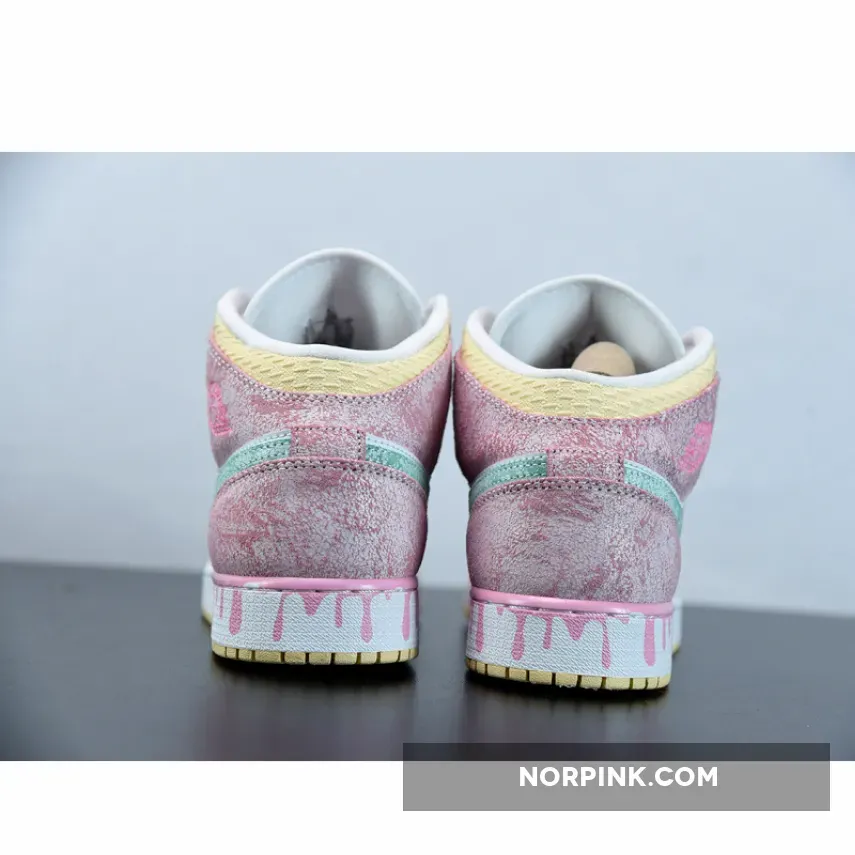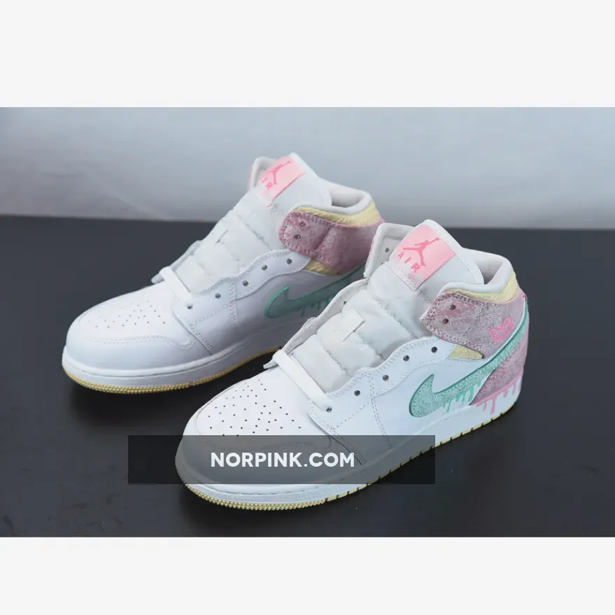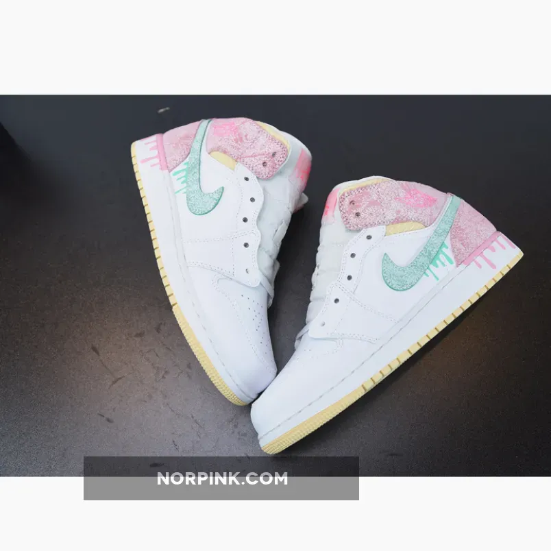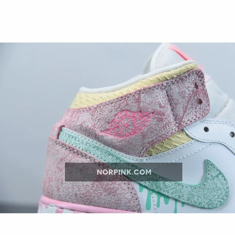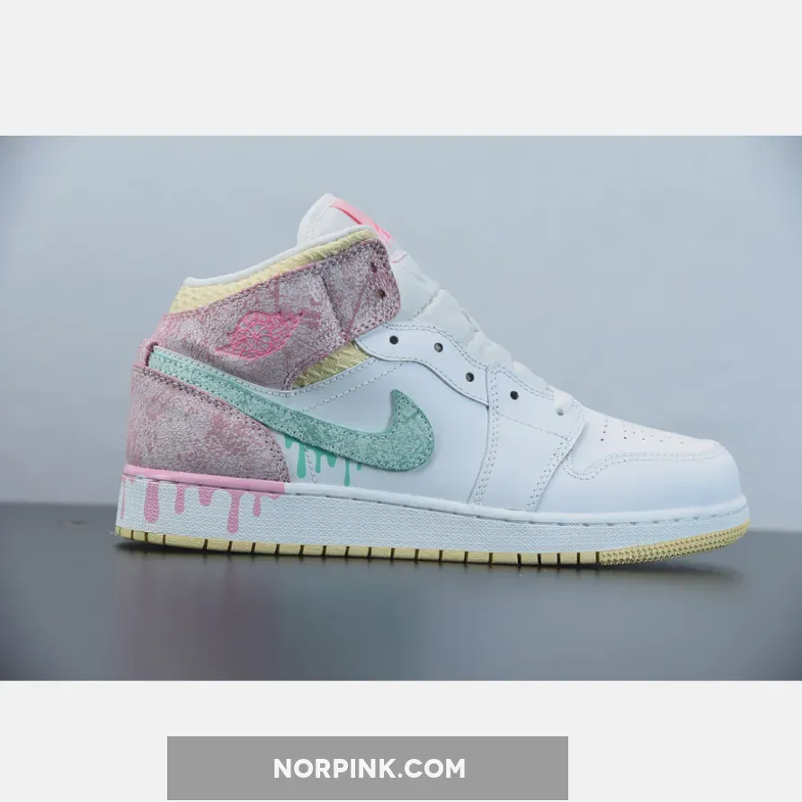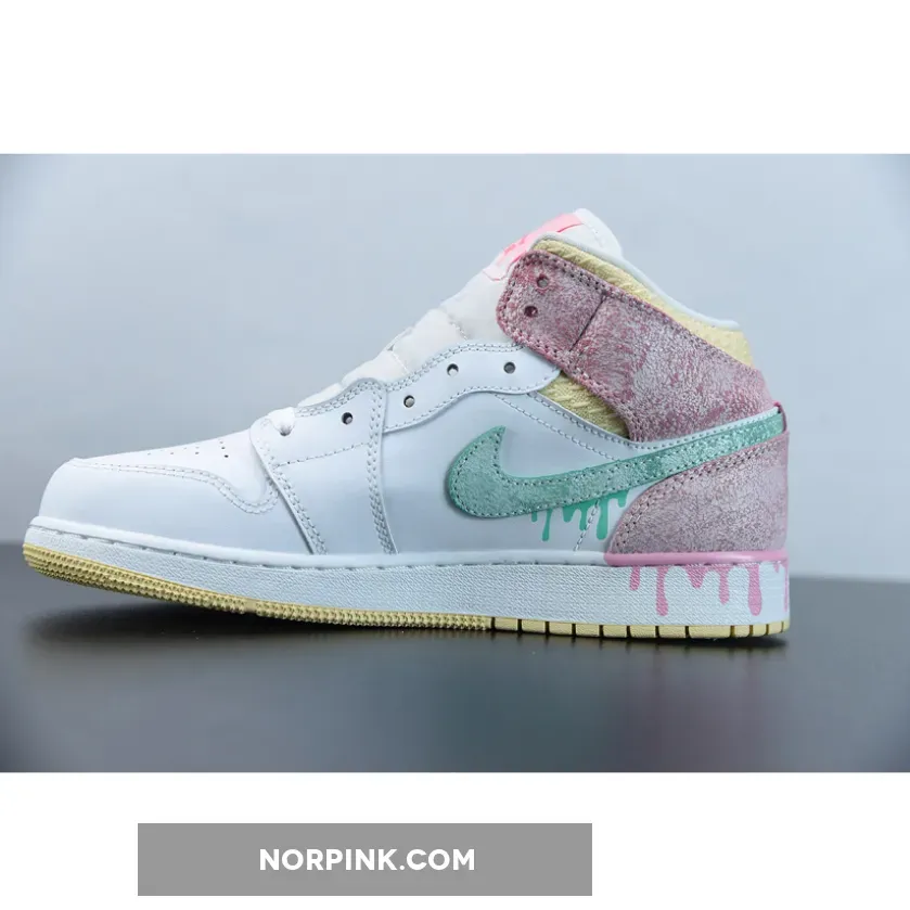 This edition of the Air Jordan 1 Mid features a White leather construction matching set of laces, tongues along with its signature perforated toe box. A Golden Yellow waffle knit collar, shades of Pink are used on the tongue label highlighted with paint drips on the Green textured Swooshes and Pink heels. A White midsole atop a Soft Yellow rubber outsole completes the design.