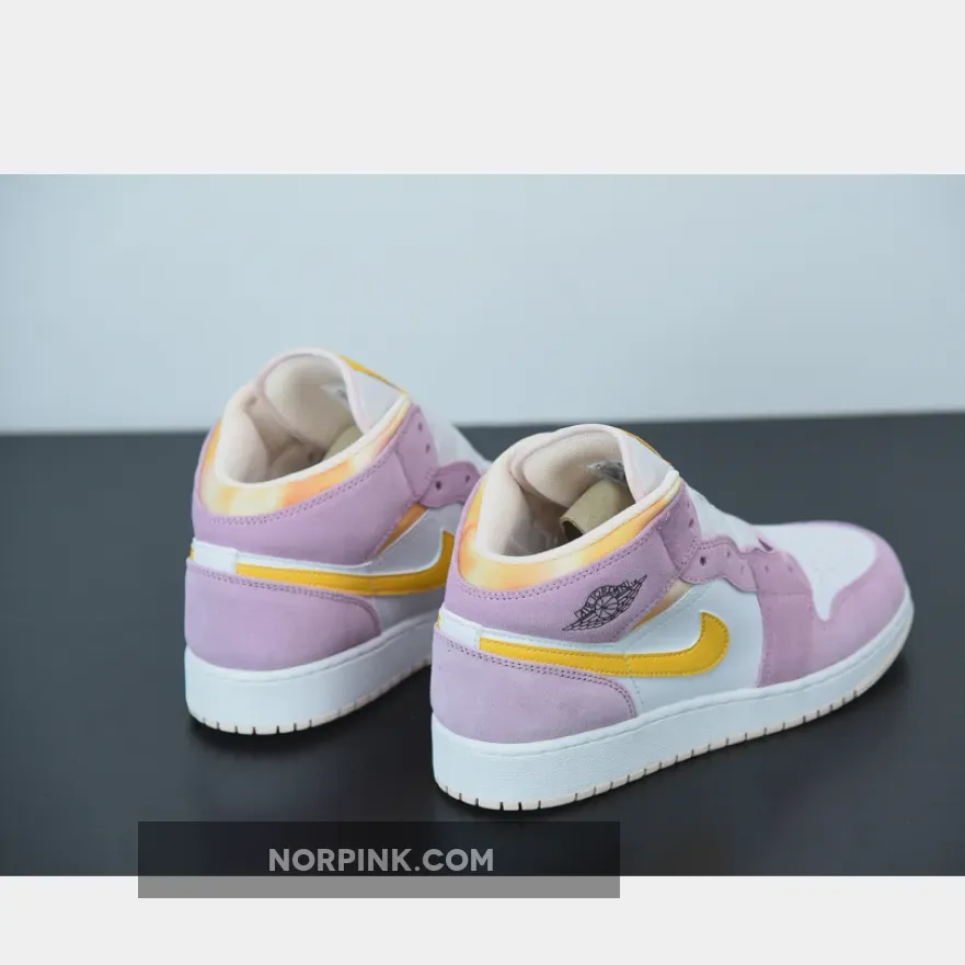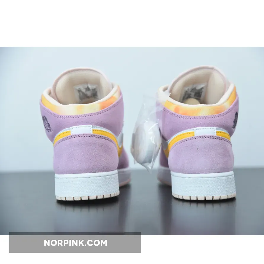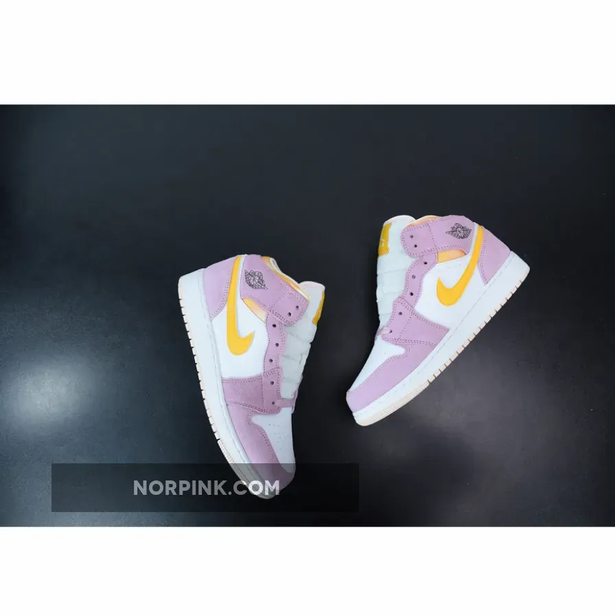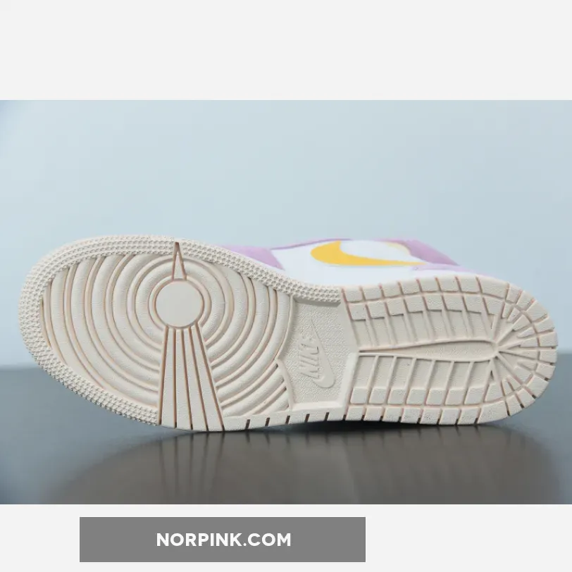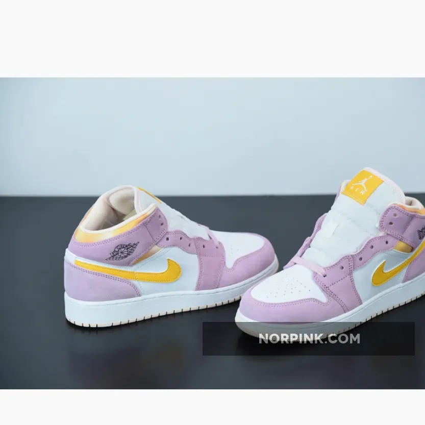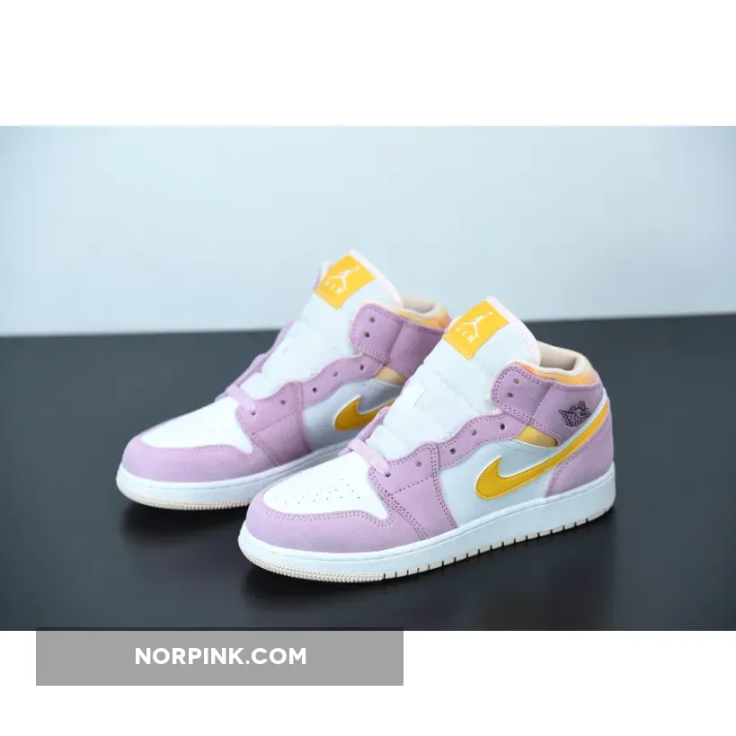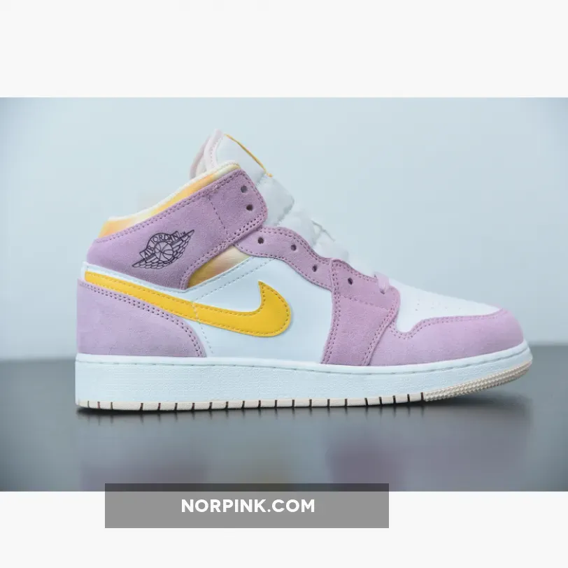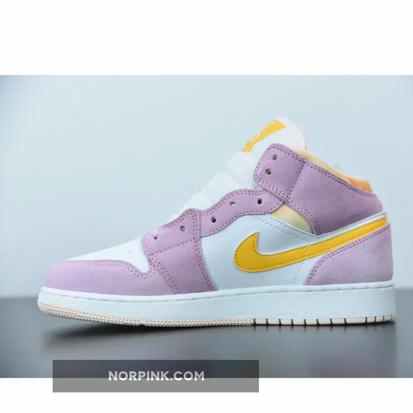 One of the most popular sneakers ever produced, the Air Jordan 1 has not rested on its laurels. The silhouette keeps rolling out interesting new colourways. Introducing the attractive mauve-toned Air Jordan 1 Mid SE GS Arctic Pink with pops of yellow. This smaller-sized AJ1 has a smooth leather base in “colourless” white. The overlays are in luxe suede in the mauvish titular Arctic Pink. This shoe could have stayed two-toned and still look great. However, it pushes the envelope with golden yellow profile Swooshes on both sides of the shoe, matching the tongue label. The collar underlays are also in yellow hues but in a watercolour wash finish. A white Jumpman stands out against the deep yellow of the tongue tab while a black Wings logo is embossed on the collar flap.
