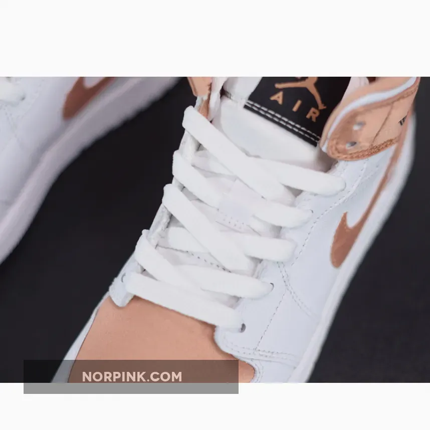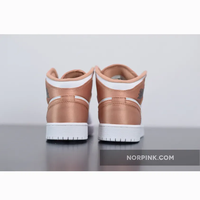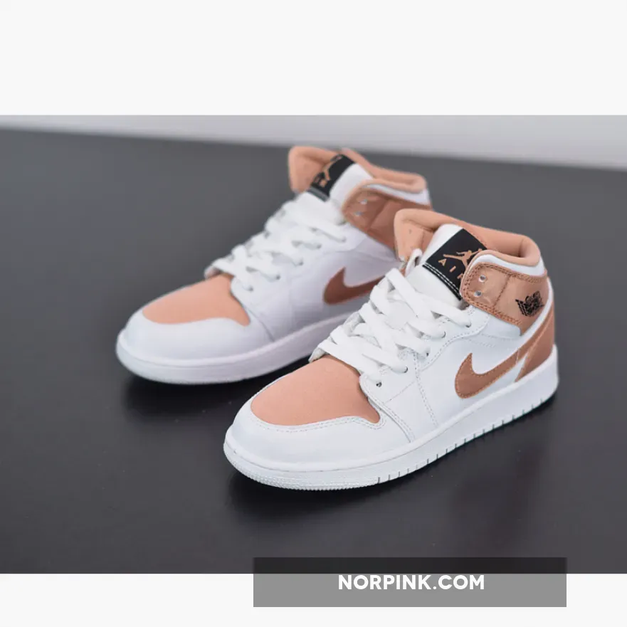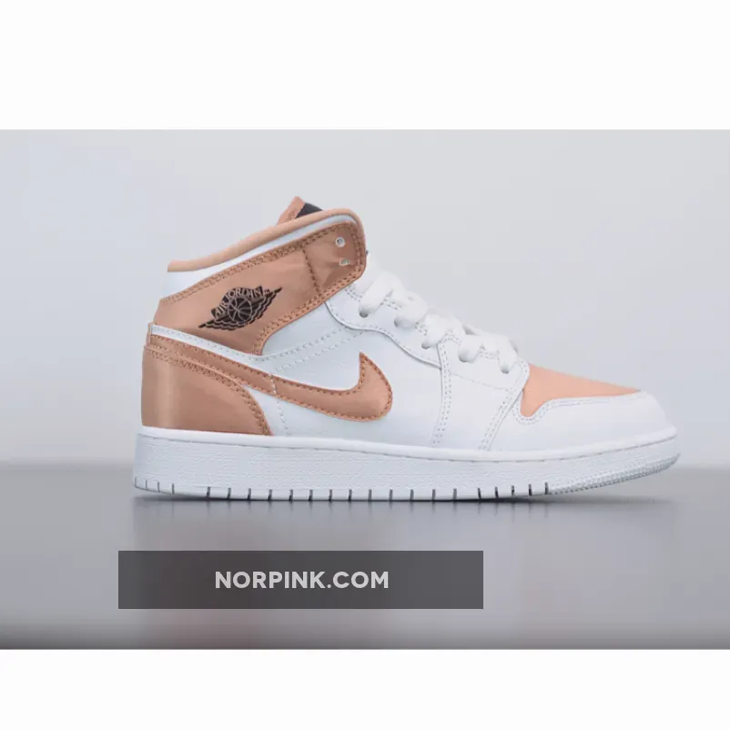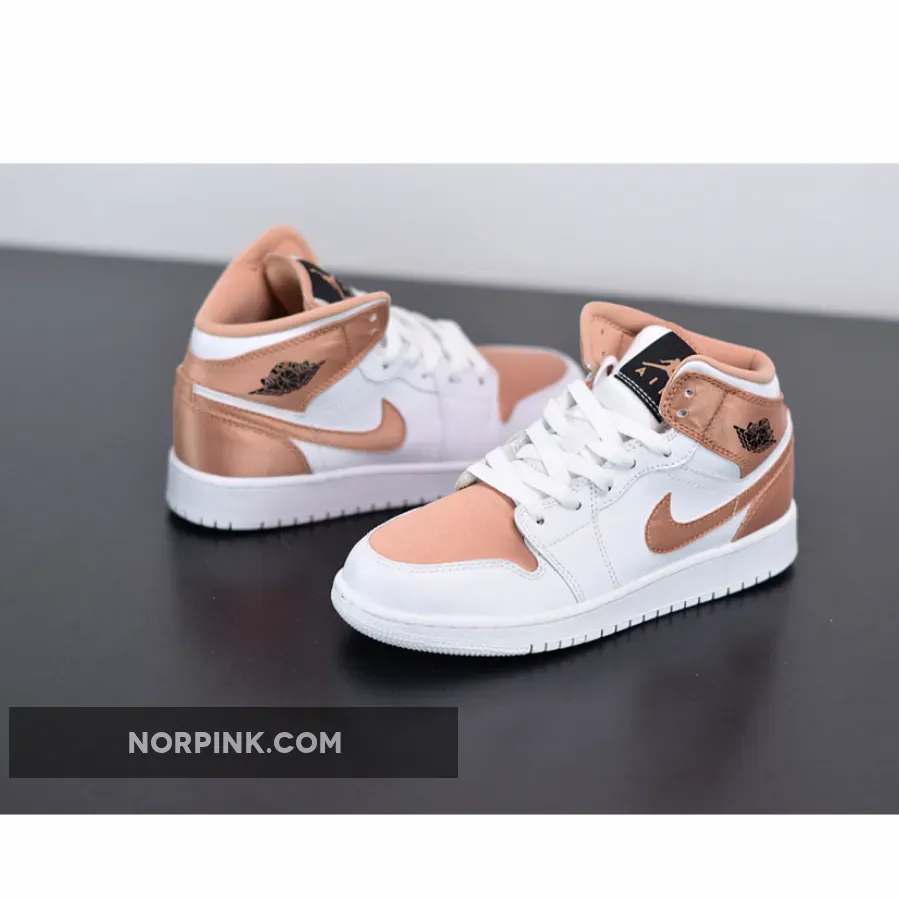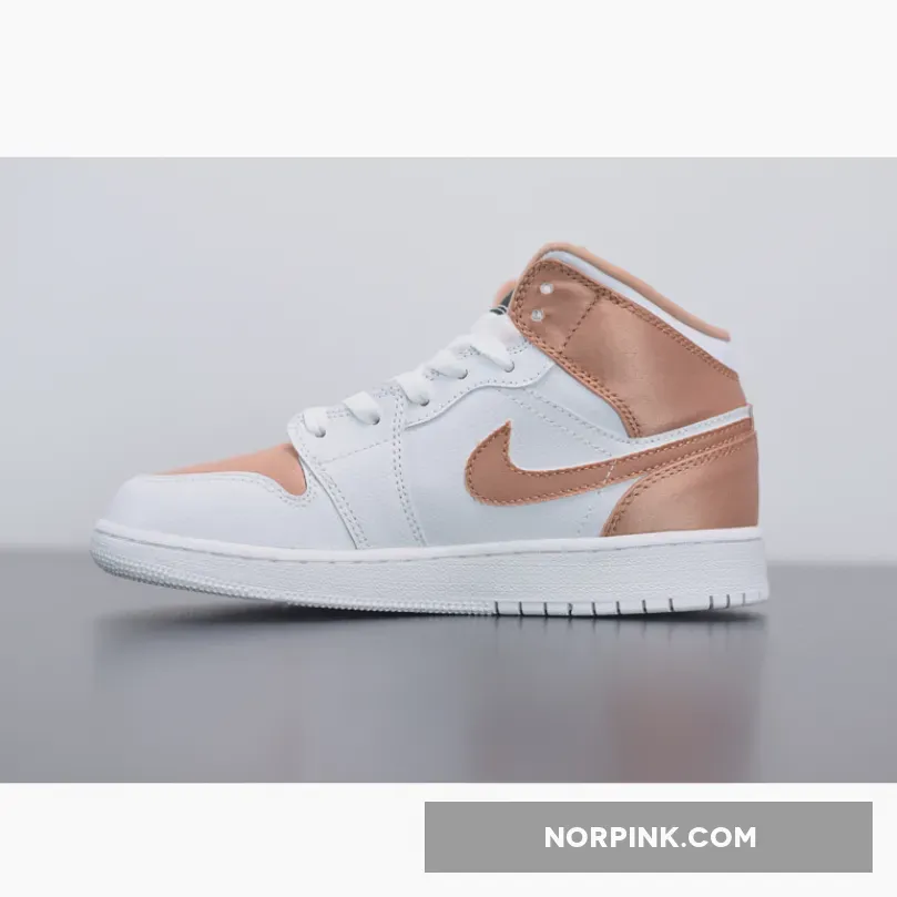 Smart & stylish, the Air Jordan 1 Mid GS White Rose Gold offers a premium look with rose gold accents & classic design elements. Perfect for kids on the go! #sneakerhead #NikeAir #AJ1MidGS