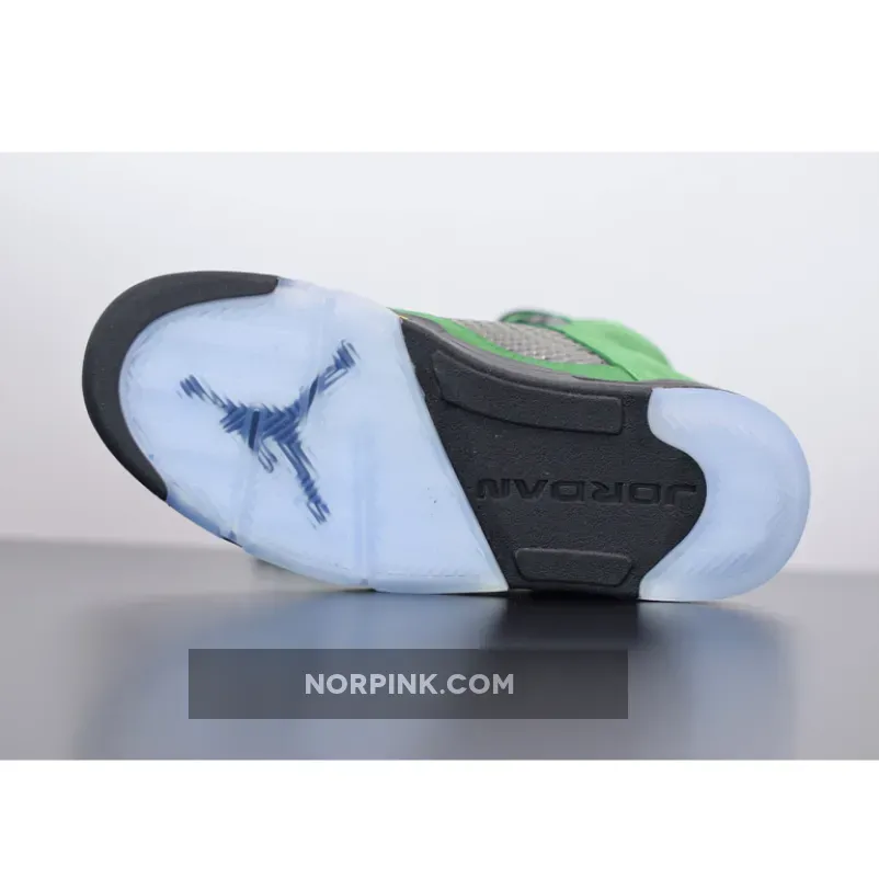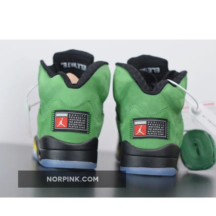 Dressed in a mix of Apple Green, Black, Yellow Strike, and Black. This Air Jordan 5 looks similar to the player exclusive version, but with a Jumpman logo on the tongues and Jordan team jock tab in the rear replacing its official school logos. Other details includes a reflective tongue, “Elevate” sewn onto the inner tongue atop an icy outsole.