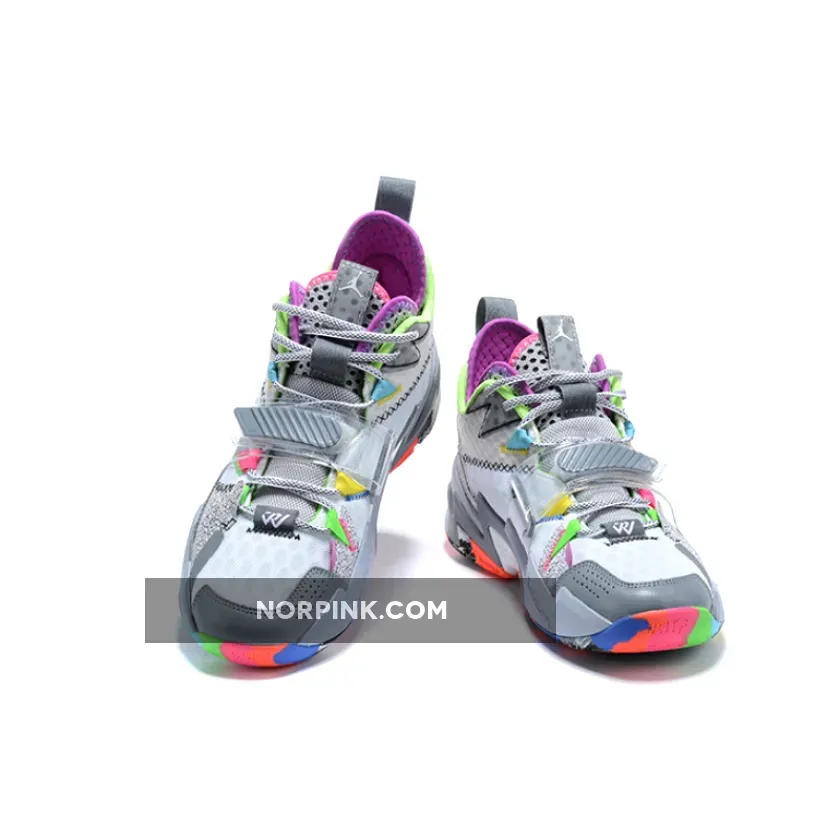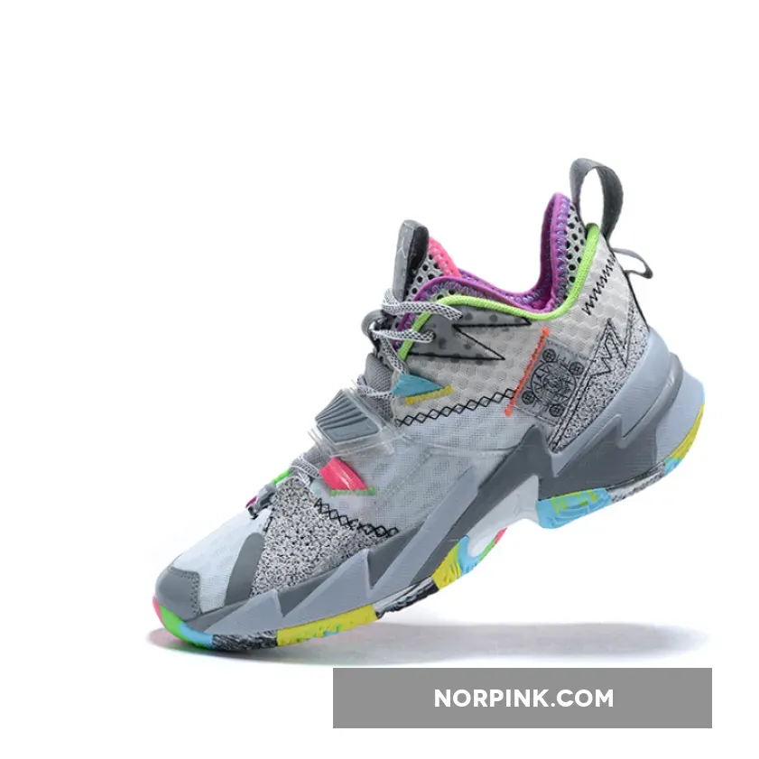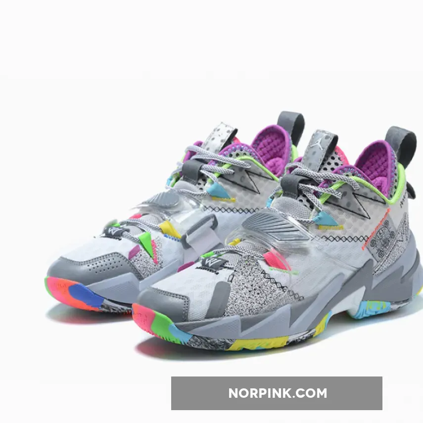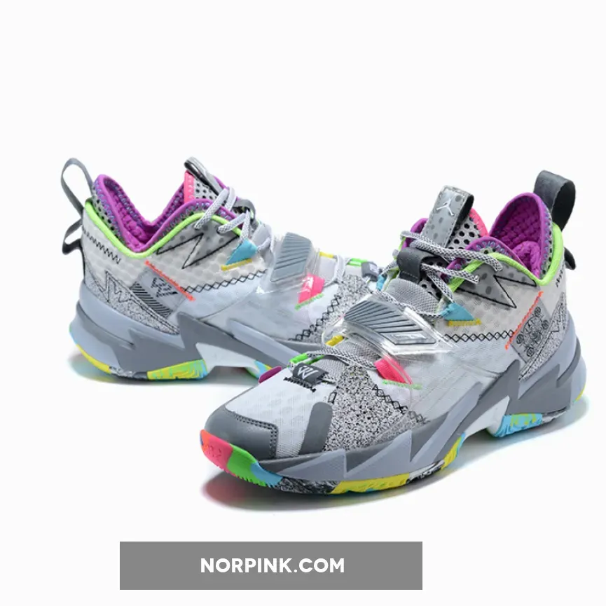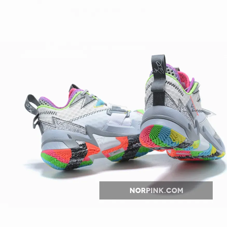 One of the upcoming offerings is this grade school iteration that comes dressed in White, Cool Grey, and Wolf Grey color scheme. This Why Not Zer0.3 features a White mesh upper paired with vibrant contrasting accents as well as exposed stitching, clear midfoot strap, two-tone Grey midsole atop a very colorful rubber outsole.