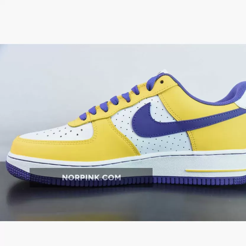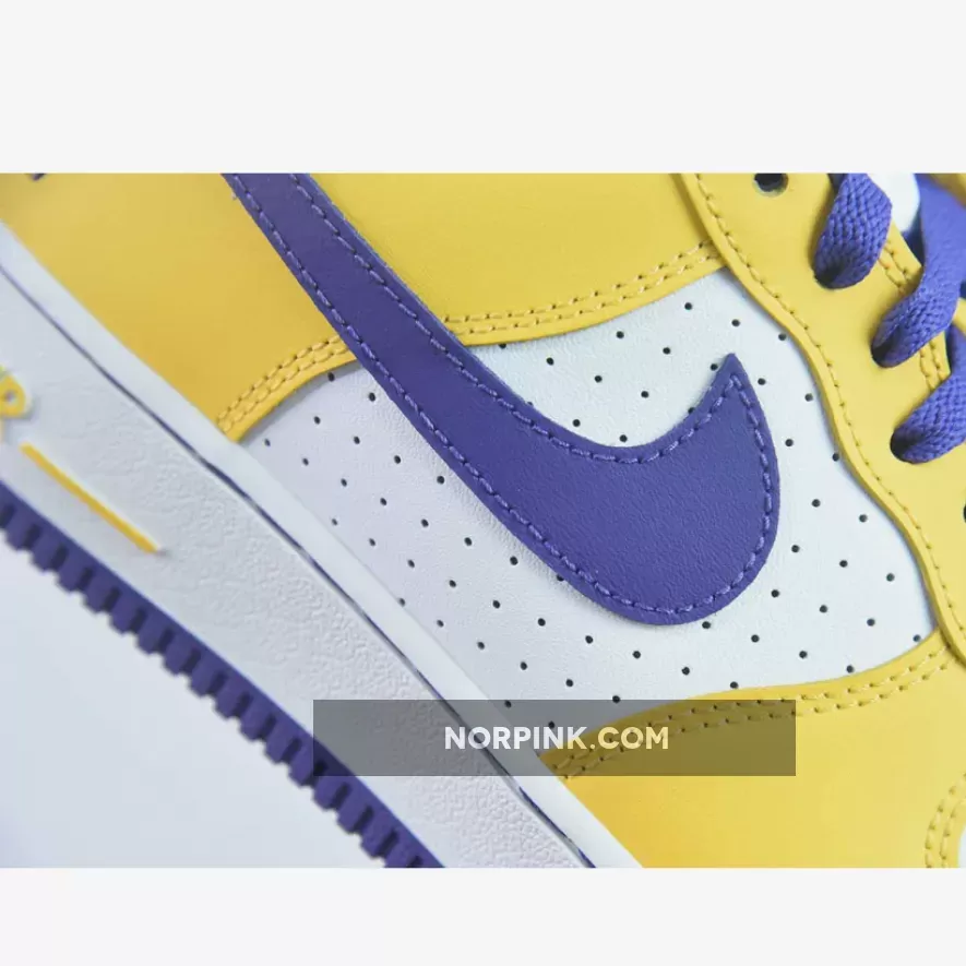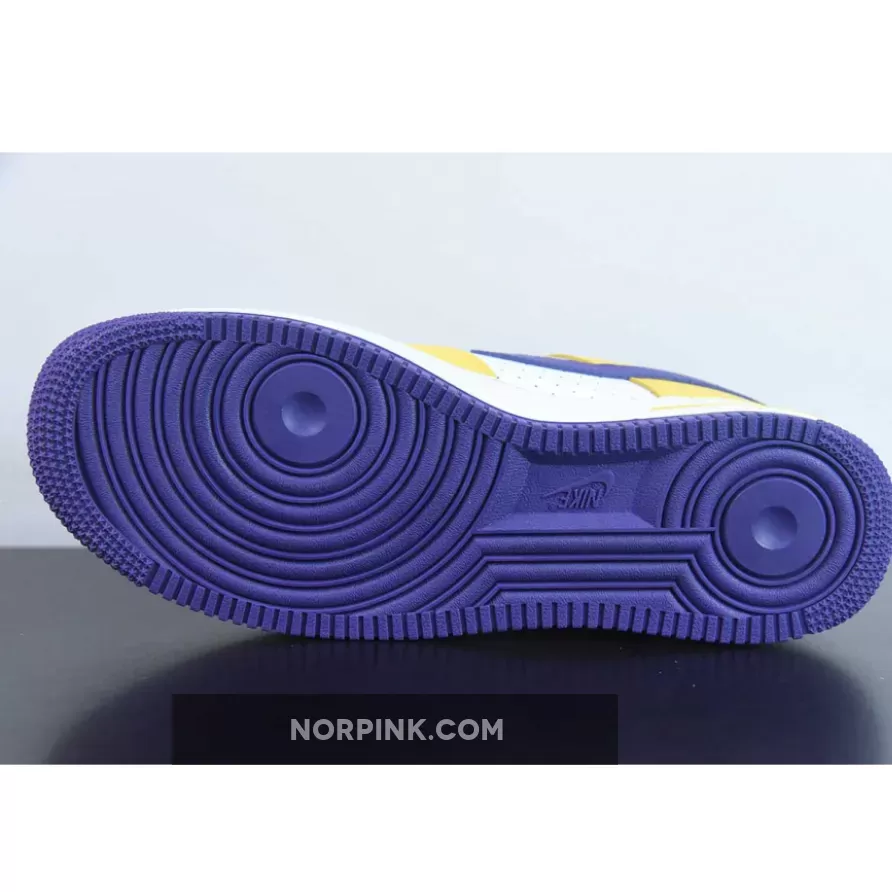 The Kobe Bryant x Nike Air Force 1 Low comes dressed in a White, Varsity Maize, and Varsity Purple color scheme.