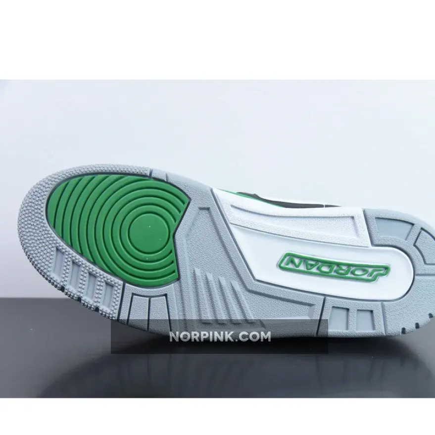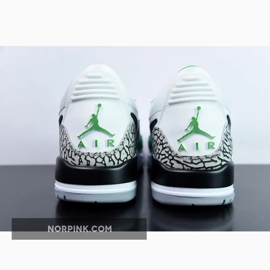 the pair embarks on a lightened take on the iconic color blocking, exercising crisp white leather uppers contrasted in seldom along the jet-black Swoosh and heel mudguard.and the vibrant green accents consume the sock liner, tongue trim, mid-foot overlay and branding atop the forefoot strap and Jumpman affixed to the heel for an illuminated finish.