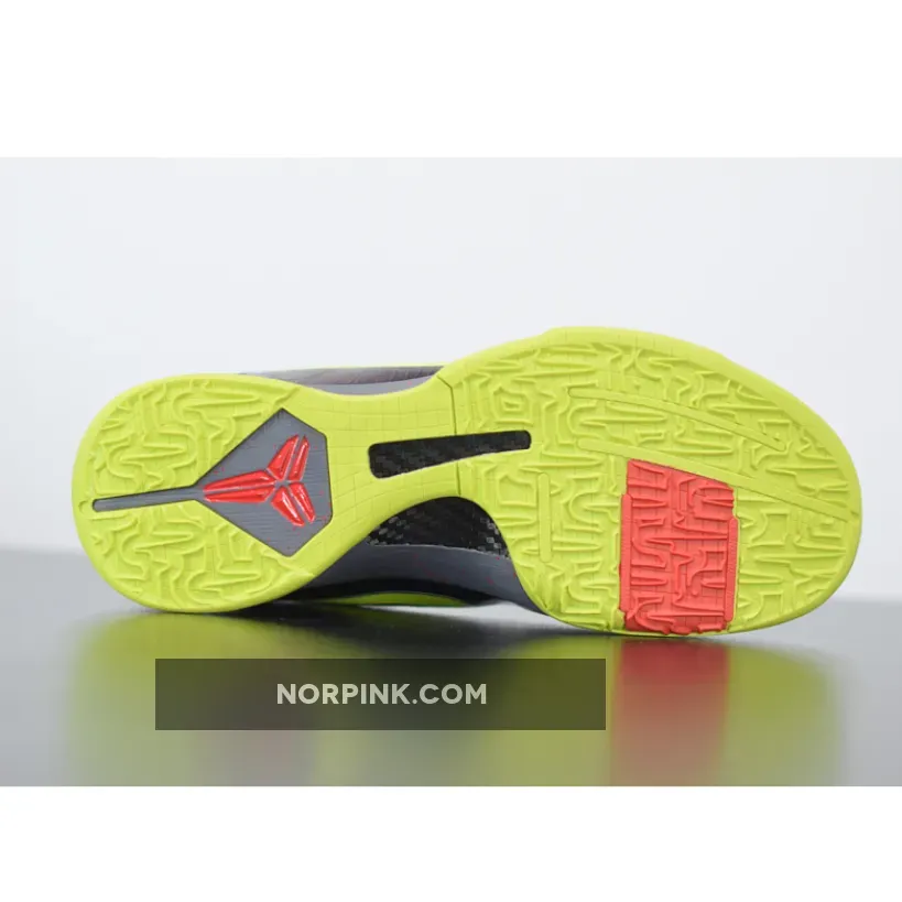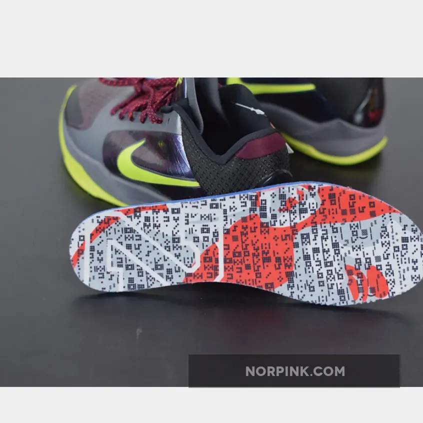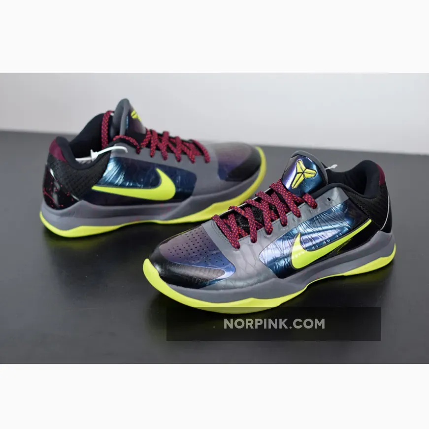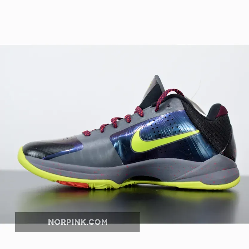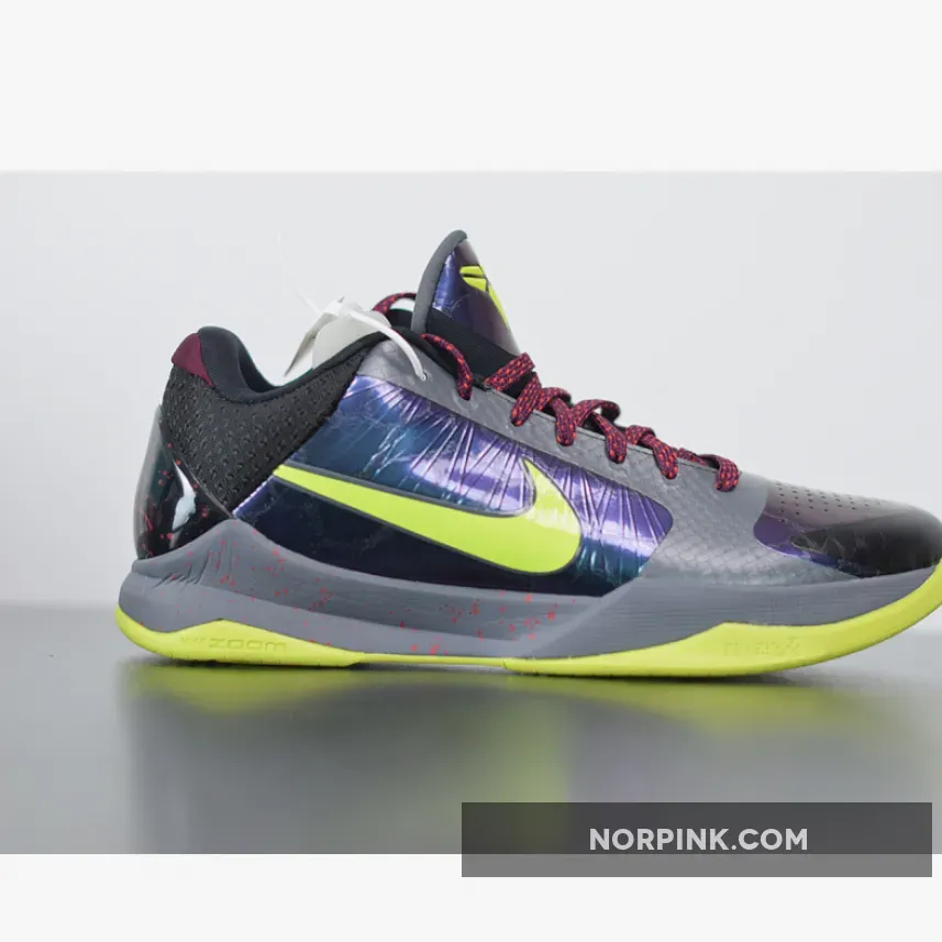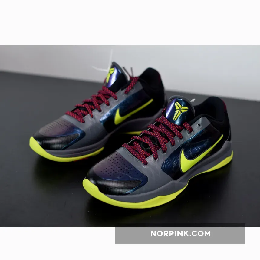 This rendition of the “Chaos” Kobe 5 Protro comes dressed in the same Joker-themed colors with iridescent panels and replaces the White overlays with a Charcoal snakeskin fabric. A darker shade of Grey is also added to its midsole, which is different from the original.