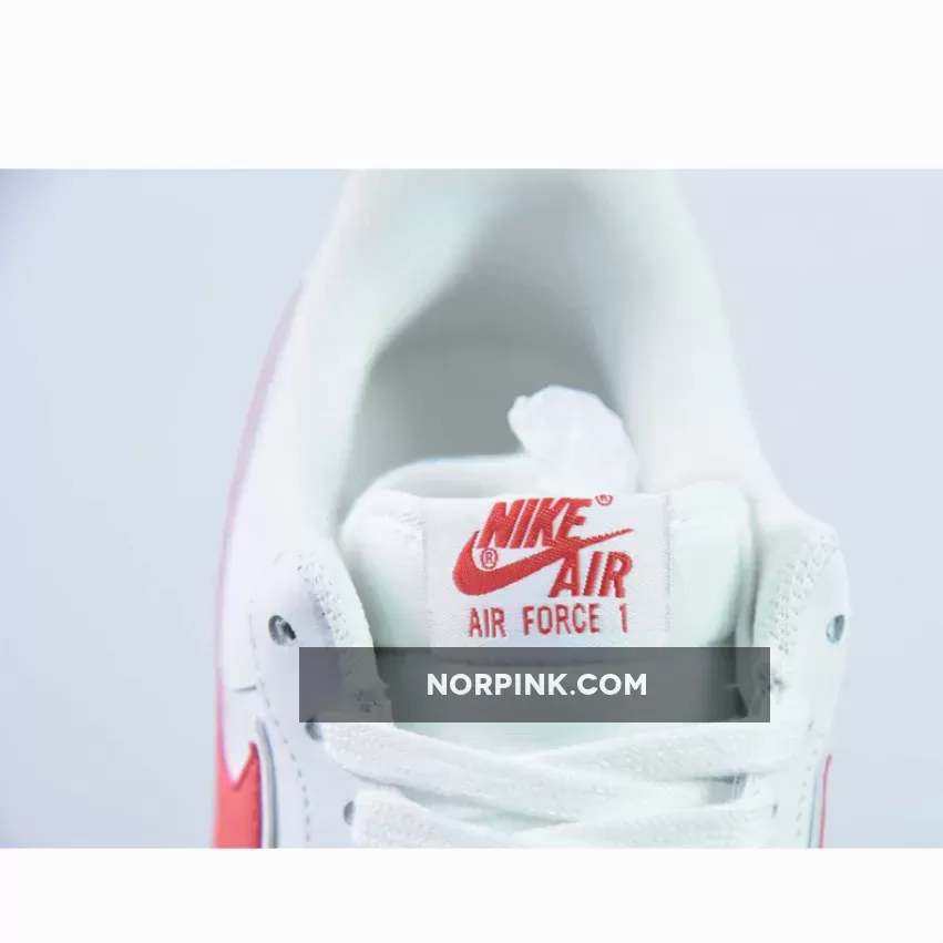 The Nike Air Force 1 Low White Gym Red has a clean white leather upper and chunky rubber midsole with red highlights on the Swoosh and a single line running across the heel. The red also appears on the Nike Air label located on the tongue as well as the ‘NIKE’ label above the heel.
