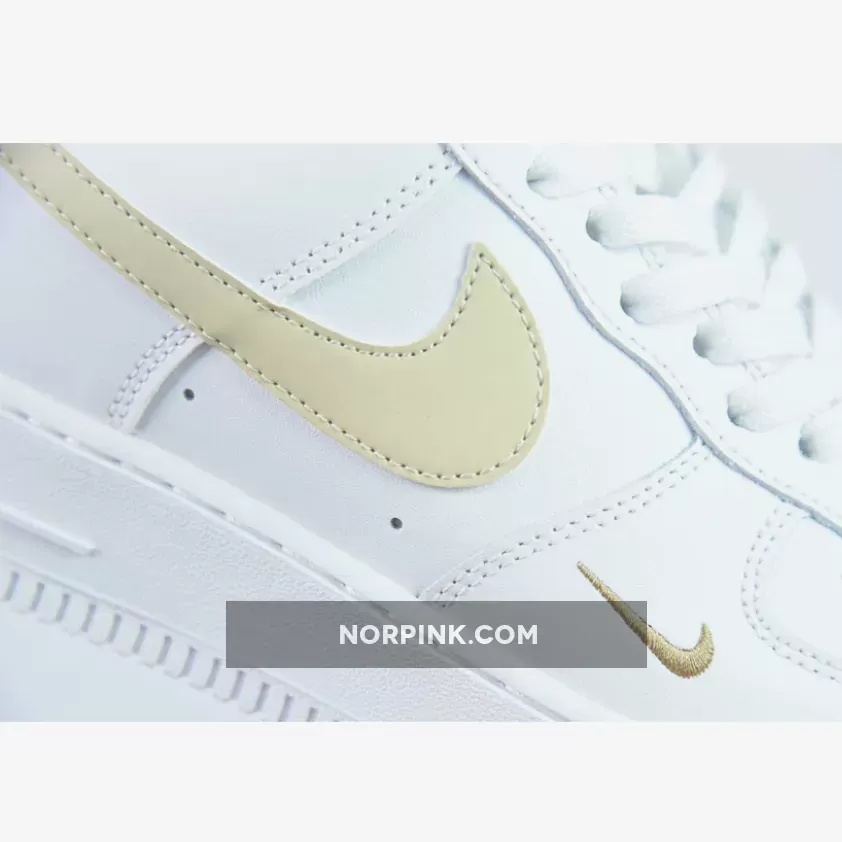 Starting off as a clean all-white Air Force 1, the sneaker features a pristine smooth leather construction all over the upper with contrasting Rattan detailing placed on the Swooshes, heel tabs, insoles, and tongue tags. Continuing the premium aesthetic is the addition of Metallic Gold on the lace dubraes, tongue and heel branding, and the embroidered mini Swoosh on the lateral midfoot.