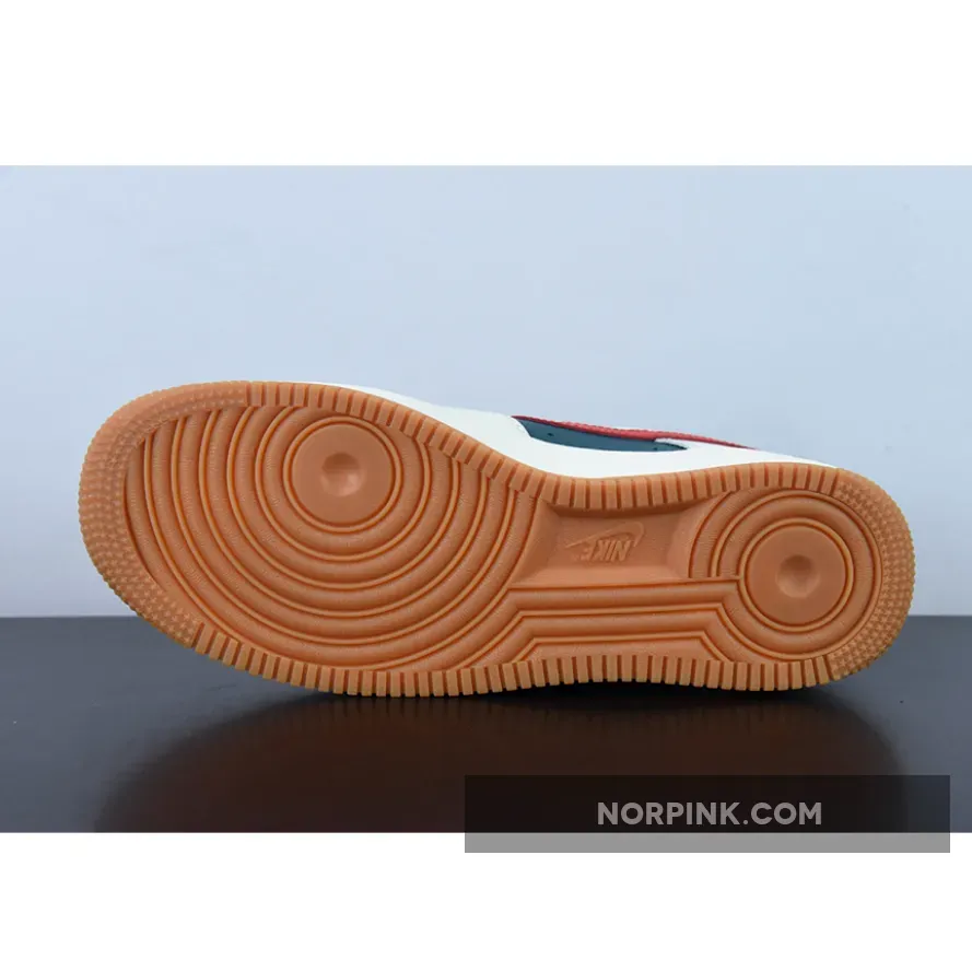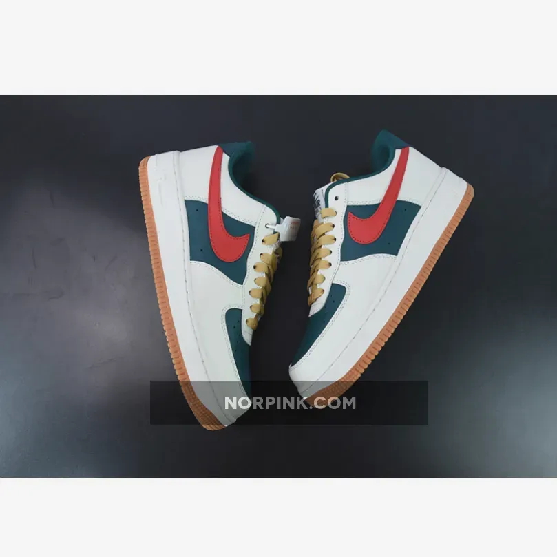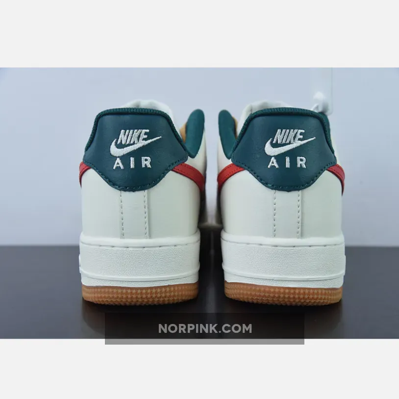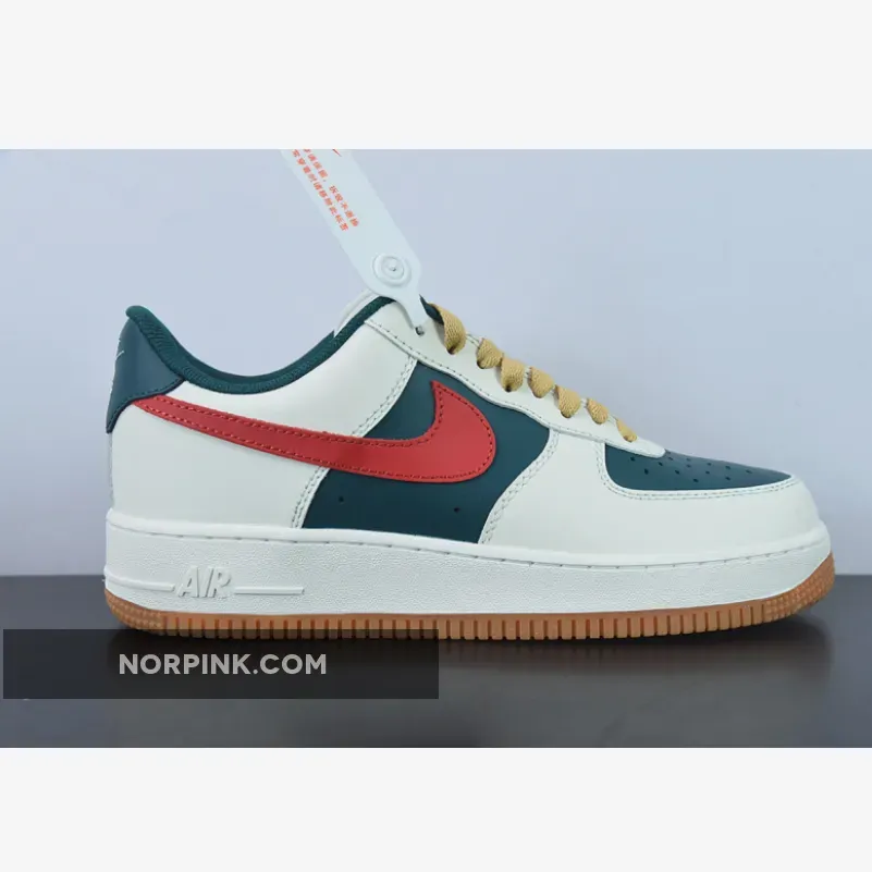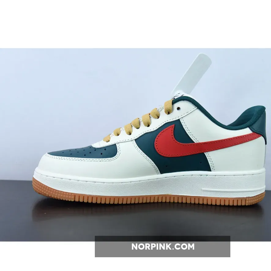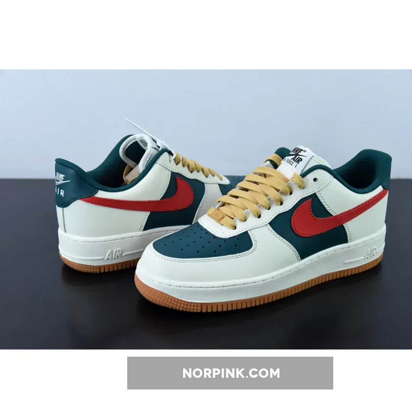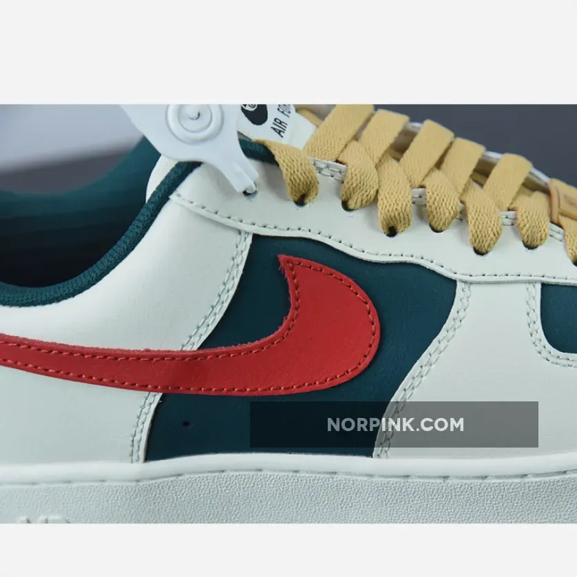 Constructed out of leather all throughout the upper, the legendary Uptown starts off with a dark green hue on the base of the upper which is then contrasted by Sail/Cream on the overlays. For some more contrast we have bold red Swooshes on the side panels as well as wheat colored laces. Black Nike branding on the tongues, white branding on the insoles and heels, a Sail rubber midsole, and gum rubber outsoles finish off the look on this Nike Air Force 1 Low.