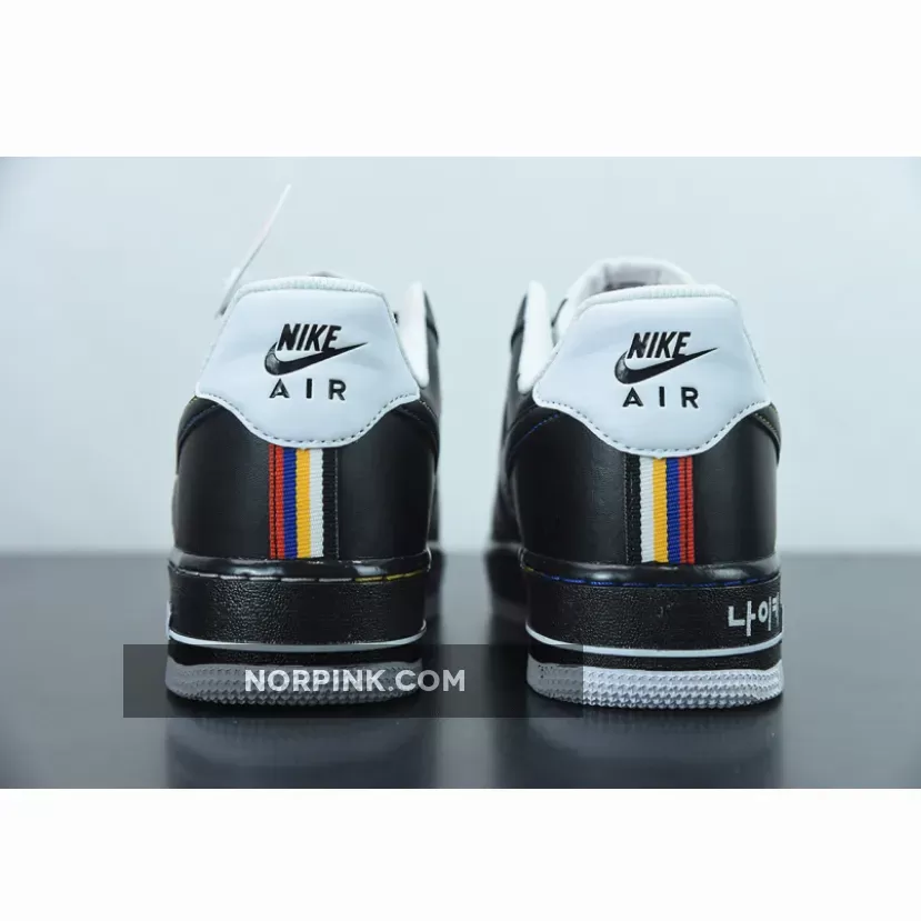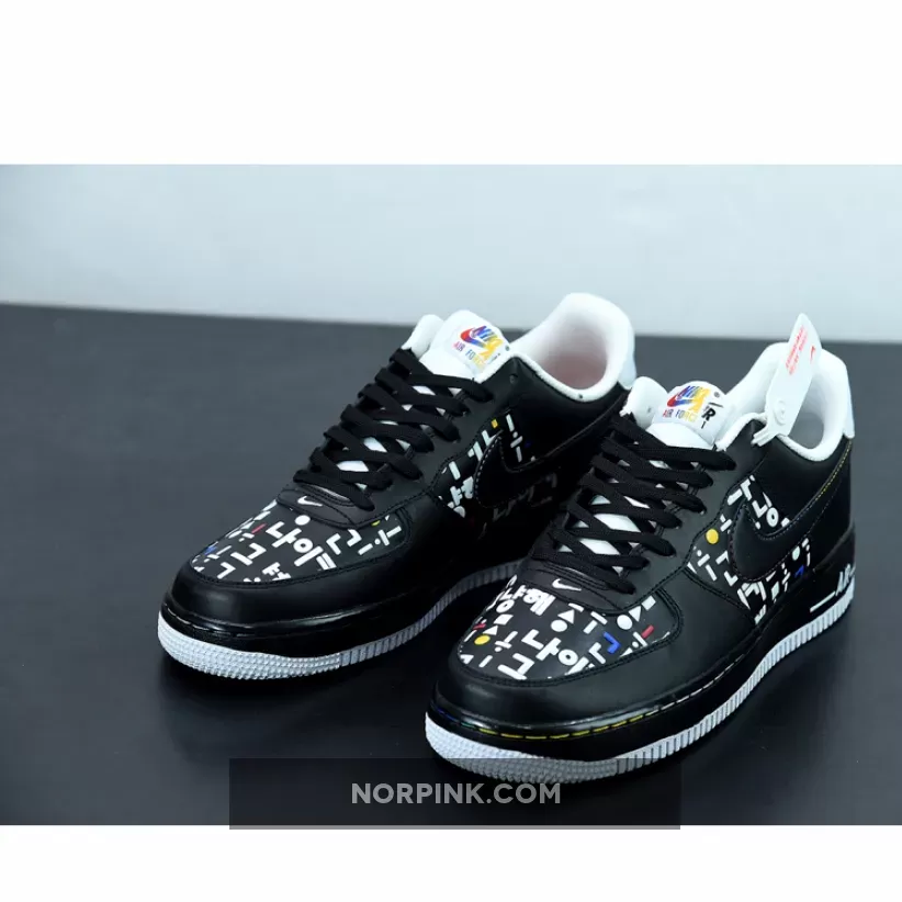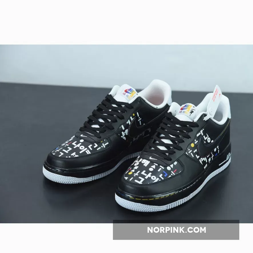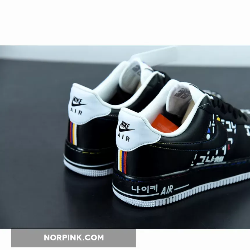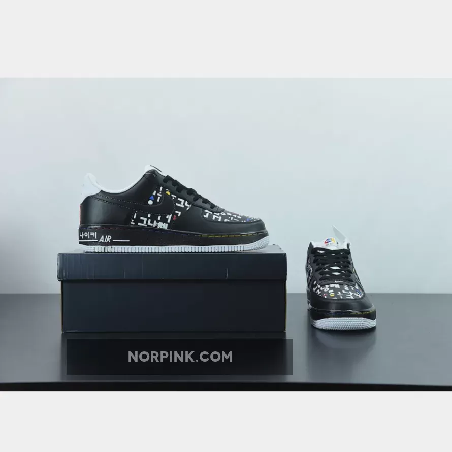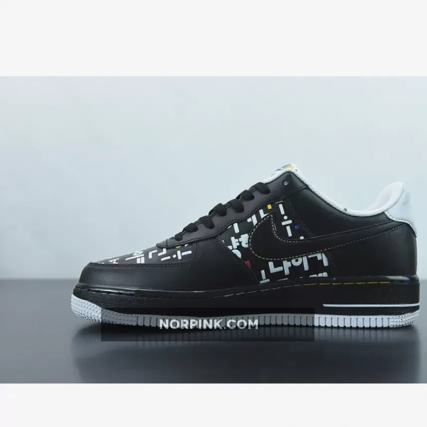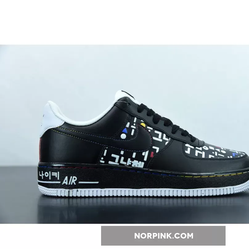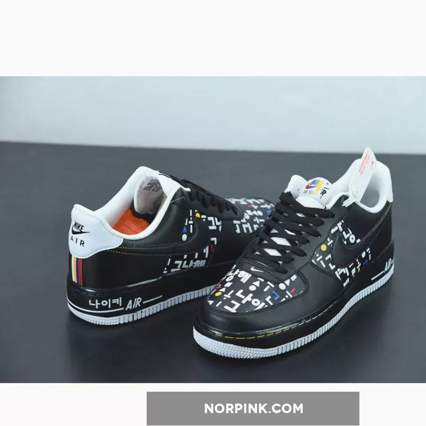 This offering of the Nike Air Force 1 Low features a graphic upper made of Korean consonants and vowels is in harmony with the simple color Swoosh, and the shape that expresses the way the mouth moves when pronouncing characters is added to complete the design of the Black upper. A matching Black midsole atop a clean White rubber outsole completes the design.