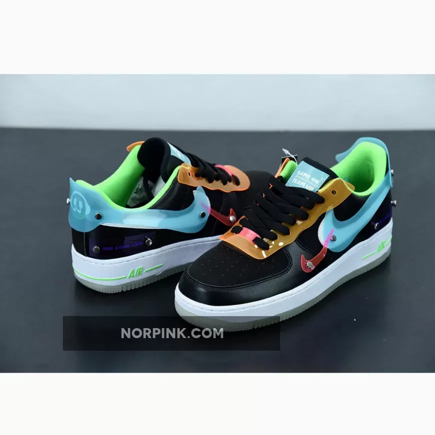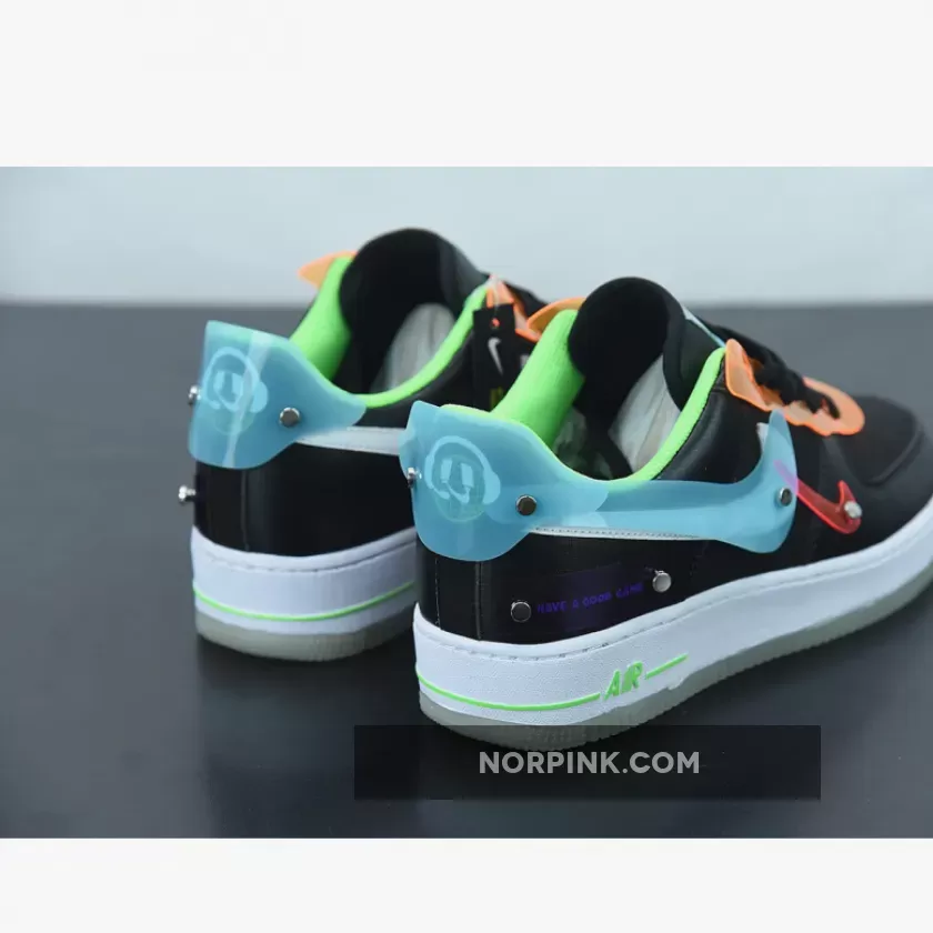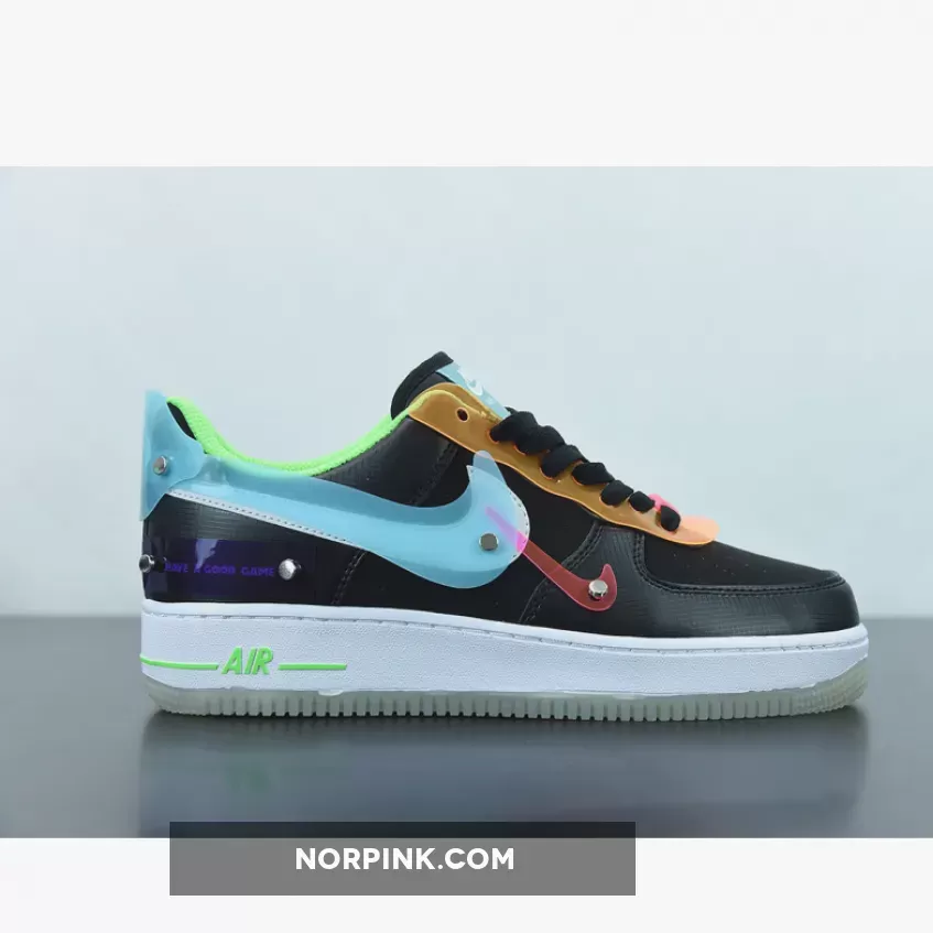 The Nike Air Force 1 Low Have A Good Game Black joins Nike Sportswear’s “Have A Good Game” capsule, featuring a futuristic gamer look. A black synthetic leather forms the base of the upper mixed in with colourful vinyl overlays. The lace guards are a bright orange, the profile Swooshes are white leather overlaid with baby blue vinyl, and there’s also a mini Swoosh in bright pink.